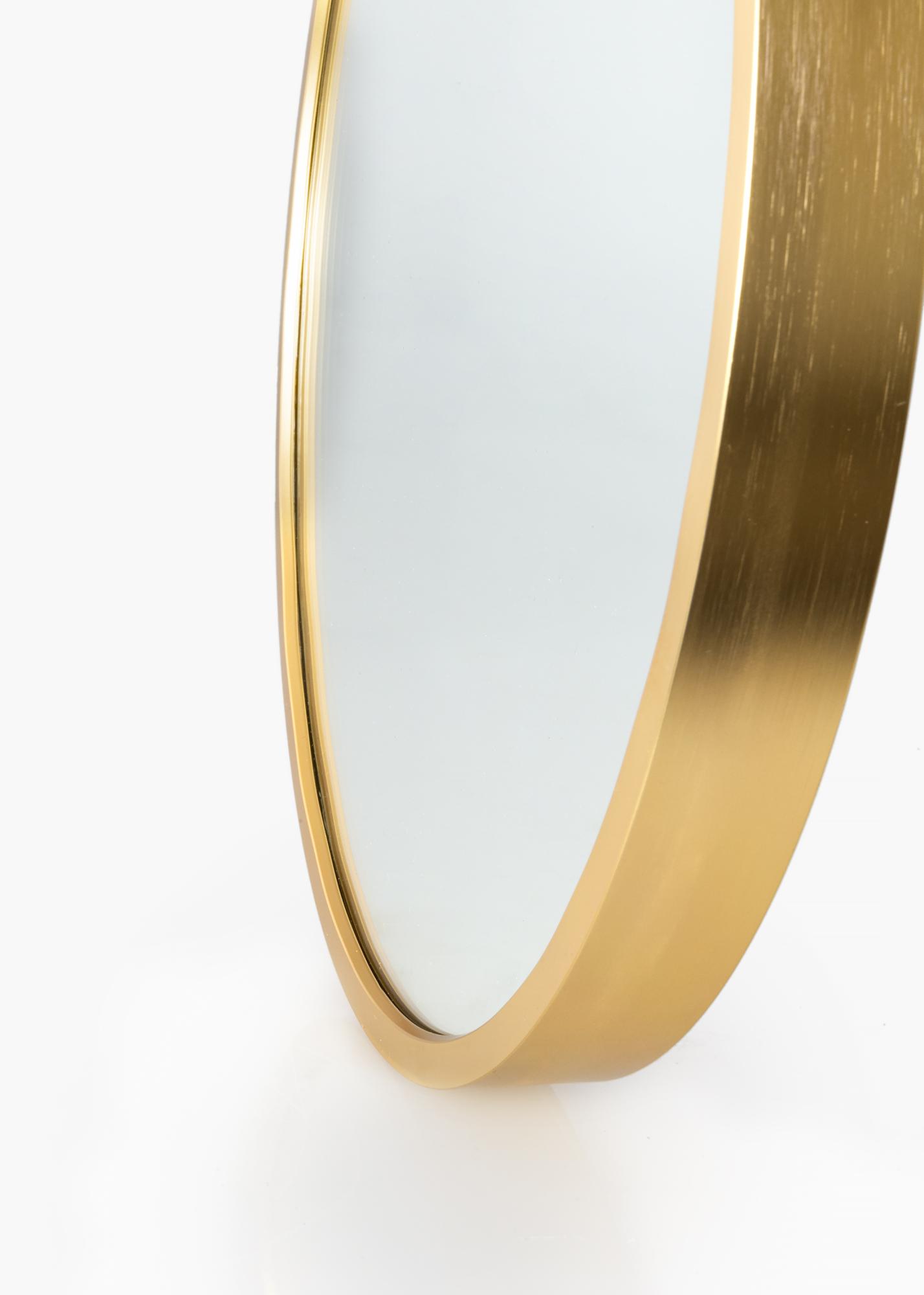 En rund spegel i stilren svensk design med en metallram i vacker guldfinish. Ramen har en borstad yta, vilket ger den vackra guldfärgen en lite mattare look. Ramen är också trendigt tunn, men har samtidigt – beroende på storlek – ett djup på mellan 30-40 mm, vilket gör att den kommer ut en bit från väggen och skapar en häftig 3D-effekt. Ramens djup gör dessutom att spegeln känns gedigen och robust, utan att ta bort spegelns minimalistiska känsla.