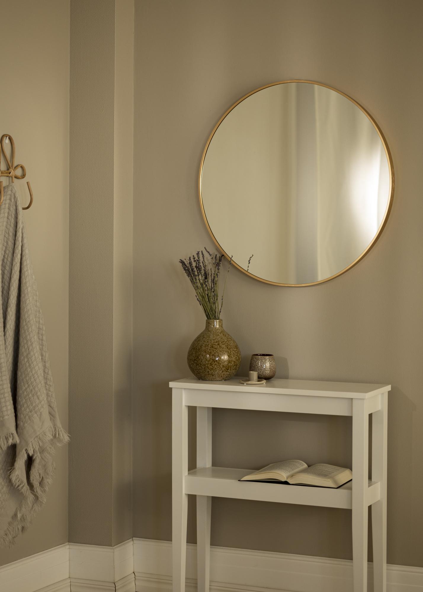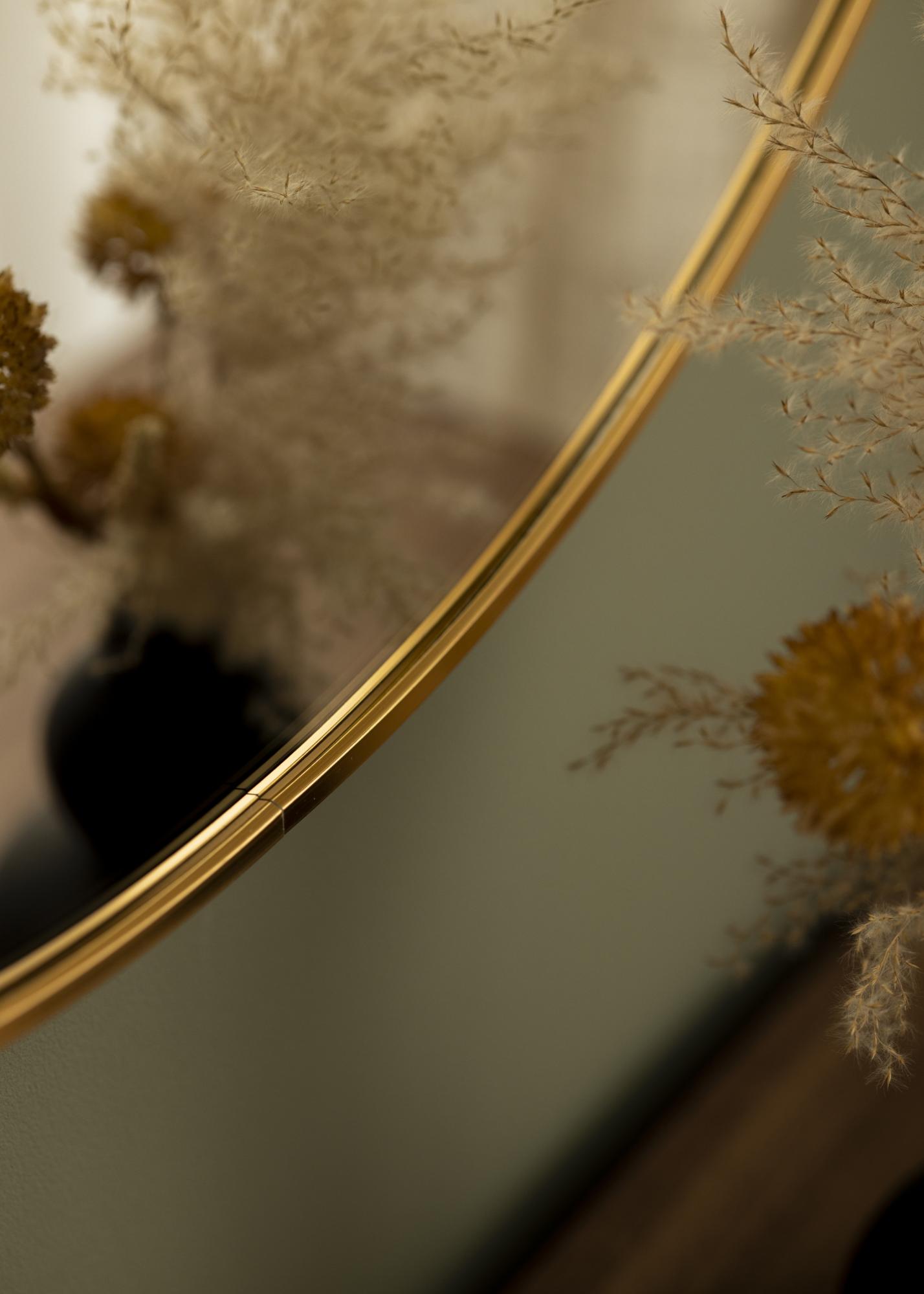En rund spegel i stilren svensk design med en metallram i vacker guldfinish. Ramen har en borstad yta, vilket ger den vackra guldfärgen en lite mattare look. Ramen är också trendigt tunn, men har samtidigt – beroende på storlek – ett djup på mellan 30-40 mm, vilket gör att den kommer ut en bit från väggen och skapar en häftig 3D-effekt. Ramens djup gör dessutom att spegeln känns gedigen och robust, utan att ta bort spegelns minimalistiska känsla.