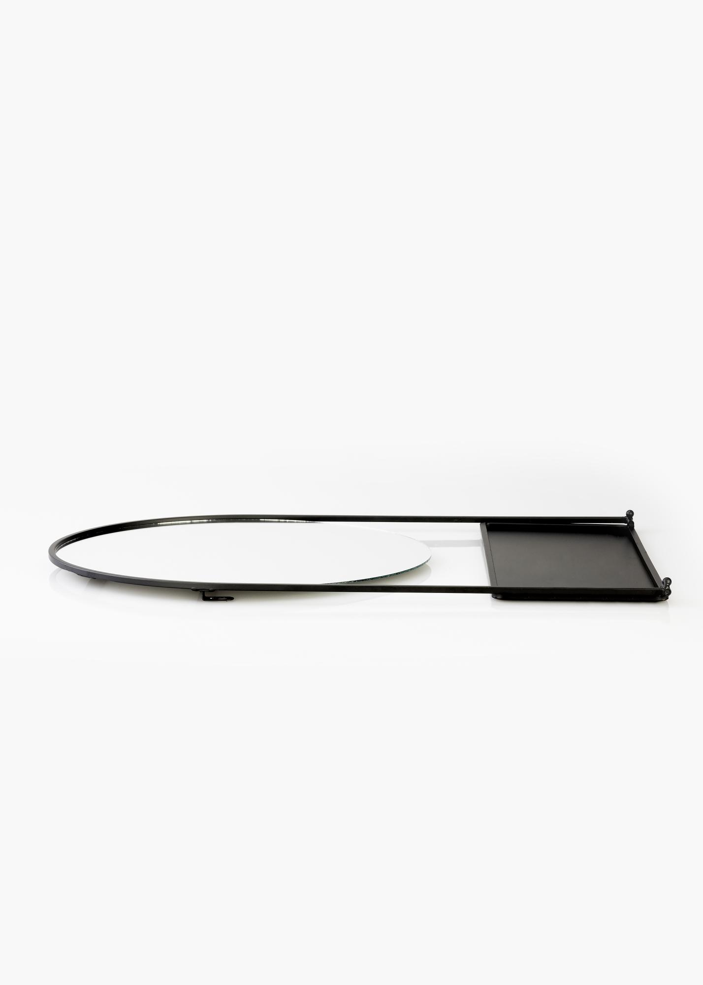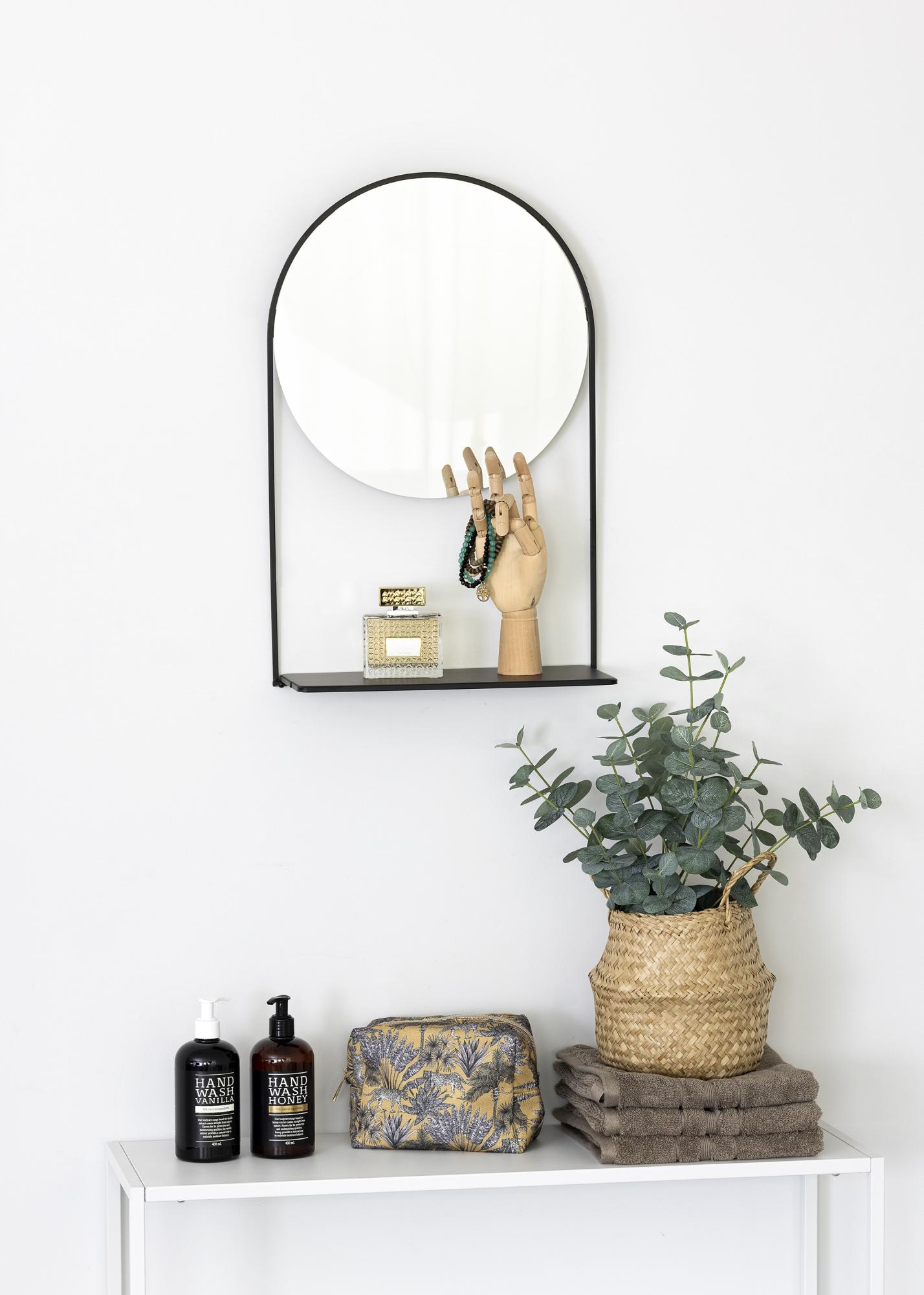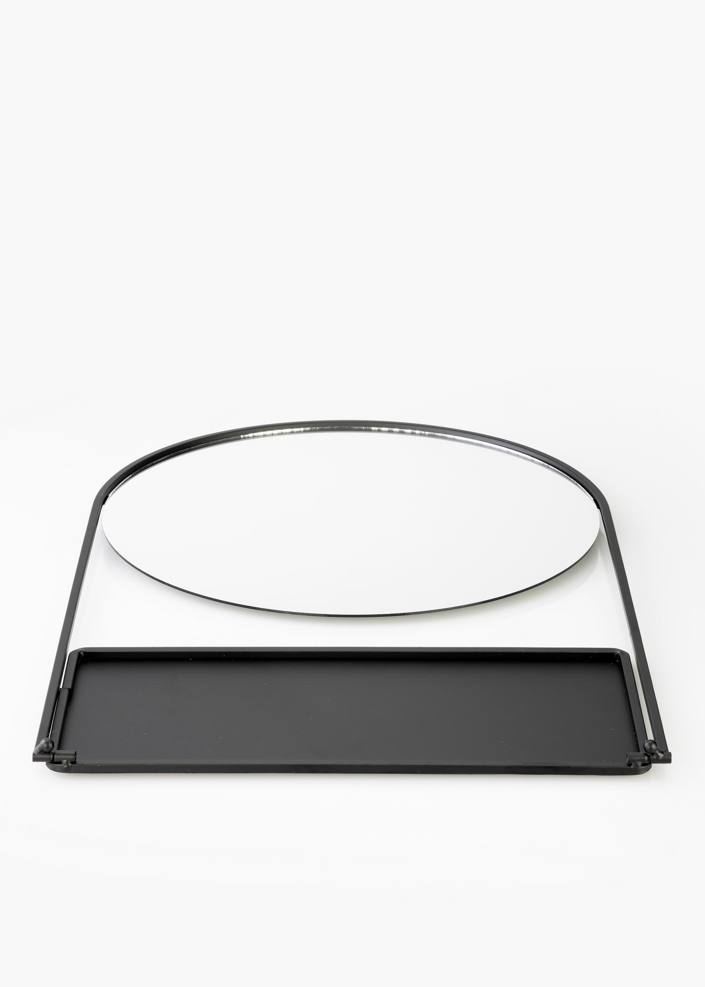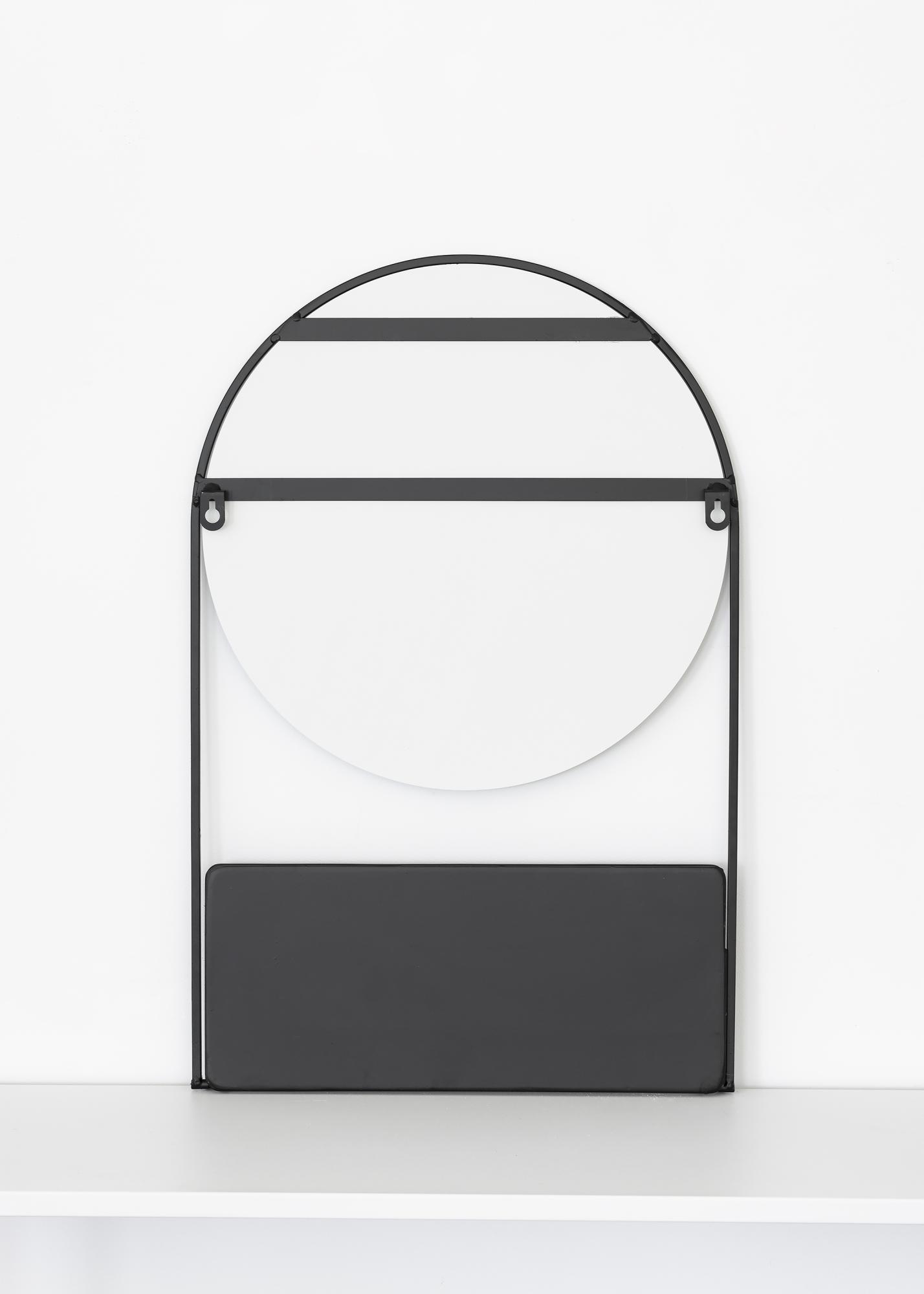 Denna stilfulla väggspegel med hylla är en svensk design från KAILA. Spegeln går i en svart nyans och är tillverkad i metall. Själva spegelytan är rund och mäter 35 cm i diameter. Runt spegelytan sitter en svart metallkant och längst ner en hylla - perfekt för att kunna ställa fin dekoration eller lite sminkförvaring på! Spegeln mäter 35x55 cm och har väggfäste.