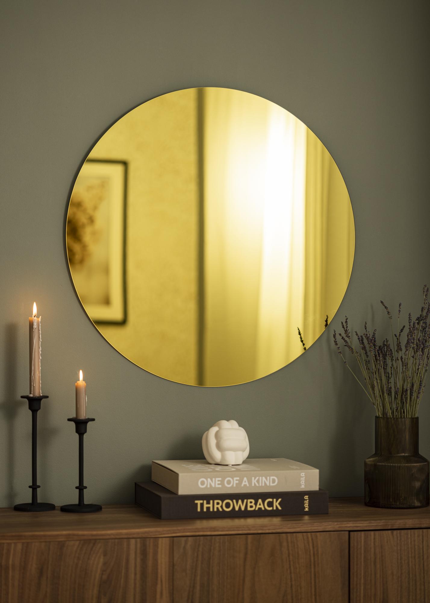 Denna trendiga runda spegel kommer bli en iögonfallande inredningsdetalj i ditt hem. Oavsett om du monterar upp den i sovrummet, hallen eller vardagsrummet kommer spegelns gultonade spegelglas addera en klick färg till hela rummet, på ett sätt som känns både sofistikerat och härligt. Spegeln har tunt spegelglas och en design utan ram, vilket ger en minimalistisk touch. På baksidan finner du väggfästen för upphängning på väggen.