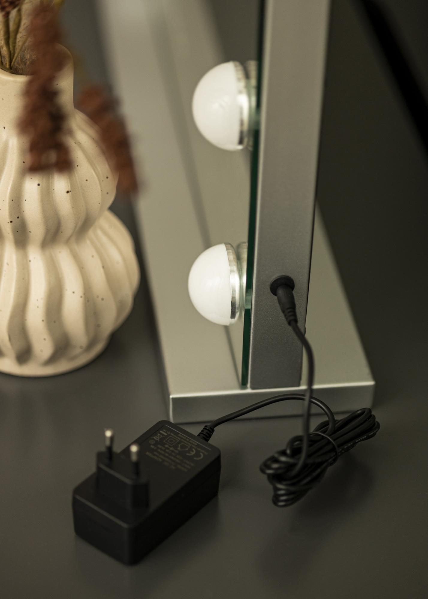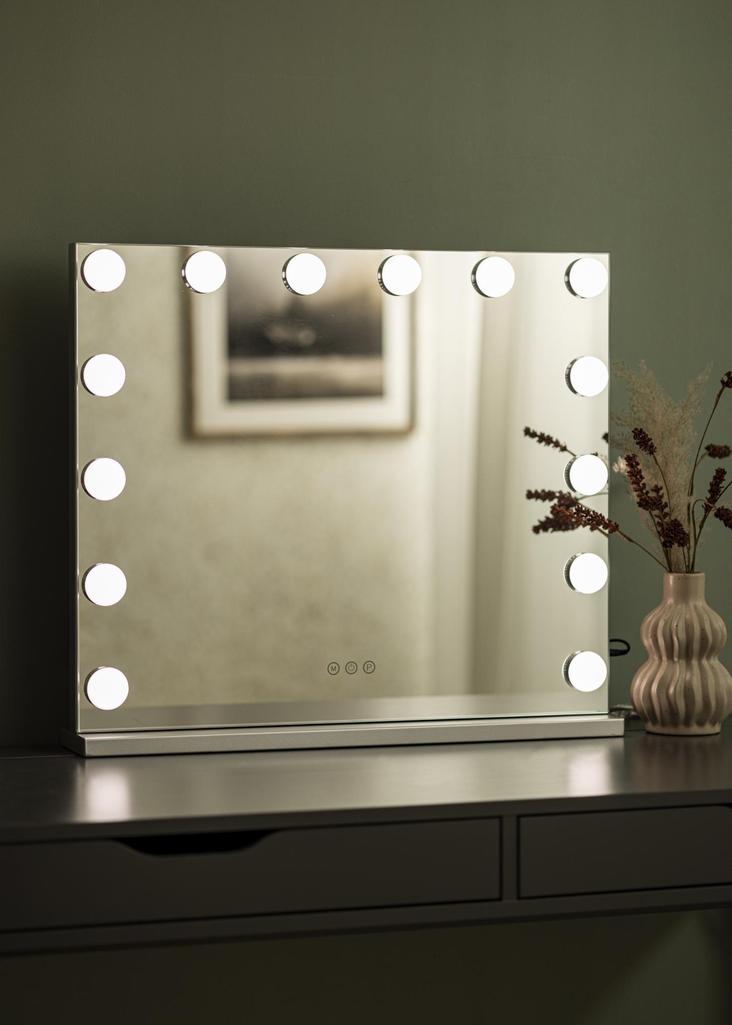Med denna sminkspegel får du mer glamour i ditt hem, tack vare den lyxiga designen med 14 stora LED-lampor som skapar en ram runt spegelytan. Den silverfärgade nyansen och den rektangulära formen förstärker det stilfulla uttrycket ännu mer. Spegeln kan antingen monteras upp på väggen eller placeras ståendes som dekoration på byråer och sidobord. Spegeln ansluts med stickkontakt.