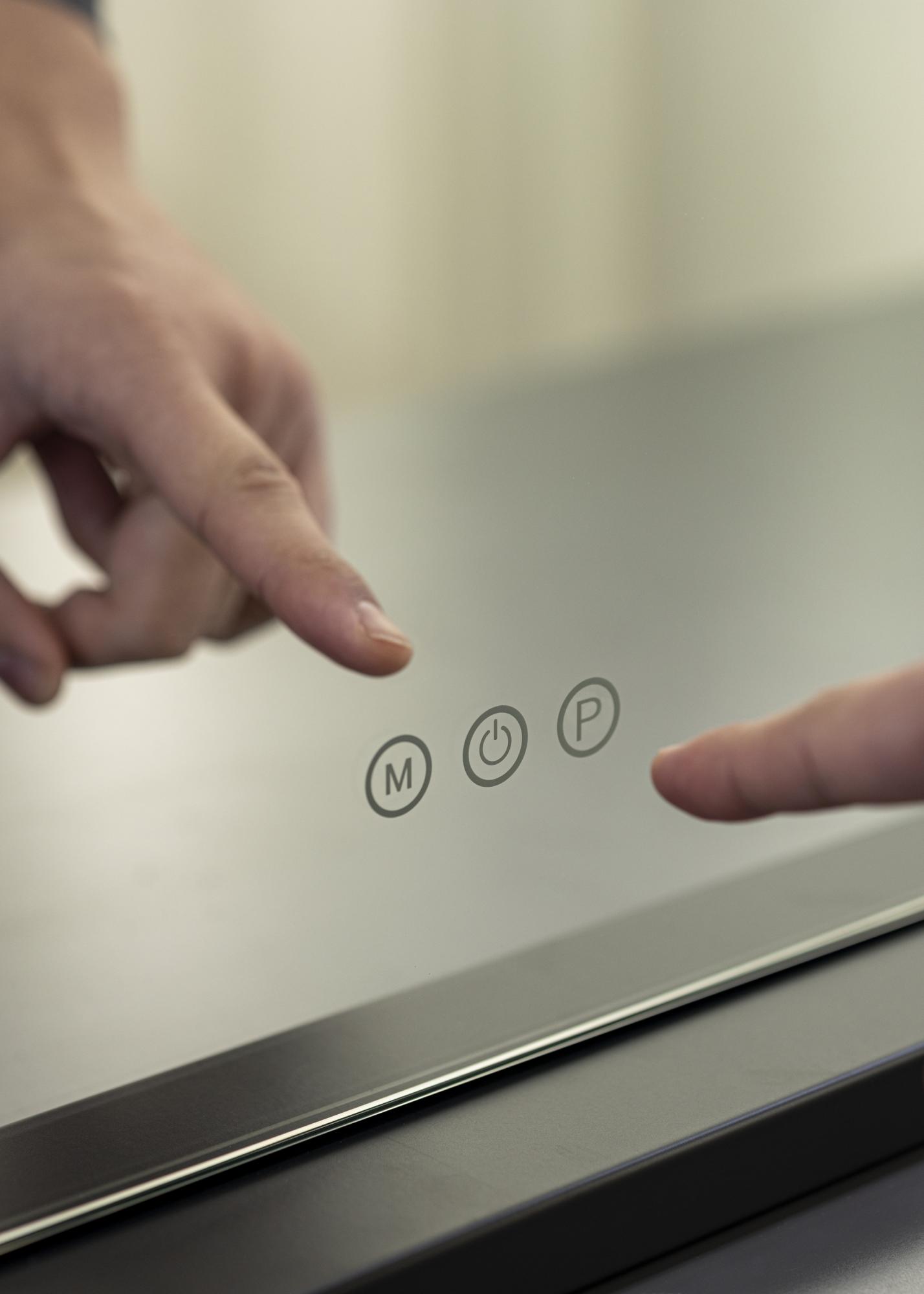 Belysningen på denna spegel är dimbar och har en färgtemperatur på 3000K-6000K. Du kan enkelt justera belysningen efter dina preferenser med hjälp av touch-knapparna på spegelytan. Håller du på "P"-knappen kan du dimra ljuset och med hjälp av "M"-knappen kan du ställa in om du vill ha varmt, kallt eller naturligt ljus. Det finns även en av-/på-knapp du kan använda för att starta eller stänga av spegelns belysning.