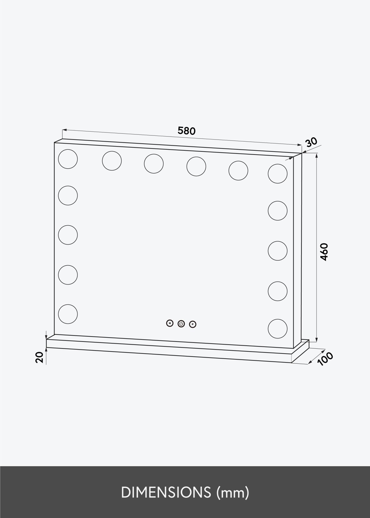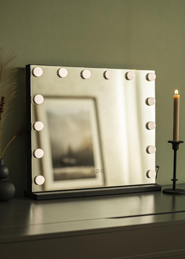 Låt denna sminkspegel addera glamour på sminkbordet i sovrummet eller på sidobordet i vardagsrummet. Spegeln har en elegant design med en rektangulär spegelyta som vackert ramas in av 14 LED-lampor. Spegelns sidor samt fotställ har en stilren svart färg som enkelt kan matchas med resten av inredningen. Fotstället går att montera på och av, så att du själv kan välja om du vill ha din spegel ståendes eller uppmonterad på väggen.