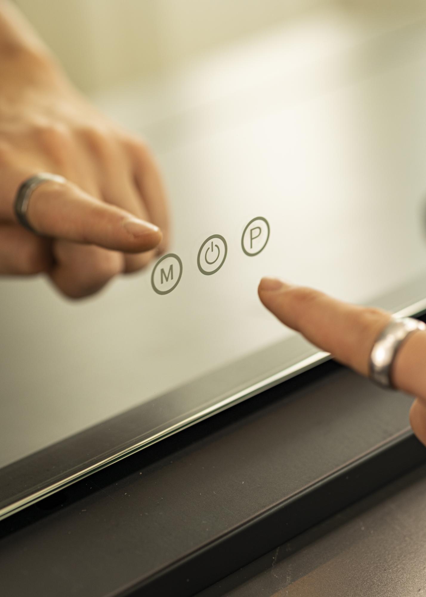 Du kan justera spegelns ljusinställningar med hjälp av touch-knapparna i spegelns nedre kant. Knappen markerad med "M" ställer in ljusets färgtemperatur mellan 3000K-6000K och knappen markerad med "P" dimrar ljuset. Det finns även en knapp som slår på och av belysningen. Elanslutning sker med stickkontakt.