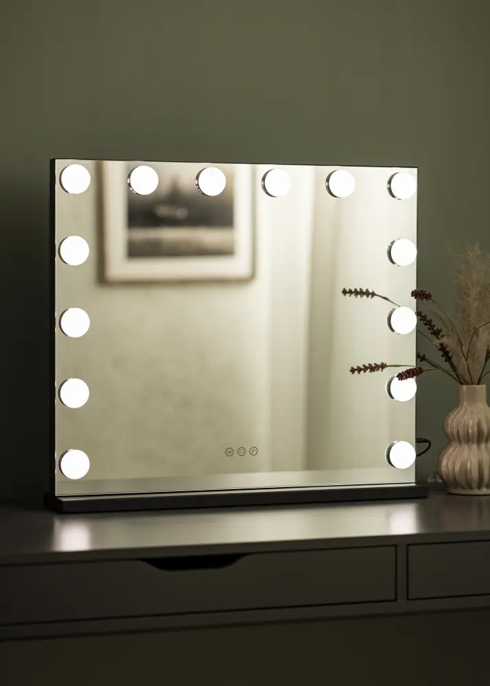 Uppgradera din dagliga rutin med vår sminkspegel med ljus, en perfekt kombination av stil och funktionalitet. Denna imponerande sminkspegel är både en attraktiv inredningsdetalj och ett värdefullt verktyg för att förbereda dig inför dagen. Modellen har en generös spegelyta på 65x56,5 cm, omringad av 14 LED-lampor som erbjuder ett justerbart sken från varmt till kallt ljus (3000K-6000K), anpassat för alla behov. Med en elegant design och en stabil svart fot är denna spegel ett utmärkt val för alla som önskar flexibilitet; foten kan nämligen tas bort för enkel montering på väggen, vilket gör spegeln ännu mer mångsidig.