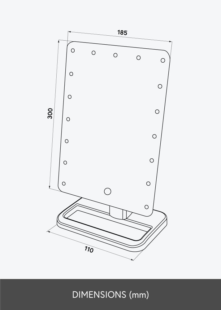 Spegeln har integrerad LED-belysning som tänds med en av-/på-knapp på baksidan. Belysningen ger ett kallt vitt sken som går att dimra. För att ställa in ljusstyrkan håller du in touch-knappen på spegelns framsida i några sekunder. Den batteridrivna spegeln drivs av 4x AA-batterier, som köps separat.