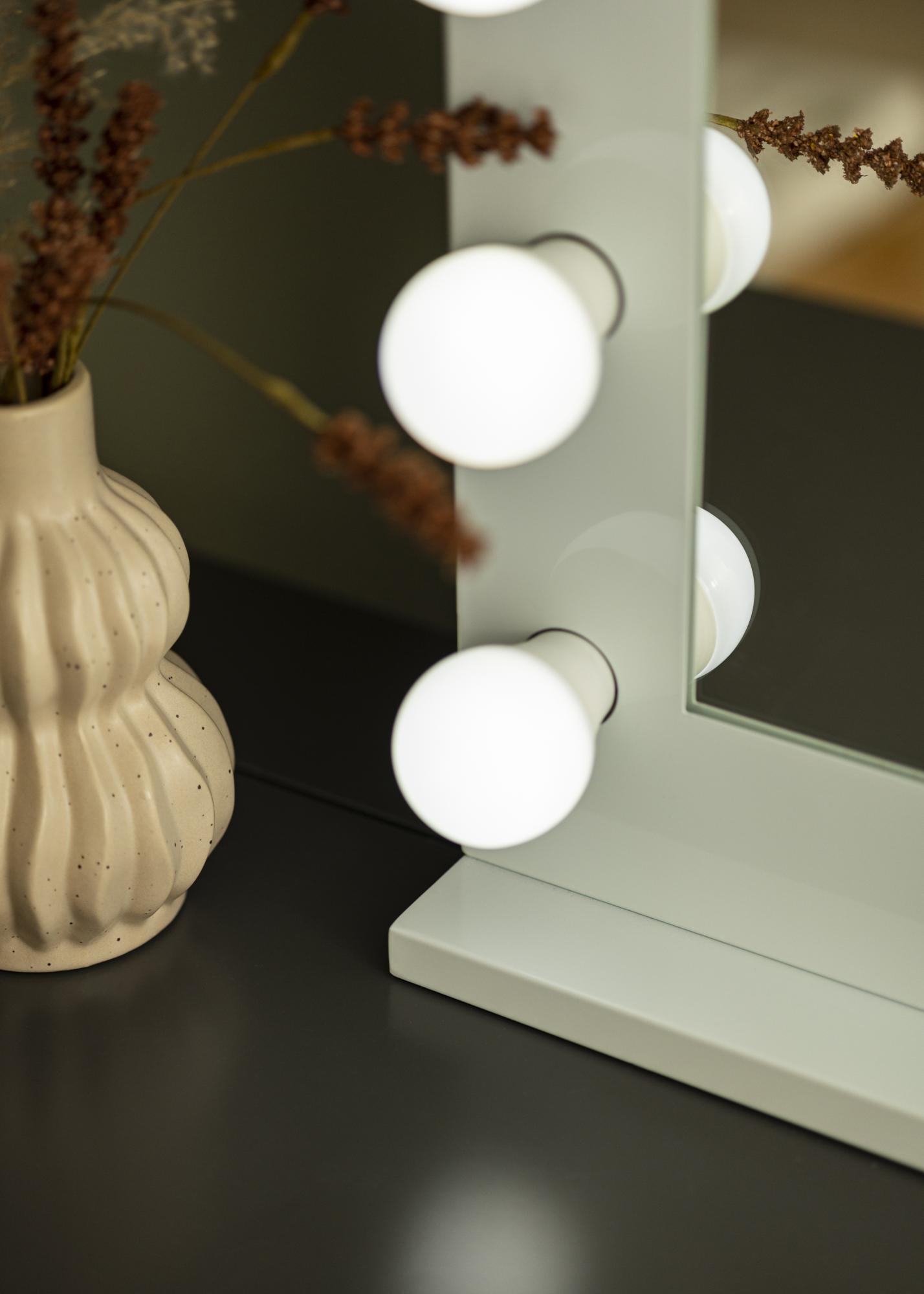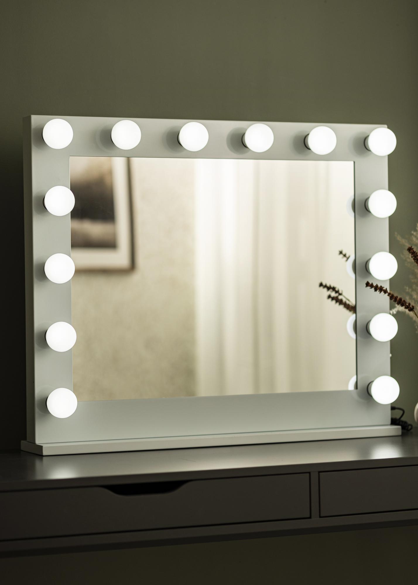 Detta är en stor sminkspegel med inbyggd belysning – perfekt när du ska applicera makeup eller spegla dig innan du går ut för dagen. Det stora formatet, med en 80x65 cm stor spegelyta, i kombination med en stilfull vit ram med 14 utbytbara glödlampor, ger spegeln en känsla av Hollywood-glamour. Glödlamporna har sockel E27. Spegeln placeras stående på en skänk, byrå eller någon annan plan yta du vill pryda med en vacker sminkspegel. Den kan även monteras upp på väggen utan fotstället.