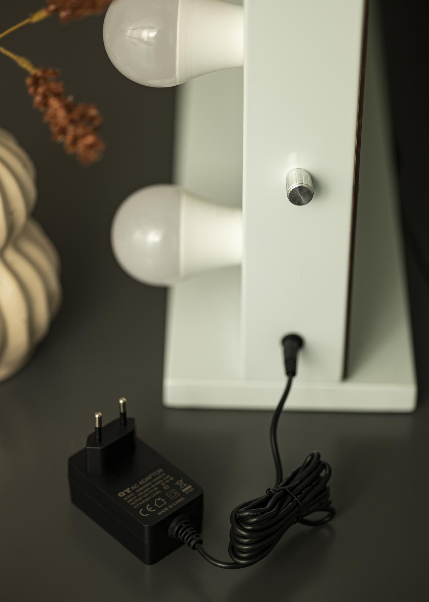 Spegelns lampor avger ett kallt vitt ljus. Önskar du dimra din belysning görs det med hjälp av en smidig vrid-knapp på en av kortsidorna. Elinstallation sker med stickpropp.