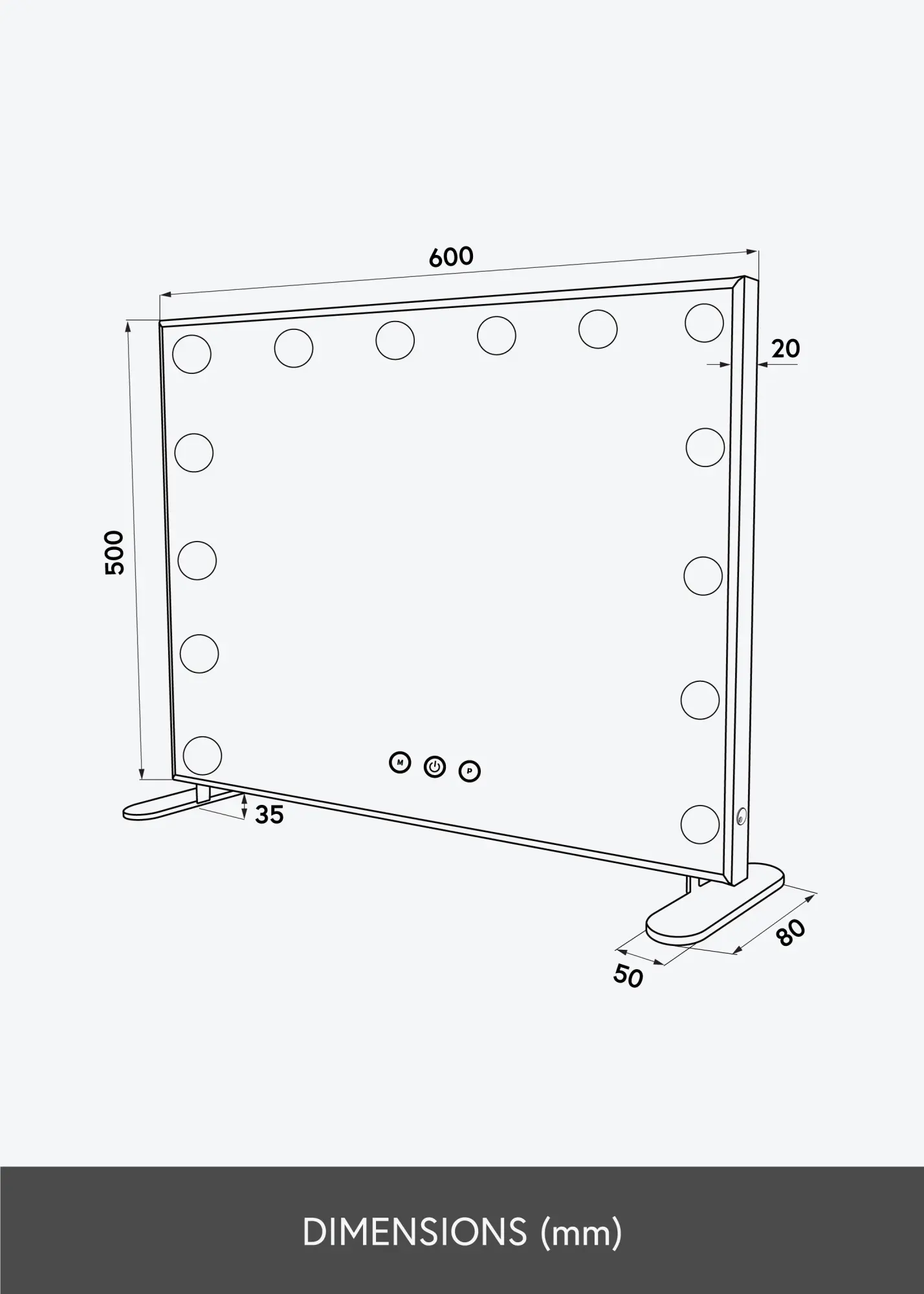 LED-belysningen är justerbar och för att ändra ljusinställningarna använder du dig av touch-knapparna i spegelns nedre kant. ”M”-knappen ändrar färgtemperaturen och ”P”-knappen ställer in ljusstyrkan. Det finns även en knapp som tänder och släcker belysningen. Den flexibla belysningen gör att denna spegel både passar i vardagsrummet när du vill ha en mjukare bakgrundsbelysning och i sminkhörnan när du önskar ett skarpt ljus som hjälper dig fokusera. Spegeln är dessutom utrustad med en USB-port, så att du enkelt kan ladda dina smarta enheter.