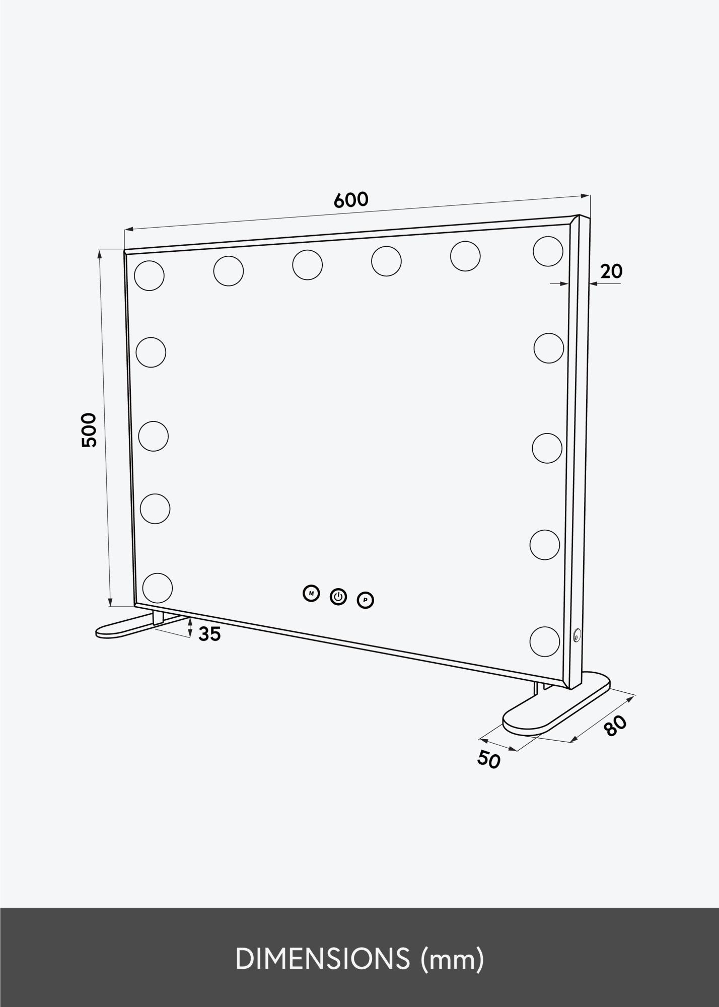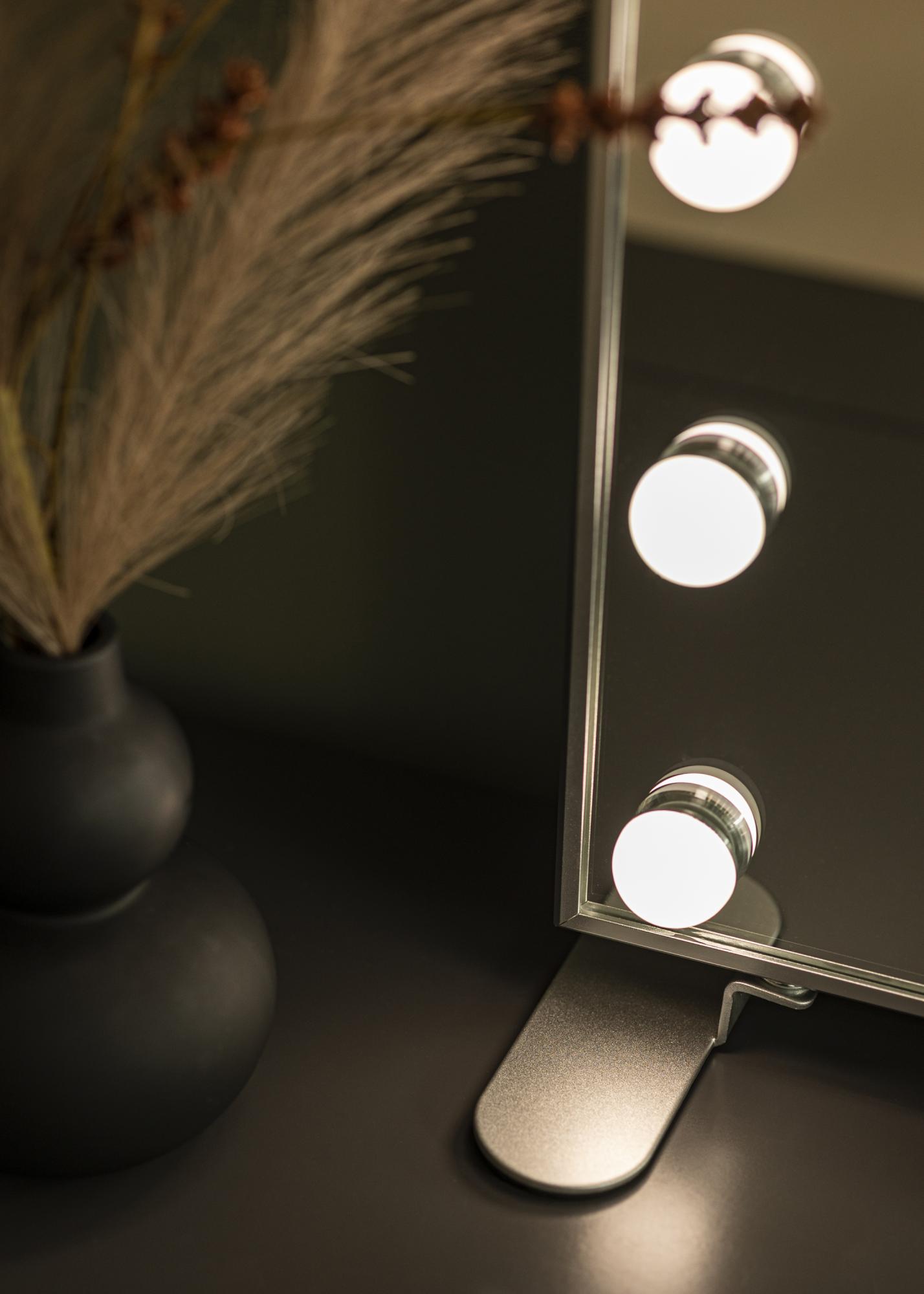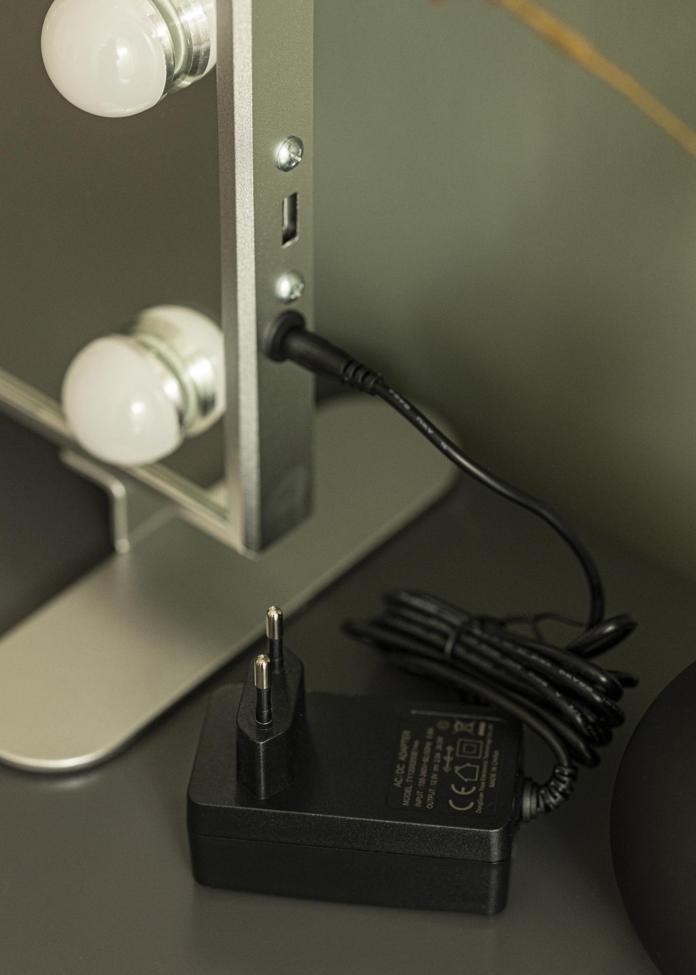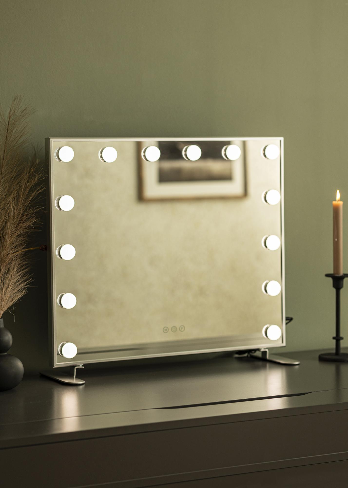 Detta är en stilsäker sminkspegel som kommer bli en fin inredningsdetalj i hemmets alla rum. Den tunna silverramen som omger den 60x50 cm stora spegelytan ger ett mycket stilrent uttryck samtidigt som de 14 rundade LED-lamporna placerade runt spegelns kanter ger en exklusiv känsla. På spegelns ena sida finns en USB-port som låter dig ladda dina smarta enheter via USB-anslutning.