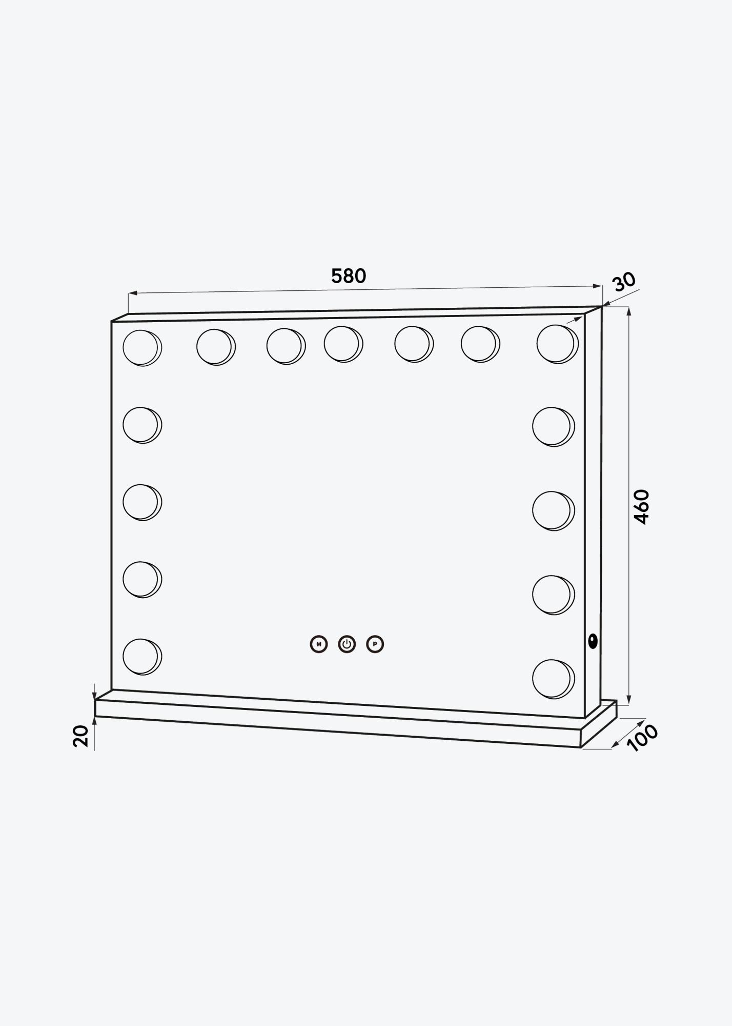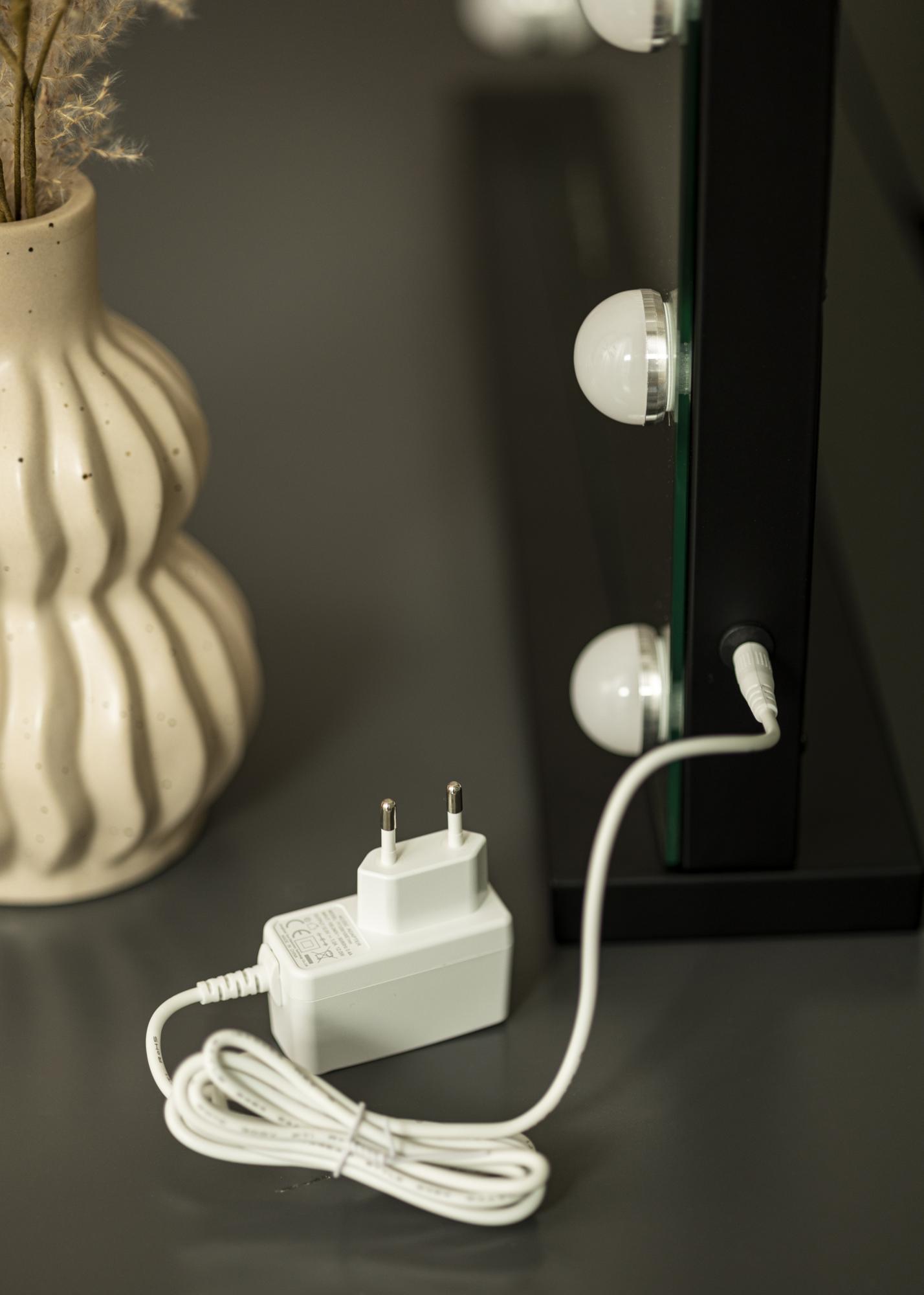 Piffa upp sminkhörnan, vardagsrummet eller hallen med en elegant sminkspegel med inbyggd belysning! Spegeln har ingen traditionell ram utan spegelytan ramas i stället in av 15 LED-lampor som är placerade längs spegelns kanter. Belysningen är justerbar och du kan ställa in både ljusstyrka och färgtemperatur. Ljusinställningarna görs via touch-knapparna i spegelns nedre kant, där "P"-knappen ändrar ljusstyrkan och "M"-knappen justerar färgtemperaturen. Där finns även en touch-knapp för att tända eller släcka belysningen. Elanslutning sker med stickkontakt.