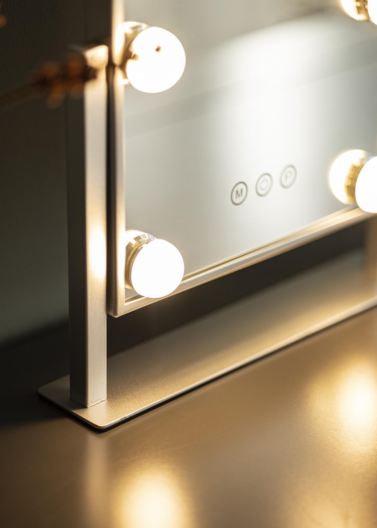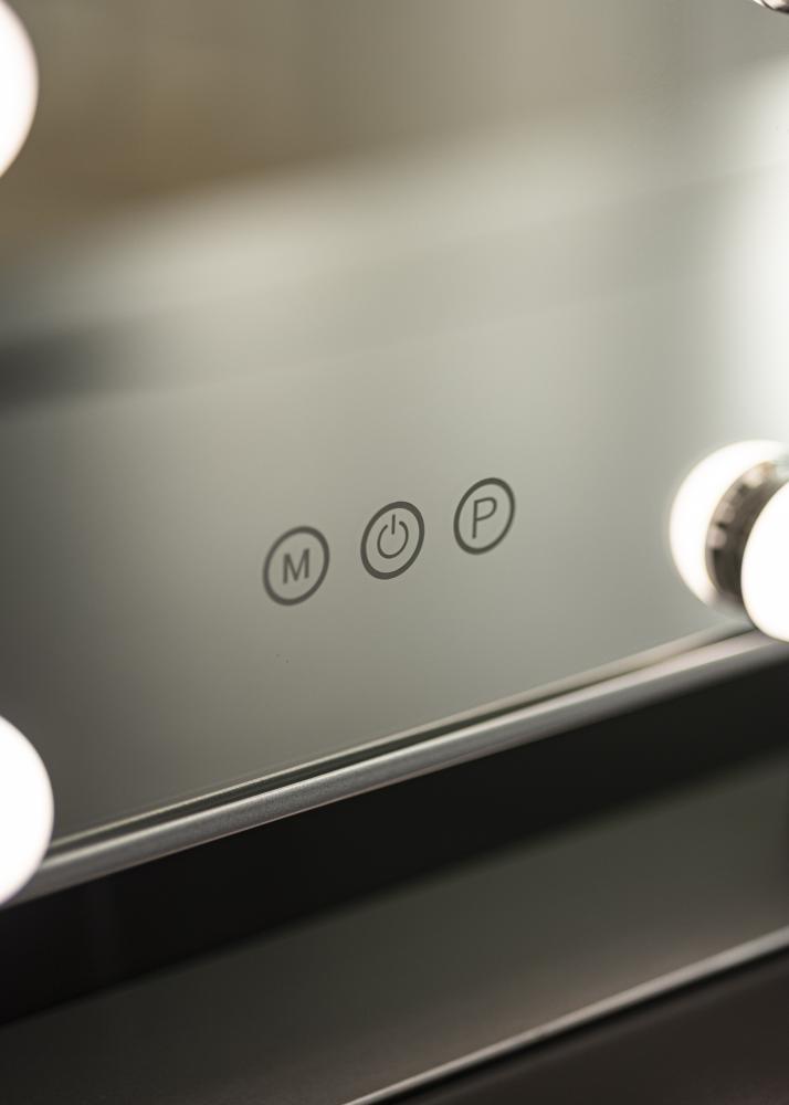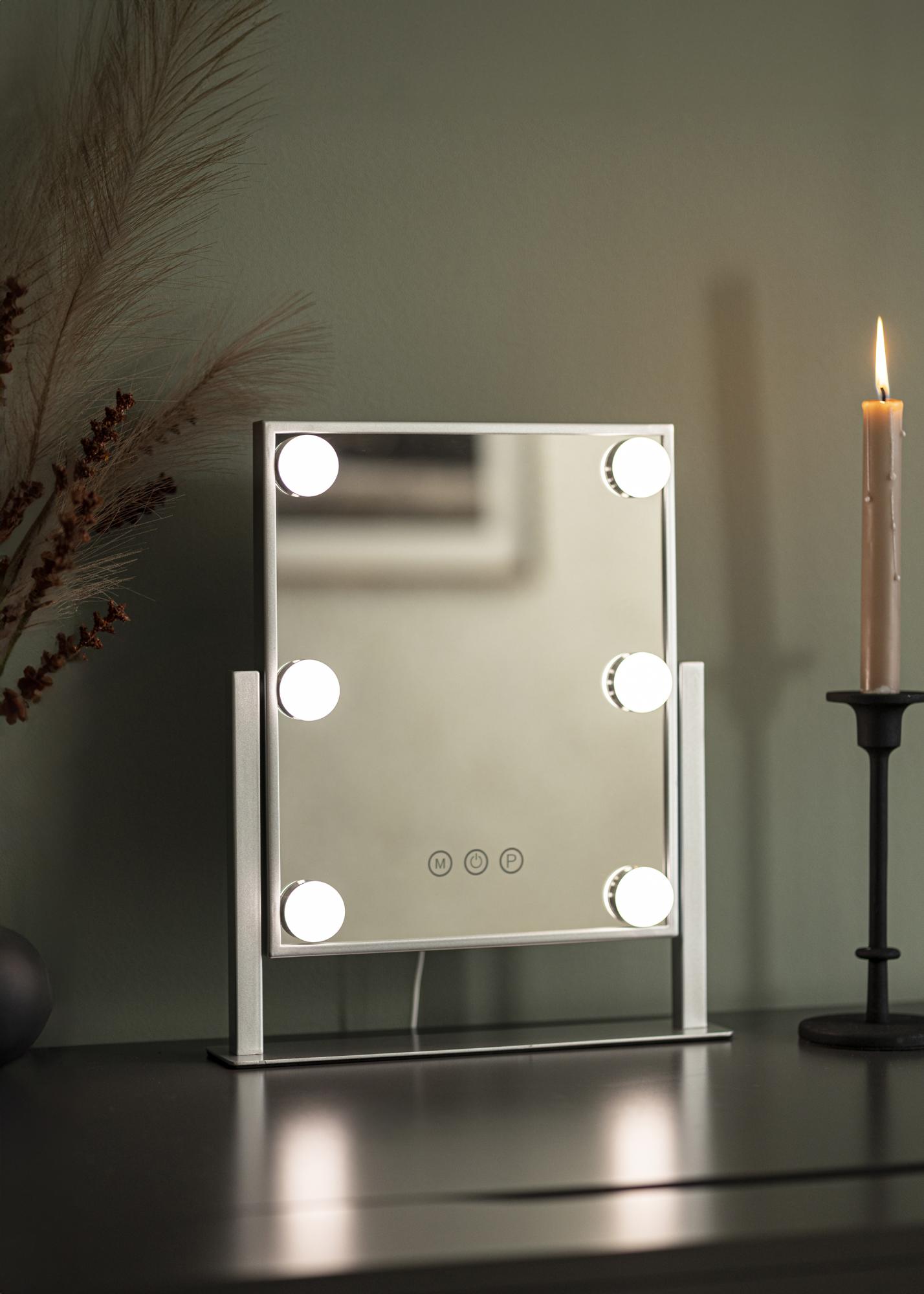 Denna sminkspegel från KAILA adderar stil och glamour till ditt hem! Den nätta storleken gör att den passar bra i både sovrum och vardagsrum, beroende på vart du föredrar att applicera din makeup och göra dig i ordning för dagen. Spegeln har en snygg silverfärg och är utrustad med 6 stycken LED-lampor som stilfullt ramar in spegelytan. Spegeln har touch-knappar på framsidan, med vilka du kan tända lampan samt justera belysningen. Knappen markerad med ”M” justerar färgtemperaturen och knappen markerad med ”P” ställer in ljusstyrkan.