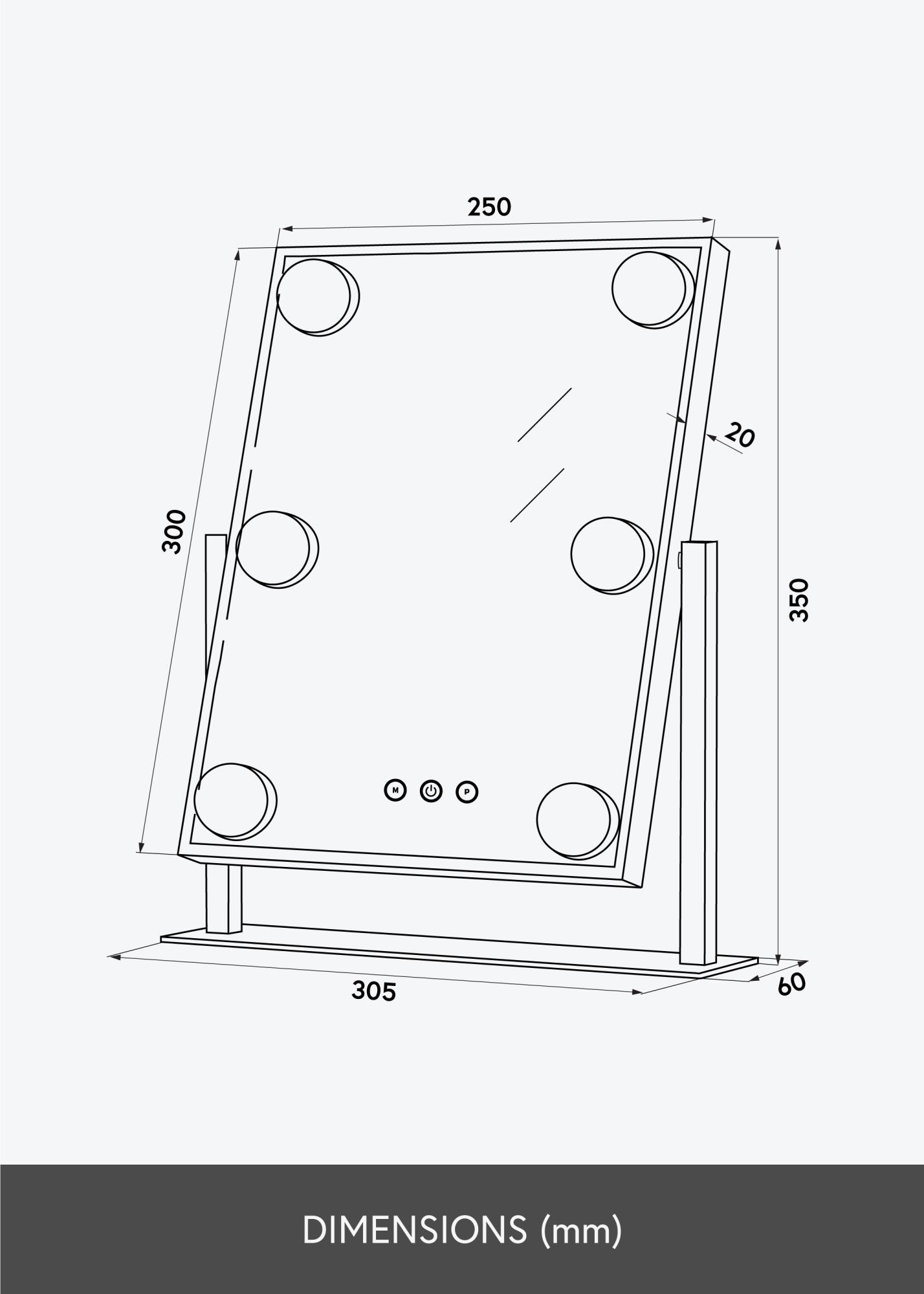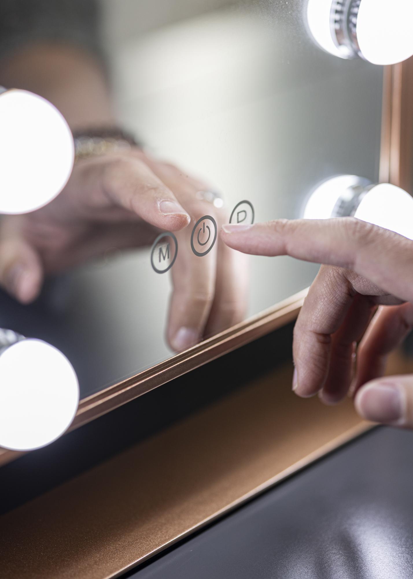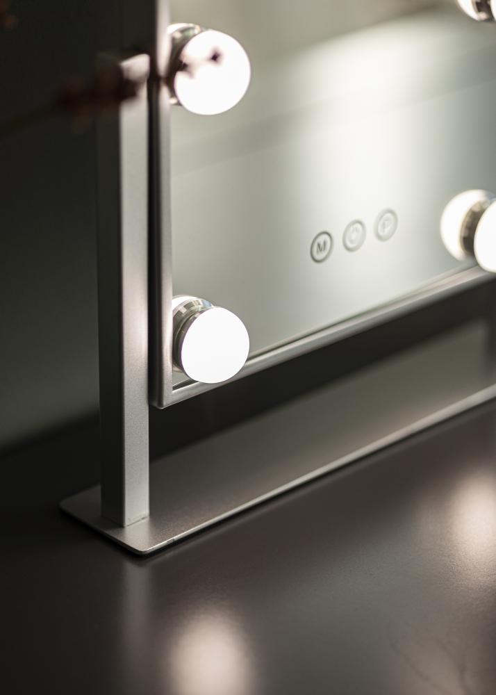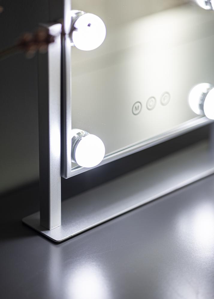 Denna sminkspegel från KAILA adderar stil och glamour till ditt hem! Den nätta storleken gör att den passar bra i både sovrum och vardagsrum, beroende på vart du föredrar att applicera din makeup och göra dig i ordning för dagen. Spegeln har en snygg silverfärg och är utrustad med 6 stycken LED-lampor som stilfullt ramar in spegelytan. Spegeln har touch-knappar på framsidan, med vilka du kan tända lampan samt justera belysningen. Knappen markerad med ”M” justerar färgtemperaturen och knappen markerad med ”P” ställer in ljusstyrkan.