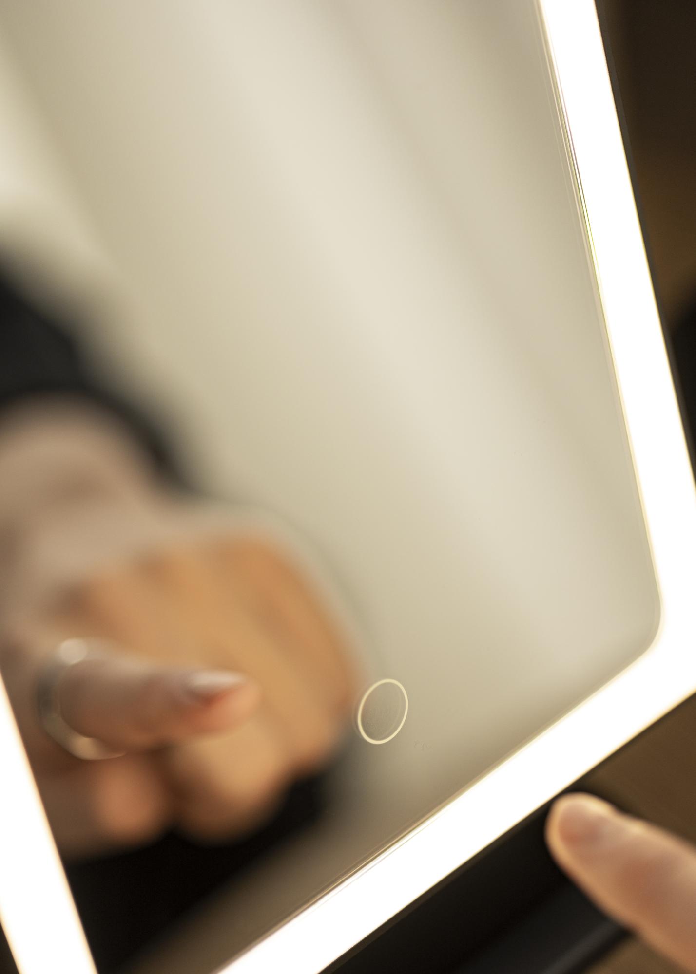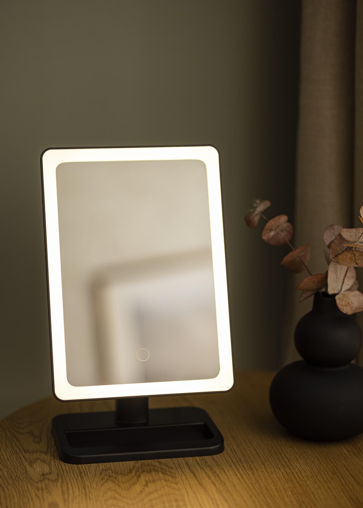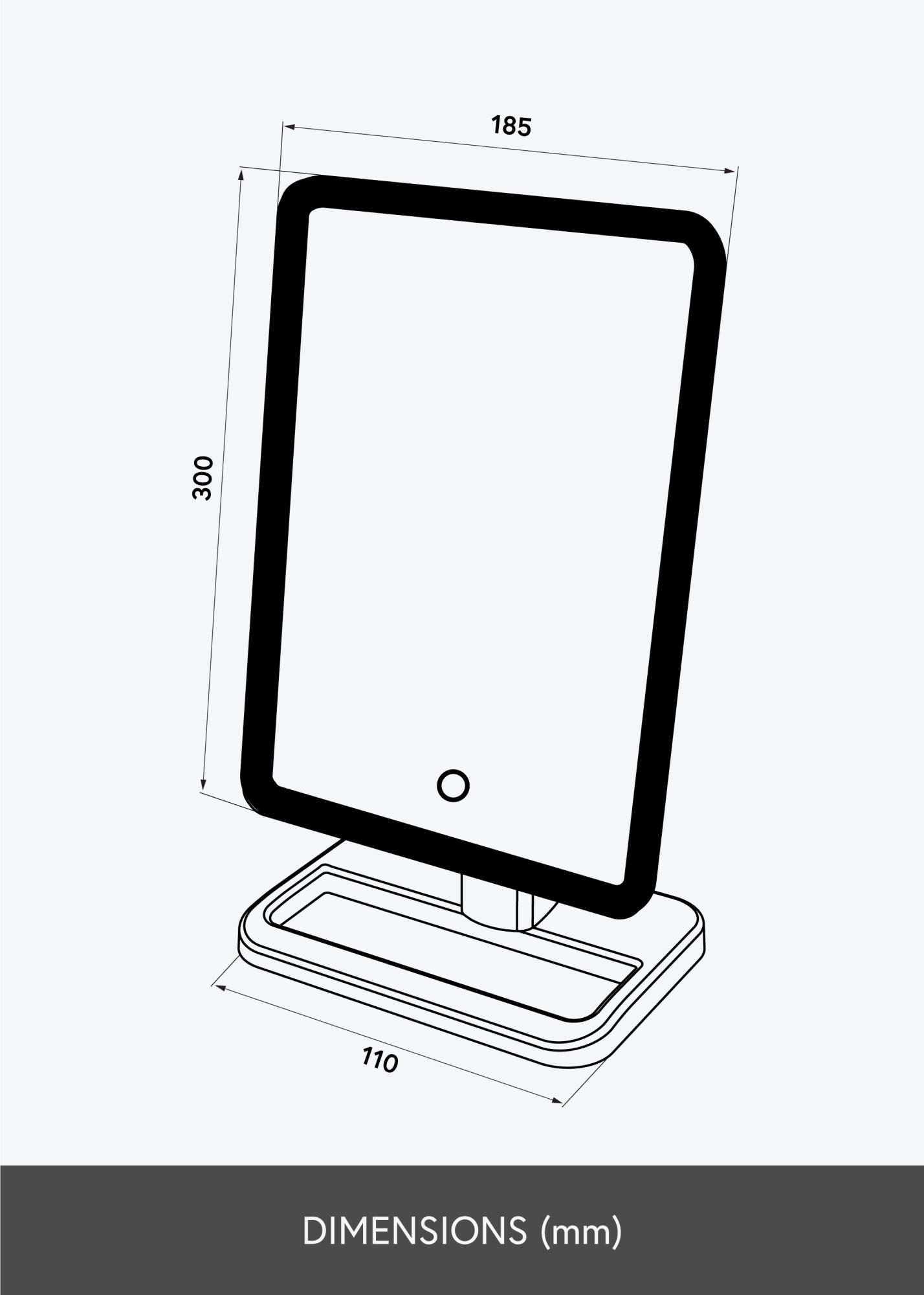 Spegeln har en smart design med finesser som gör det lättare att sminka dig med utmärkt resultat. Spegelytan omges av en LED-slinga som lyser upp ditt ansikte – dessutom går den att vrida och vinkla för att du ska kunna ställa in en vinkel som passar dig. Du kan dimra belysningen genom att trycka på knappen på spegeln. Det medföljer även en mindre spegel med 10x zoom, vilket är perfekt när du vill fokusera på en liten del av ansiktet. Spegeln drivs av ett inbyggt batteri som laddas upp via den medföljande USB-kabeln.