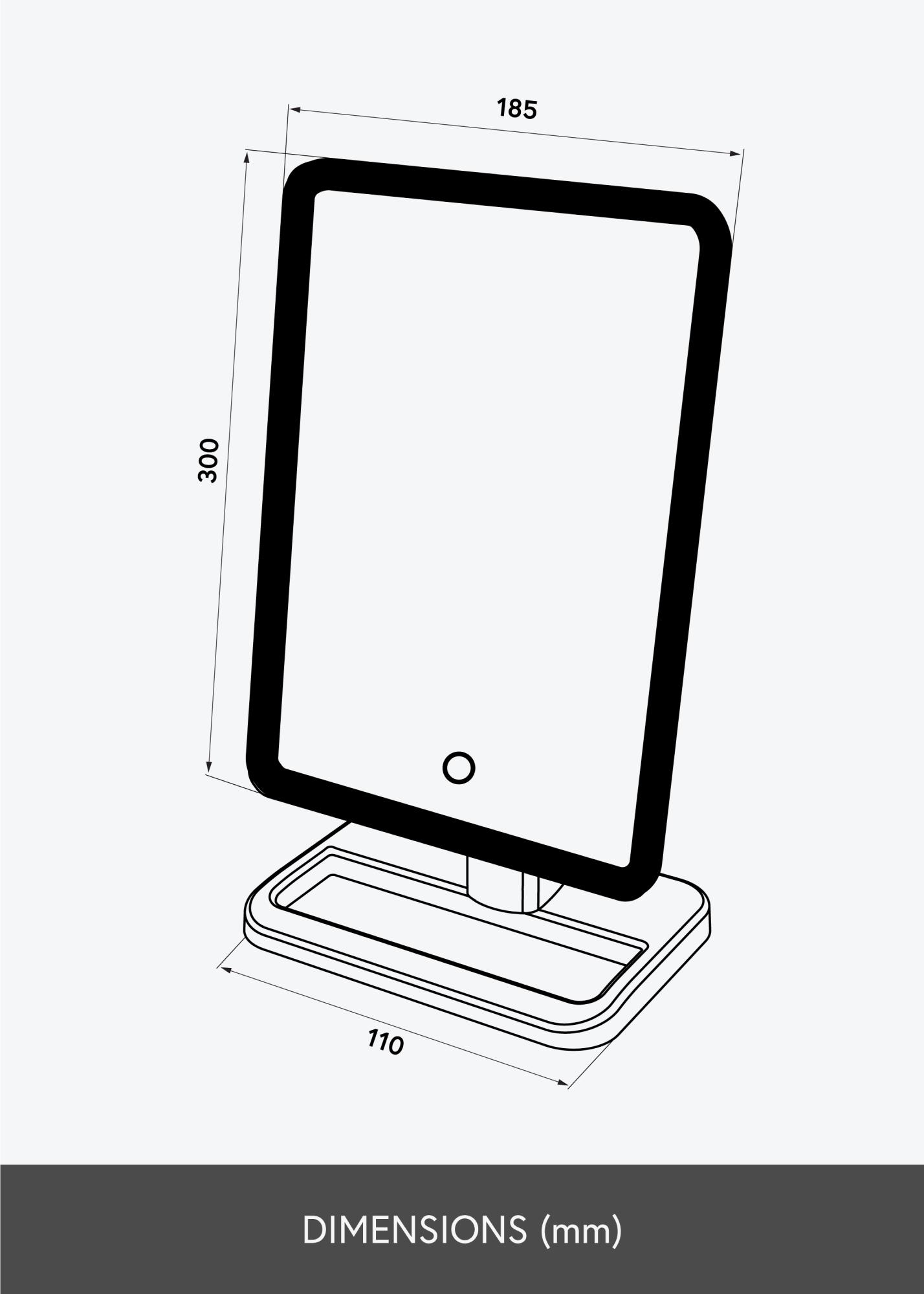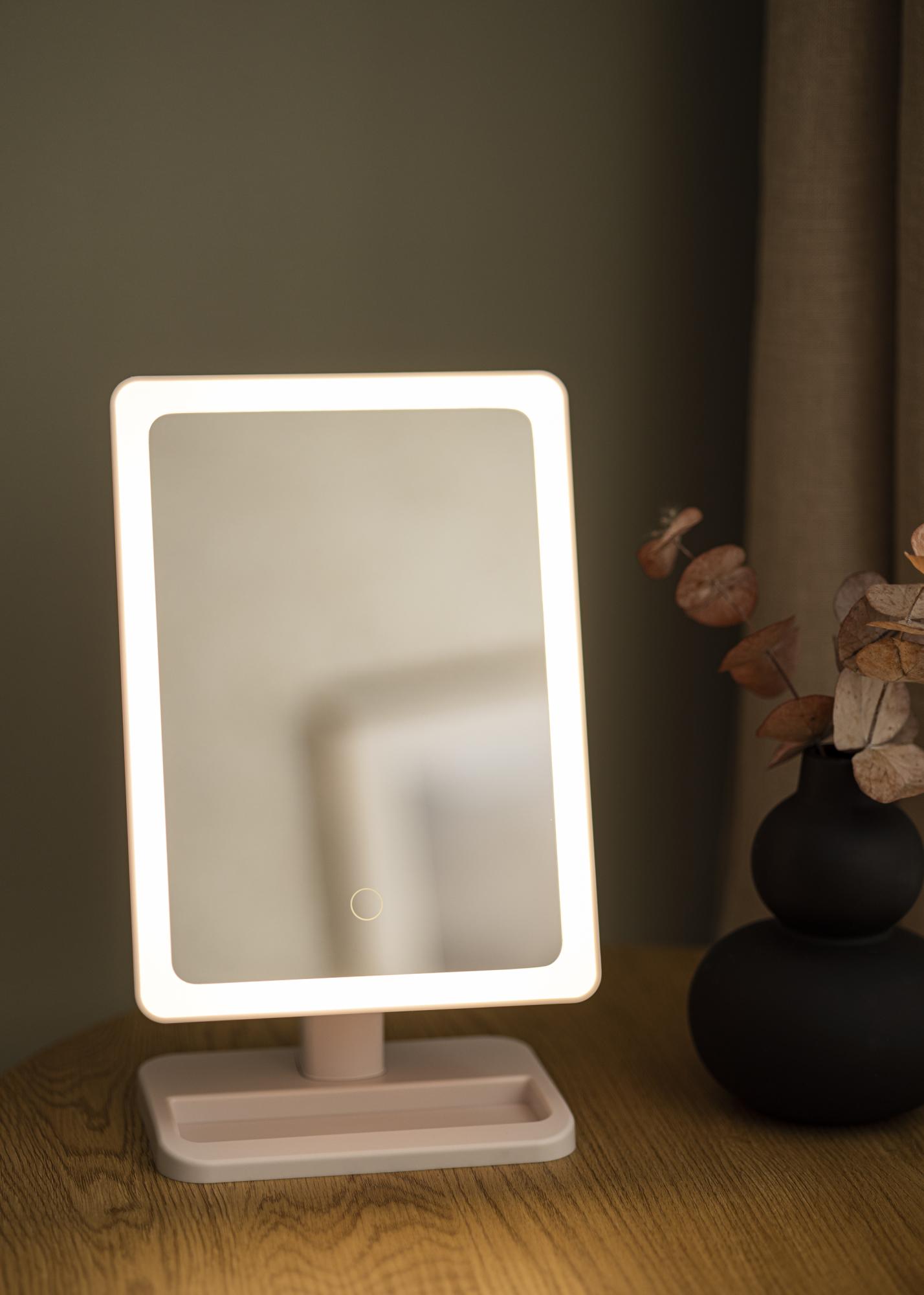 Spegeln har ett stilrent utseende, med en neutral vit färg och en LED-slinga som ramar in den 16,5x25 cm stora spegelytan. Du kan dimra belysningen genom att hålla in knappen på spegelytan i några sekunder. På så vis kan du ställa in den ljusstyrka som passar dig bäst. Spegelns smarta design låter dig vrida och vinkla spegelytan som du önskar, och den lätta vikten gör spegeln enkel att flytta runt. En mindre spegel med 10x zoom medföljer. Det är perfekt när du vill kunna spegla en del av ditt ansikte i detalj. Spegeln drivs av ett inbyggt batteri som laddas upp via den medföljande laddningskabeln.