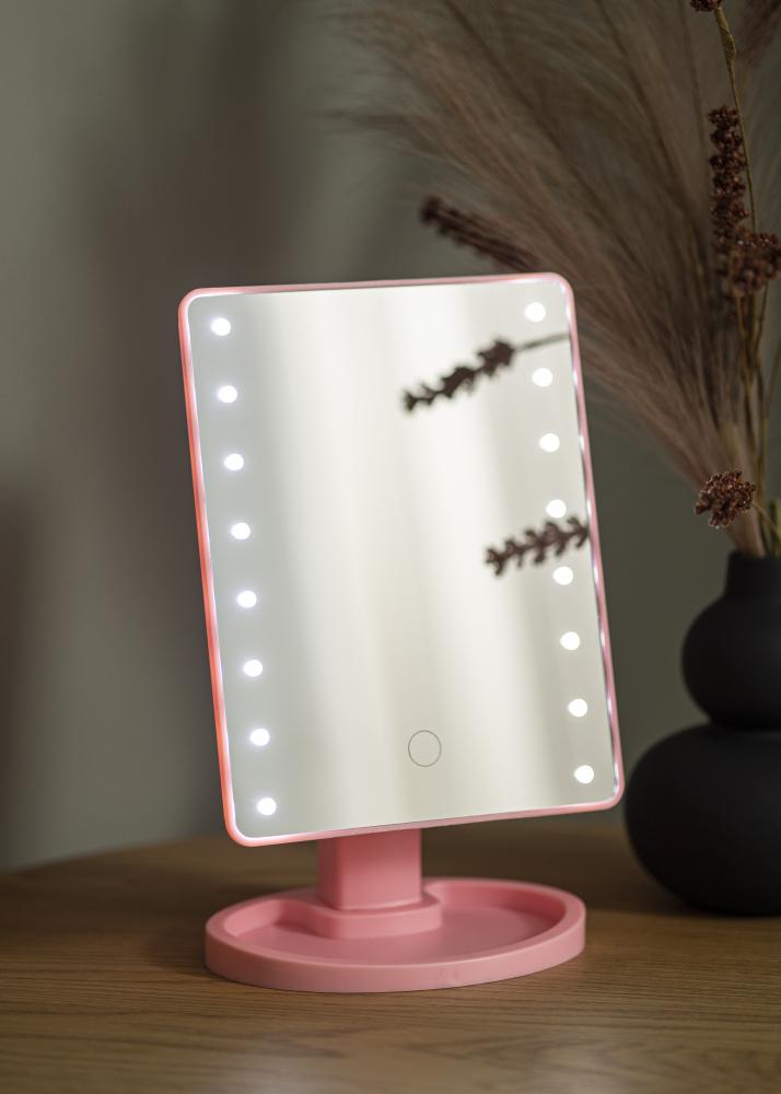 Denna sminkspegel är ett utmärkt val för dig som vill ha en mindre spegel i en snygg modell. Den rosa nyansen blir en härlig färgklick, samtidigt som den integrerade LED-belysningen ger ett jämnt, kallt vitt ljus när du speglar dig. Du tänder spegeln med hjälp av strömknappen på baksidan av enheten. Belysningen kan även dimras, så att du kan ställa in den ljusstyrka du föredrar. För att dimra ljuset håller du på touch-knappen på framsidan.