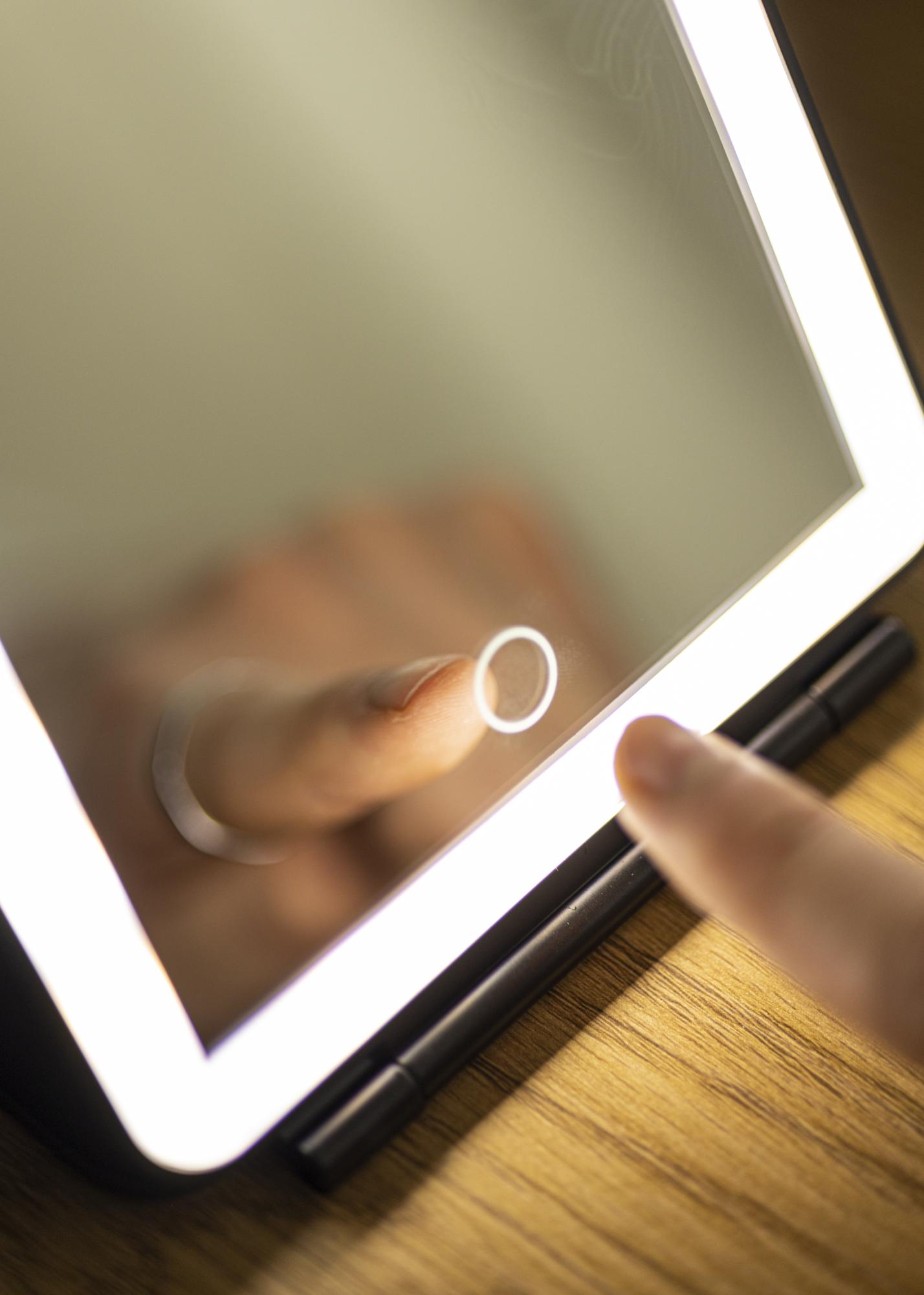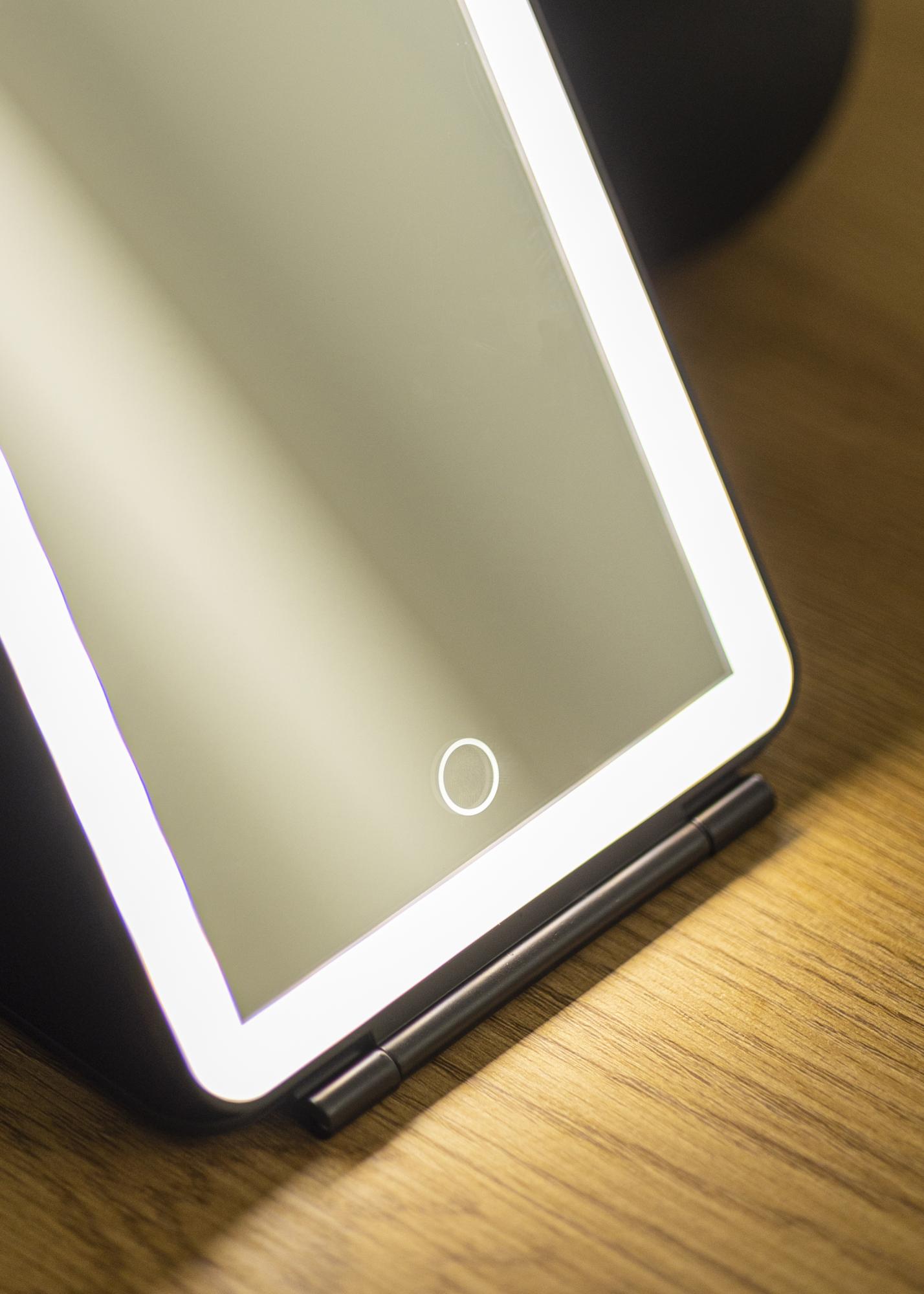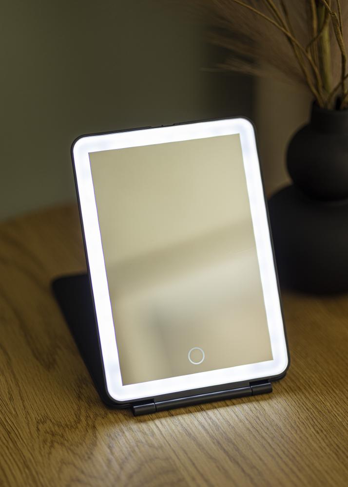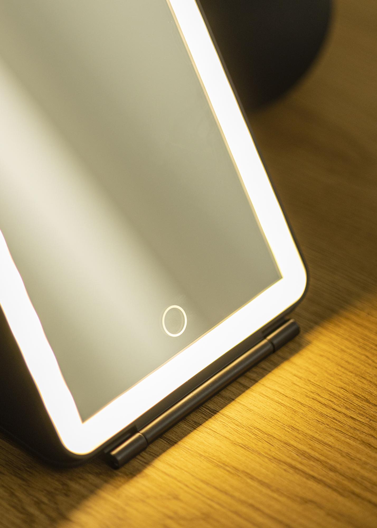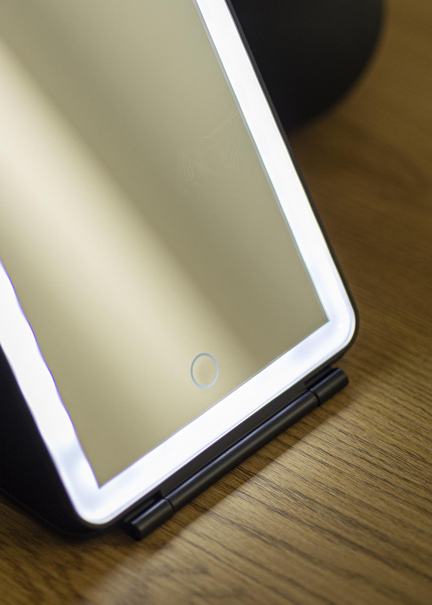 Denna spegel har en stilren svart färg och är hopfällbar, vilket både är platsbesparande samt skyddar spegelytan från att repas när du förvarar spegeln i väskan. I uppfällt läge kan du vinkla spegeln. På spegelytan finns en touch-knapp som sätter på och stänger av spegelns belysning. Håller du in knappen i några sekunder kan du även ändra ljusinställningarna. Du kan då dimra ljuset samt ställa in färgtemperaturen.
