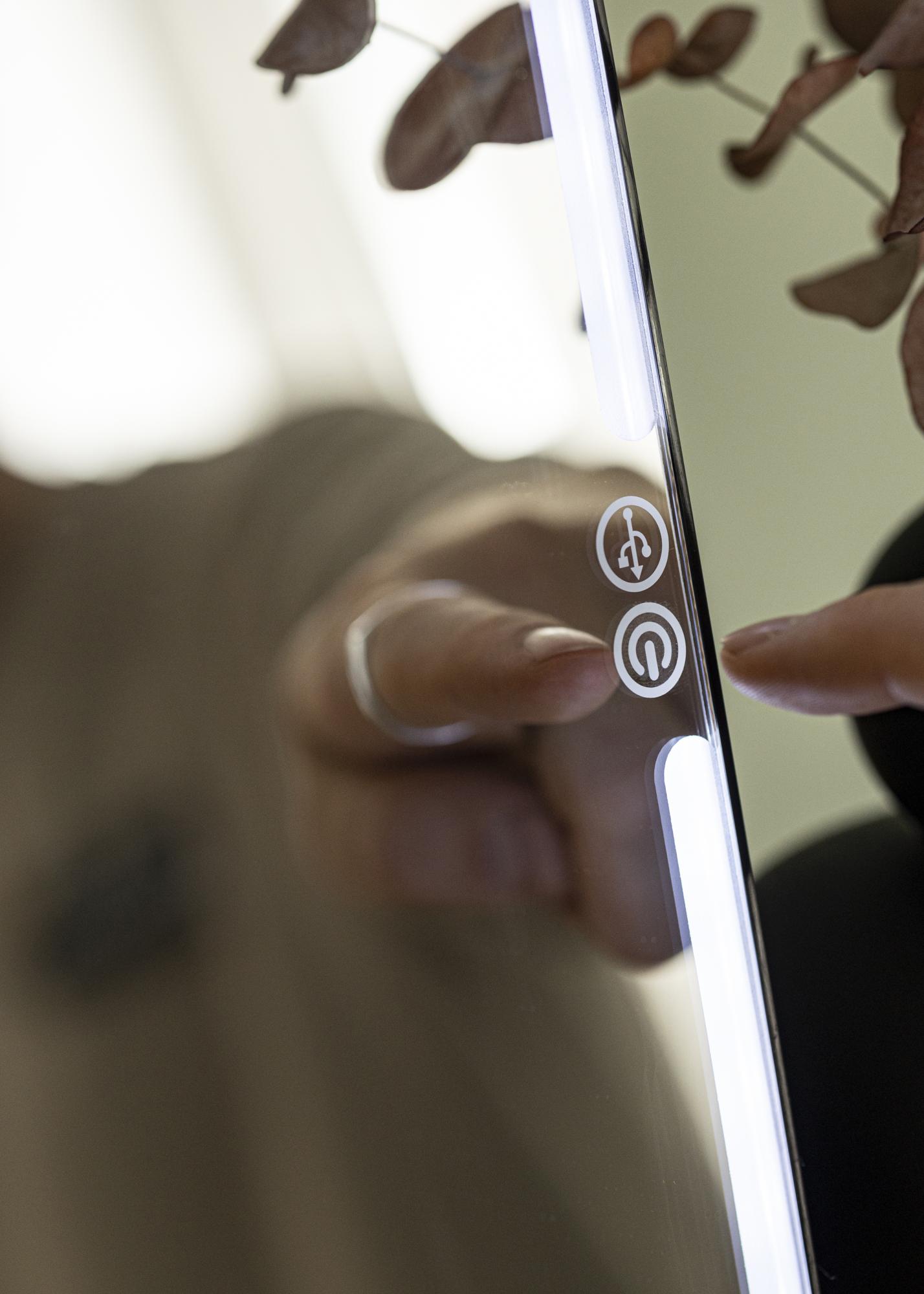 Denna sminkspegel har stilren svart färg och inbyggd LED-belysning. Belysningen justeras med hjälp av touch-knappar vid spegelns ram, med vilka du även slår på och av spegeln. Stänger du spegeln i påslaget läge sätts den automatiskt i strömsparläge, för att sedan börja lysa igen när du åter öppnar spegeln. Spegeln drivs på batteri och laddas via USB-anslutning.
