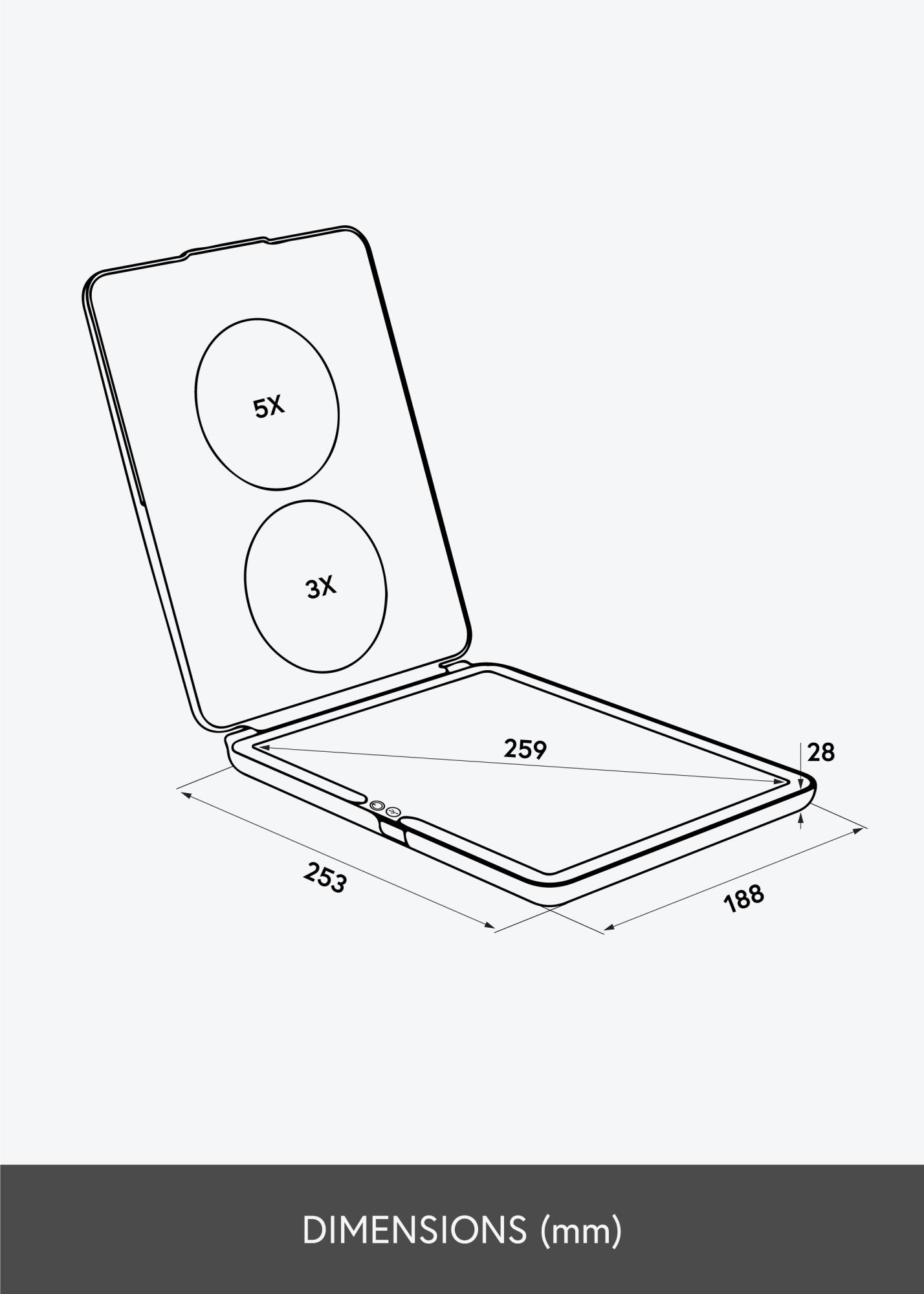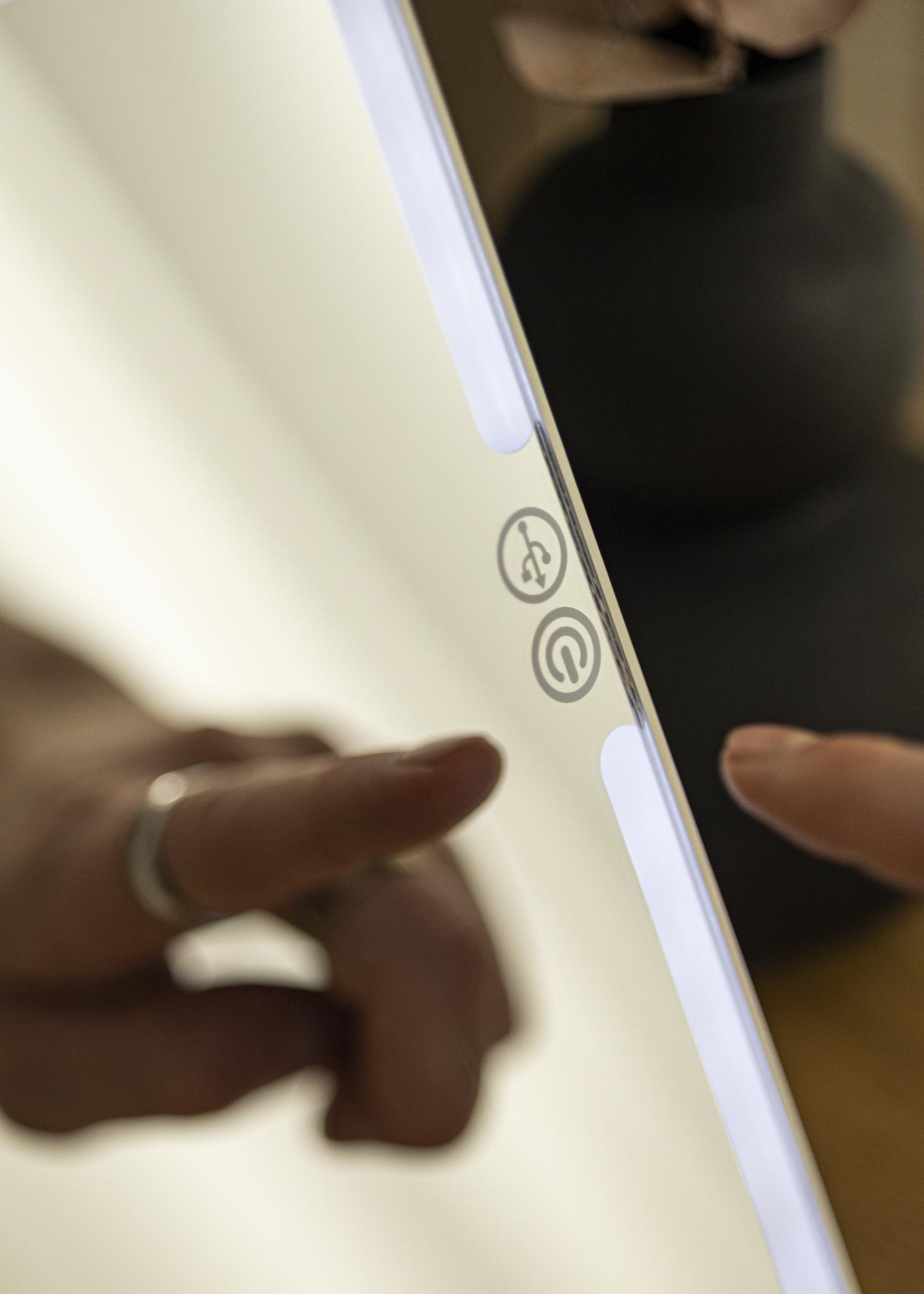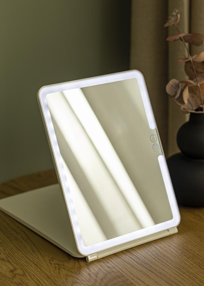 Detta är en sminkspegel i mindre format, med en smart vikbar design som gör att du enkelt kan vinkla spegeln vid användning. Den hopfällbara designen sparar även plats samt skyddar spegelytan när spegeln ligger i väskan. Det är en utmärkt spegel att ha med när du är ute och reser då den är både kompakt, lätt och har inbyggd belysning som ger ett jämnt sken på ditt ansikte när du speglar dig. Belysningen tänds och släcks med hjälp av en touch-knapp vid spegelns ram. Håller du på knappen i några sekunder kan du dimra ljuset samt ställa in färgtemperaturen.