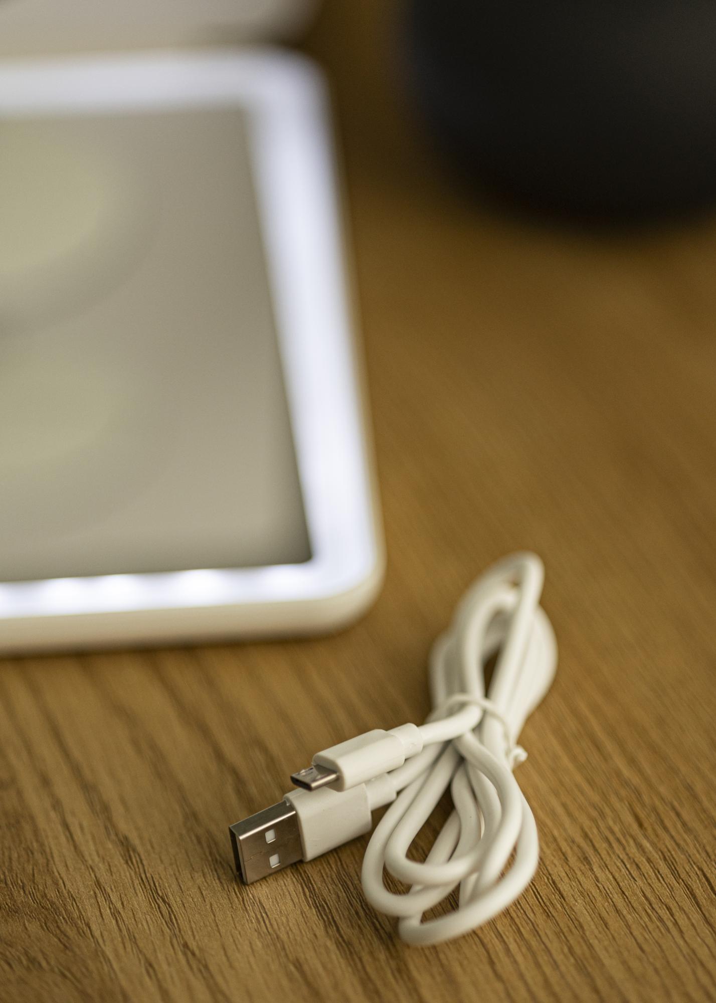När den tända spegeln fälls ihop sätts den automatiskt i strömsparläge tills du åter öppnar spegeln igen. Denna sminkspegel är batteridriven och laddas upp via USB-anslutning.
