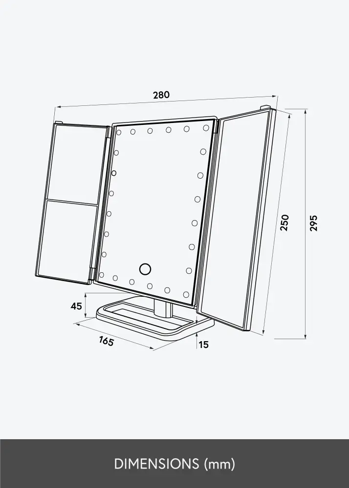 Spegeln har en stående design och en trendig nyans av roséguld. Spegelns sidor kan vikas in, vilket gör att du enkelt kan vinkla sidorna vid användning. För att du ska kunna fokusera bättre när du applicerar din makeup har spegeln 2x, 3x och 10x zoom. Zonerna med zoom-funktion är placerade på de mindre spegelytorna på spegelns sidor.