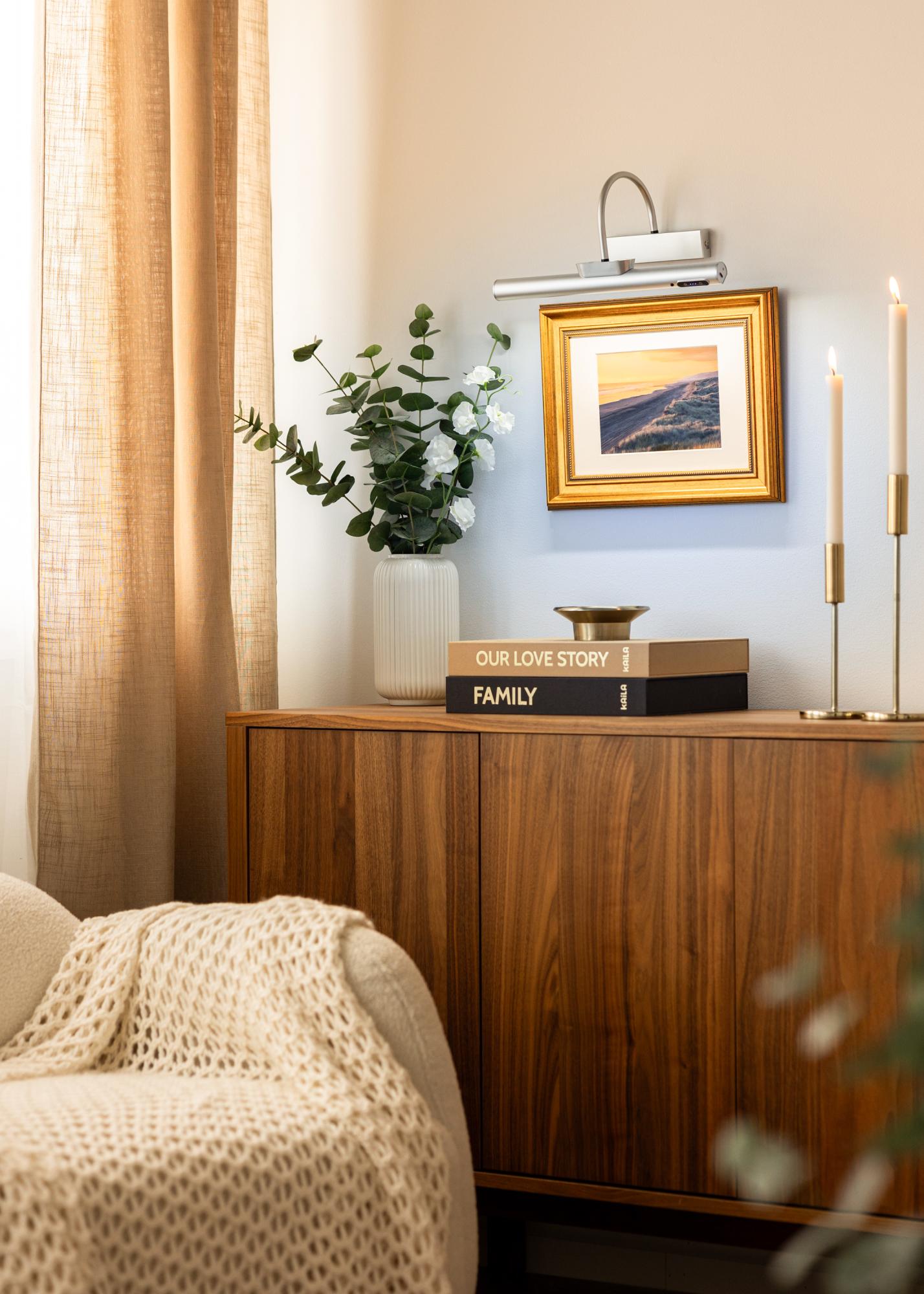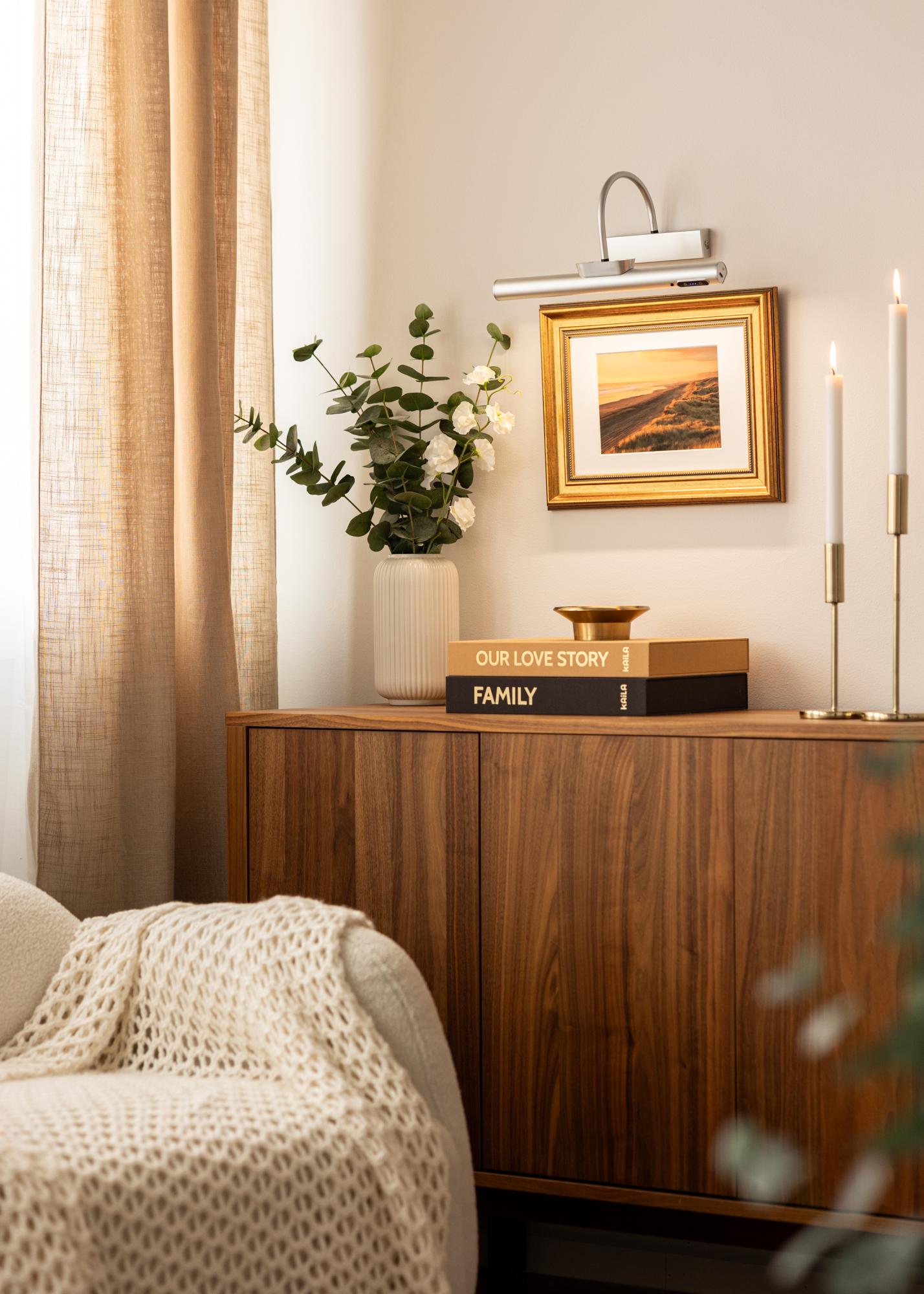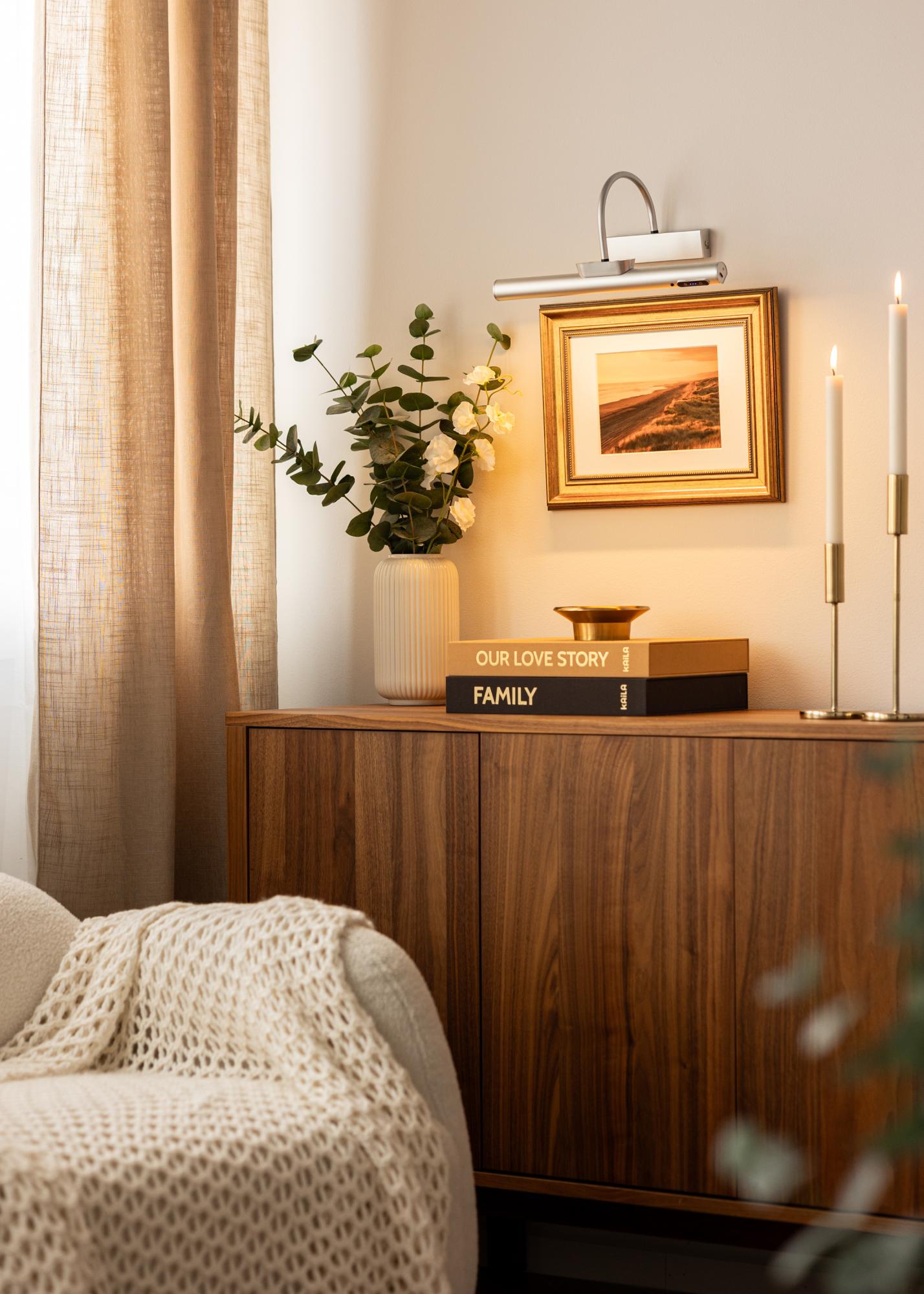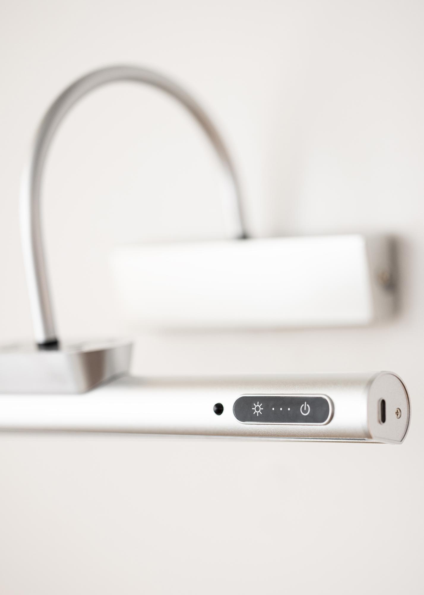 Denna batteridrivna tavelbelysning erbjuder en stilren och flexibel lösning för att belysa dina konstverk utan krånglet med sladdar. Med sin eleganta silverfärg smälter den in i de flesta miljöer, oavsett om du vill belysa ett fotografi, en tavla eller en annan typ av väggkonst. Dess största fördel är att du kan placera den var som helst, utan att behöva tänka på närheten till ett eluttag.