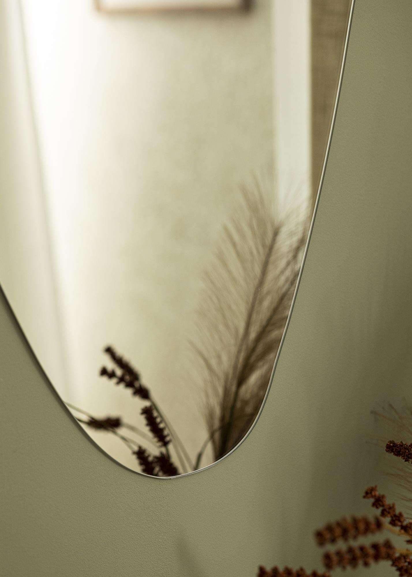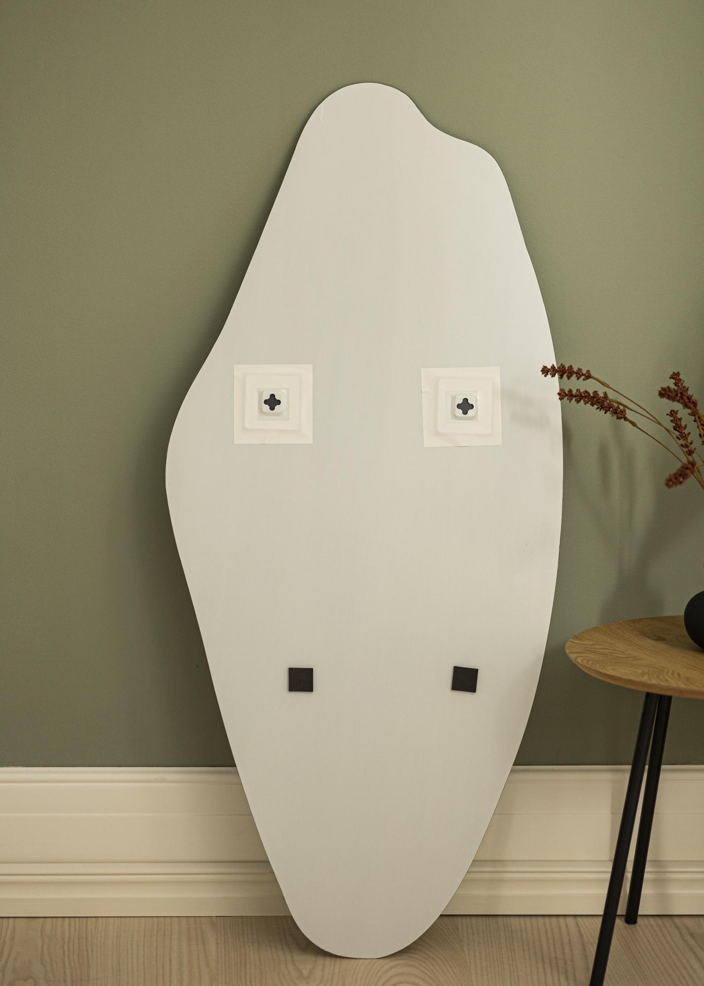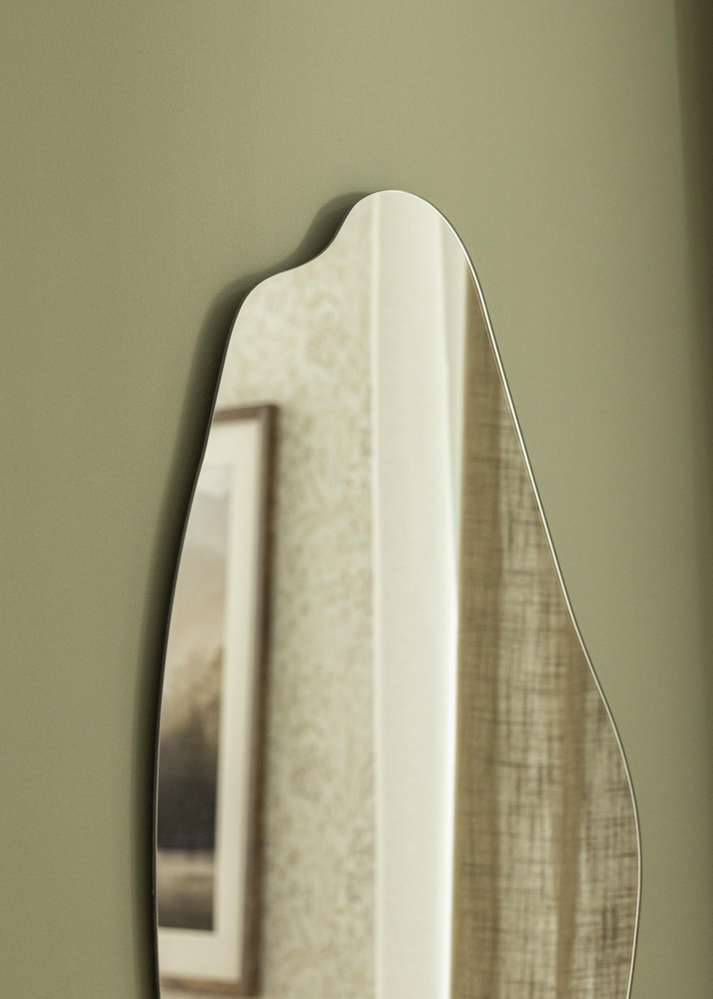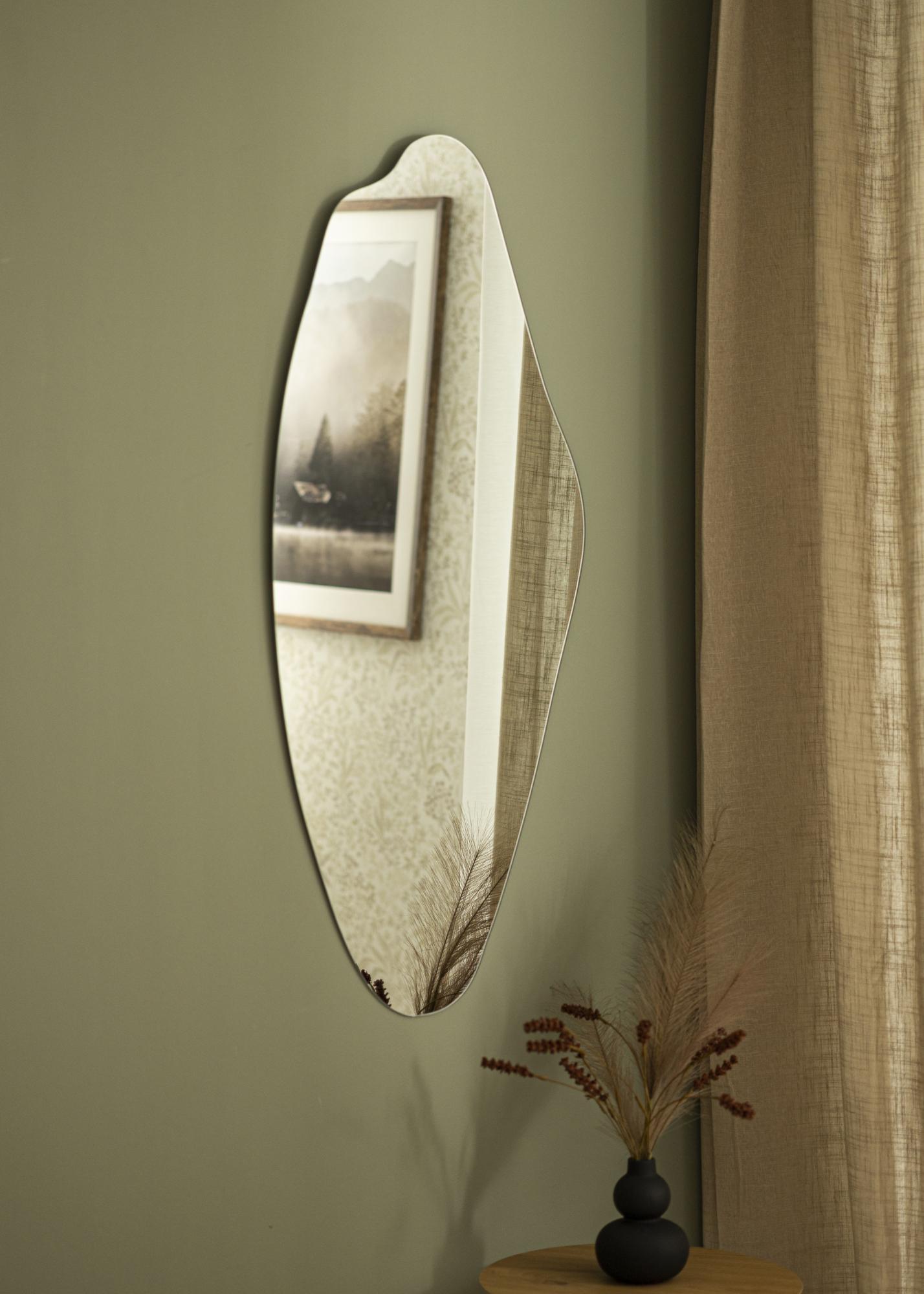 Detta är en avlång spegel med en vacker asymmetrisk form, vilket gör den till en spännande inredningsdetalj som passar perfekt i det moderna hemmet. Spegeln har praktiska väggfästen på baksidan och hängs upp på väggen i det rum du önskar – den passar till och med för användning i badrummet!