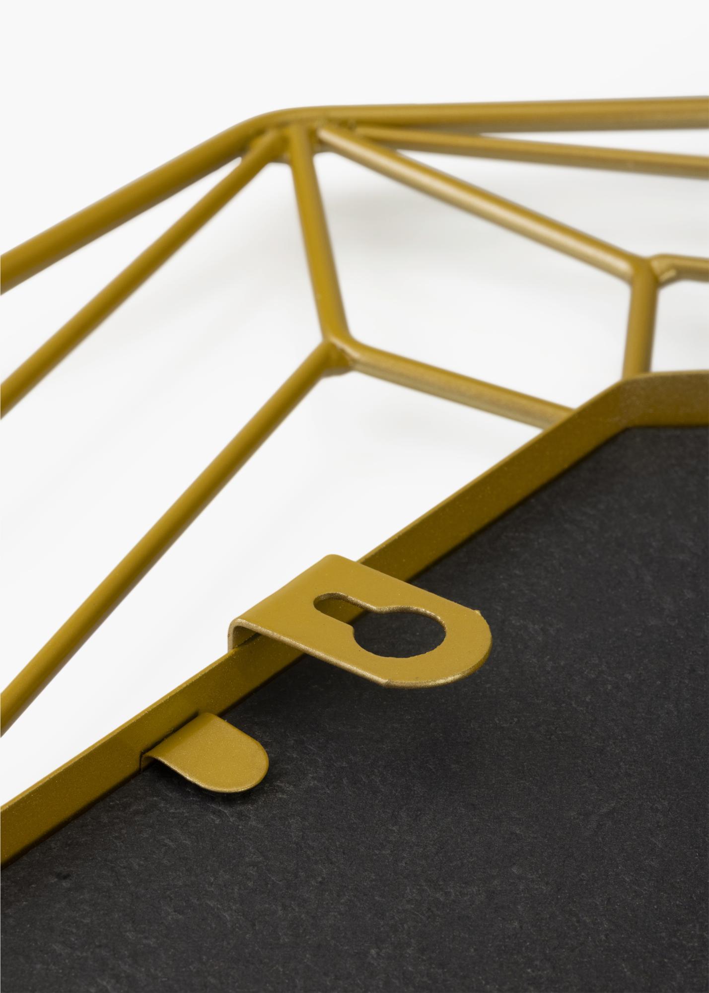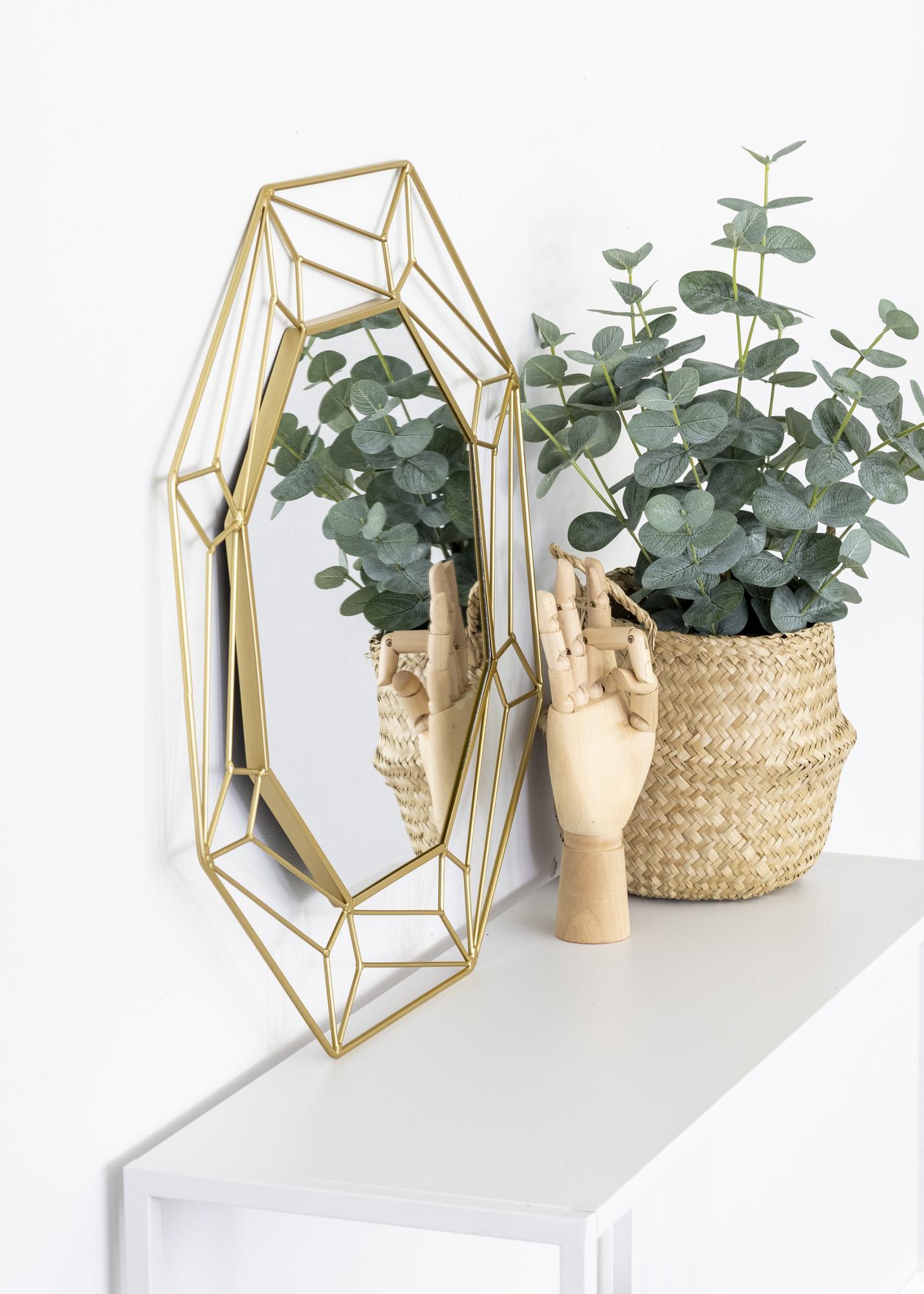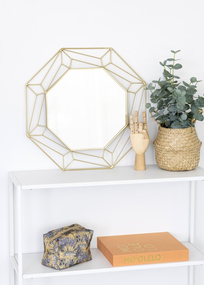 Det här är en spegel i en snygg abstrakt design från KAILA! Runt den hexagonformade spegelytan i mitten går en kant tillverkad i mässingfärgad metall som bildar ett snyggt mönster. Den guldiga nyansen ger den här spegeln en lyxig touch och passar därför extra bra för dig som vill ha ett stilfullt och elegant inrett hem! Spegeln mäter 50x50 cm och är tillverkad i metall. På spegelns baksida sitter väggfästen.