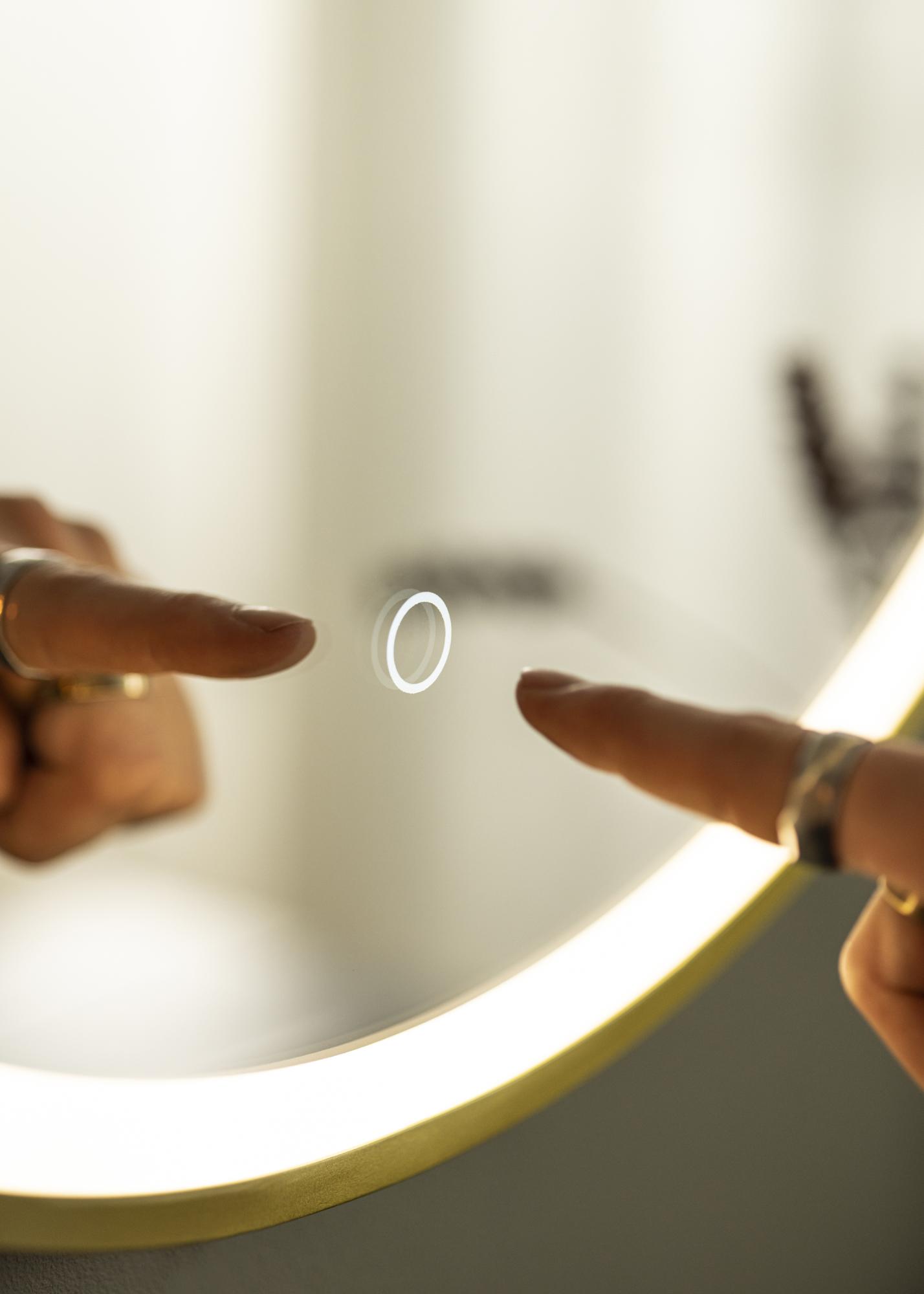 Detta är badrumsspegeln för dig som vill ha en unik spegel som sätter guldkant på ditt badrum. Den har en trendig design med rund form, guldram och guldfärgat vägghänge. För att spegeln ska hänga stabilt monteras den upp i väggfästen på baksidan såväl som i det övre vägghänget. Spegeln är avsedd för fast installation och kopplas mot en strömbrytare. För att spegeln ska fungera korrekt ska den kopplas till en vanlig strömbrytare, inte en dimmerströmbrytare.