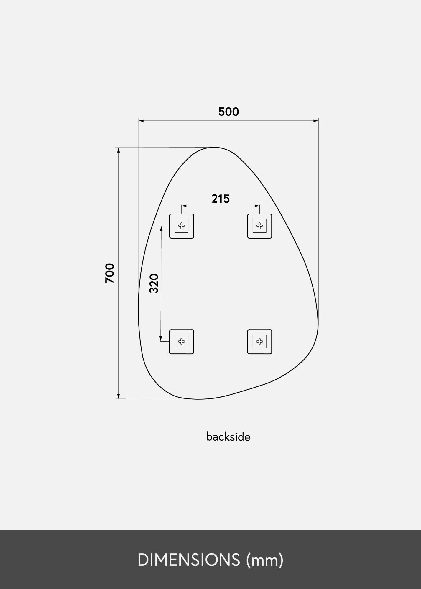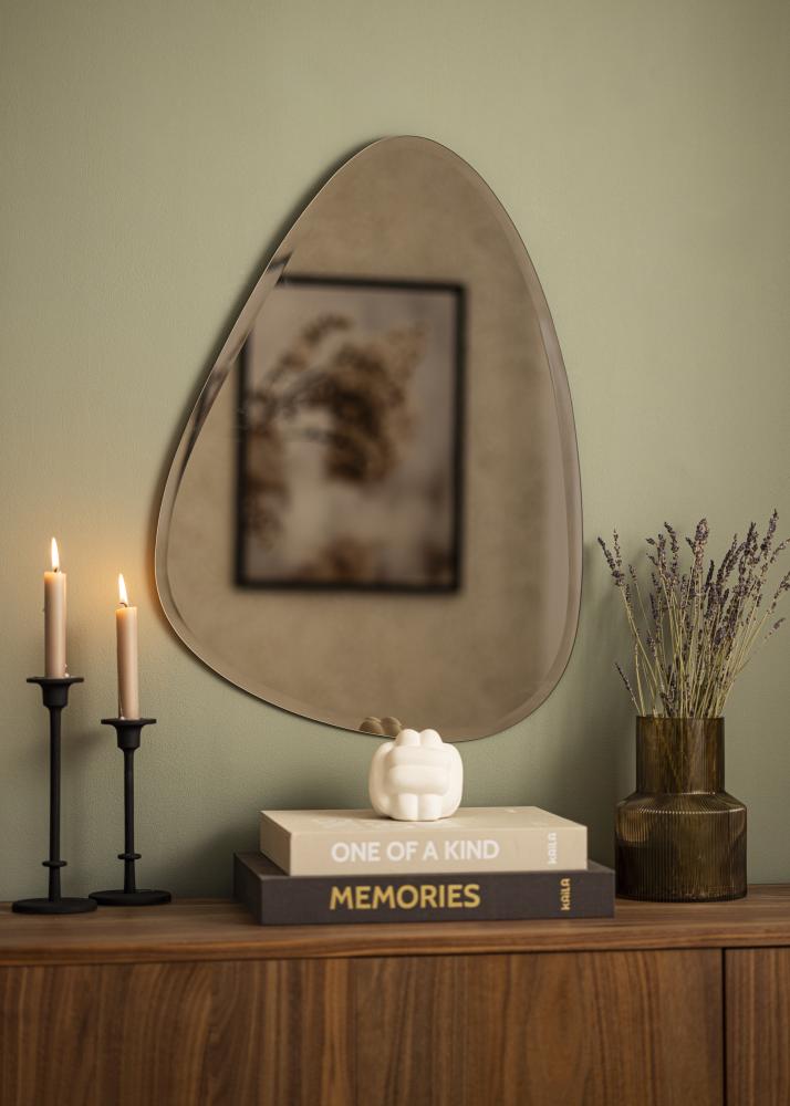 Detta är en asymmetrisk väggspegel från KAILA, med ett modernt bronstonat spegelglas. En spegel med ett mörkare spegelglas blir en dramatisk detalj som passar utmärkt i moderna hem. Den tunna spegeln har ingen ram. Istället pryds spegelytans kanter av en elegant fasettslipad kant.