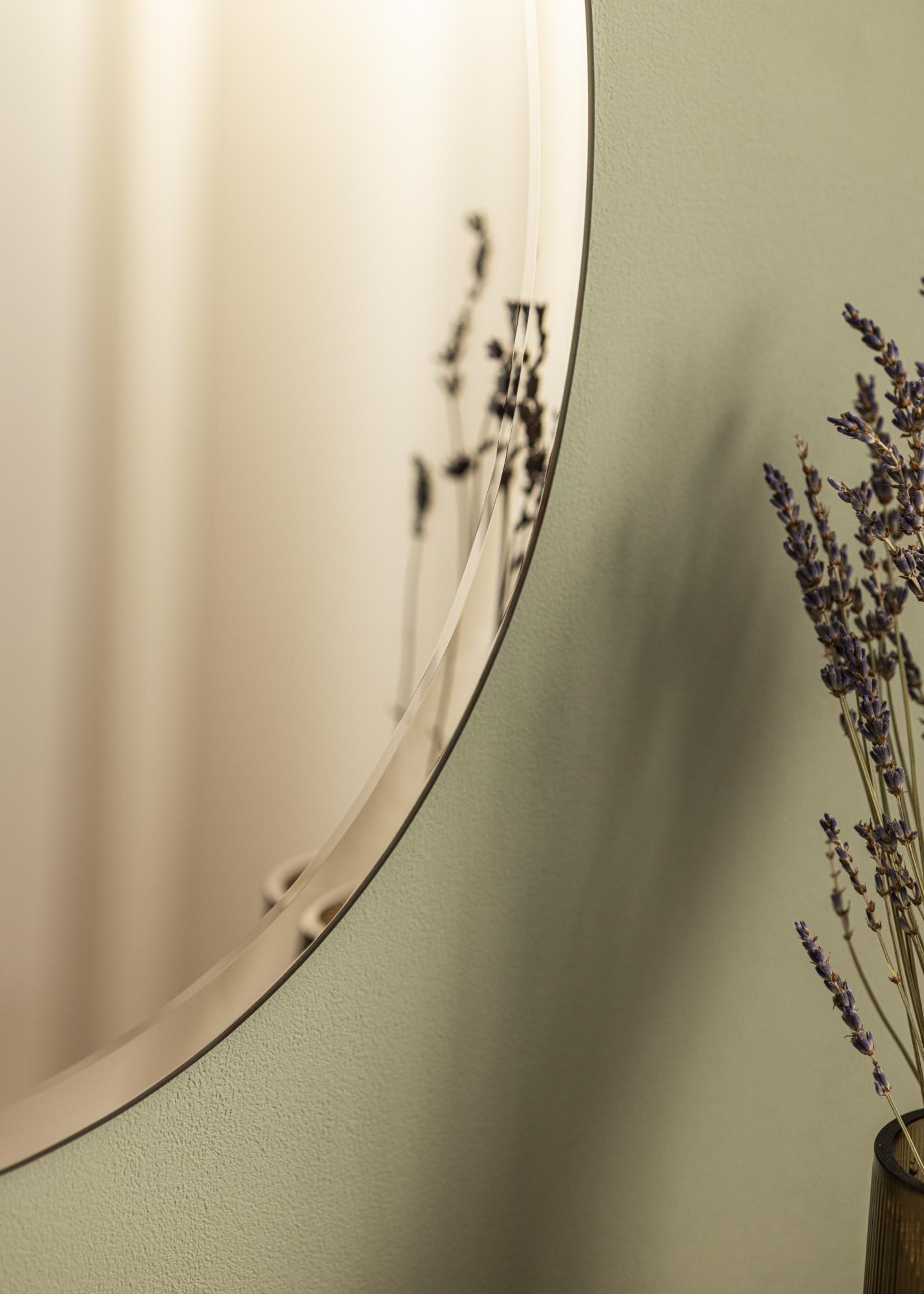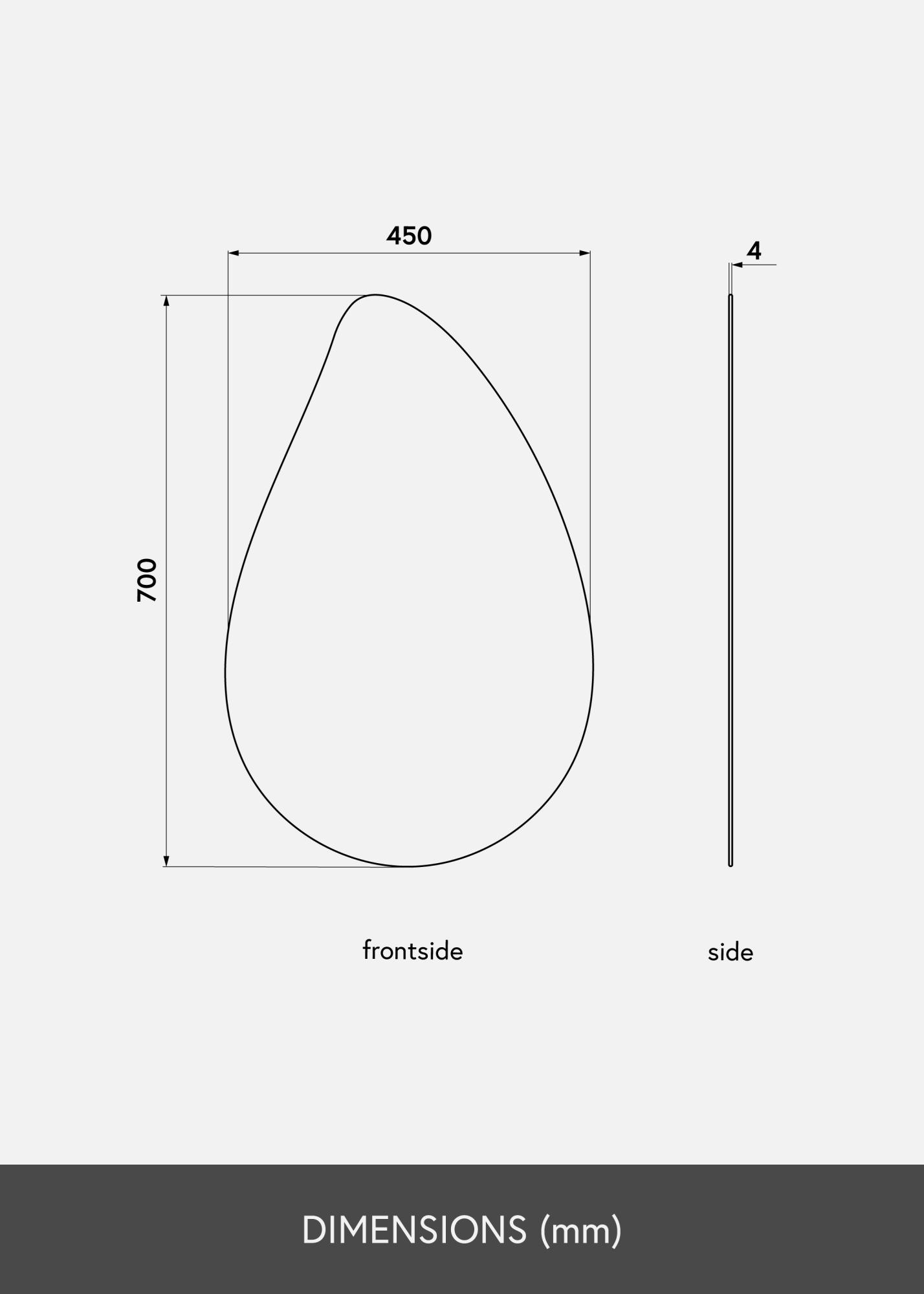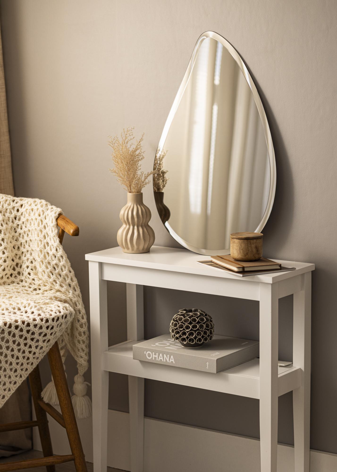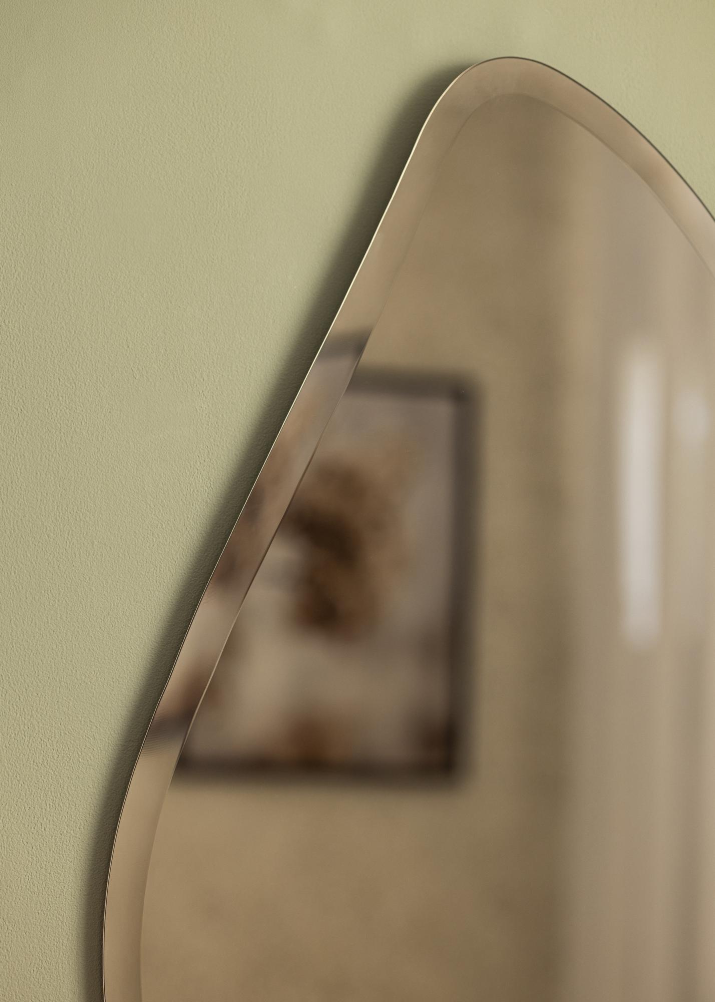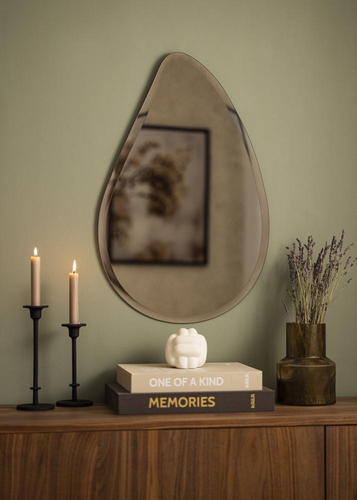 Detta är en trendigt droppformad spegel med ett ännu trendigare spegelglas, tonat i en elegant nyans av mörk brons. Det tonade spegelglaset ger stor effekt och den vackra bronsfärgen är enkel att matcha med många olika färgscheman på inredning. Spegeln är mycket tunn och har ingen ram, vilket i kombination med den lyxigt fasettslipade kanten, ytterligare förstärker den eleganta och moderna framtoningen. Det är en mycket dekorativ väggspegel som garanterat drar åt sig blickar vilket rum den än placeras – i vardagsrum såväl som i hall eller sovrum.