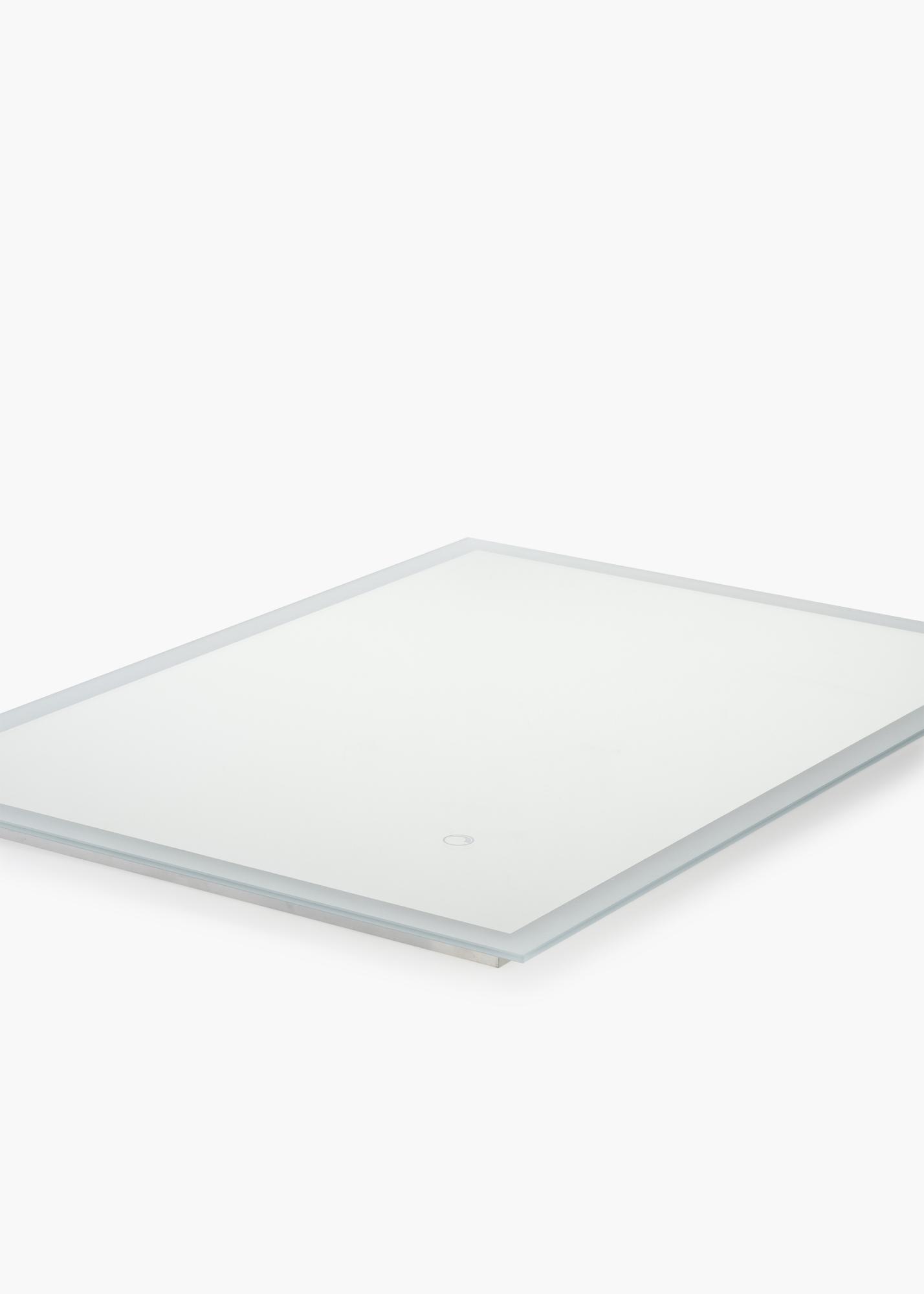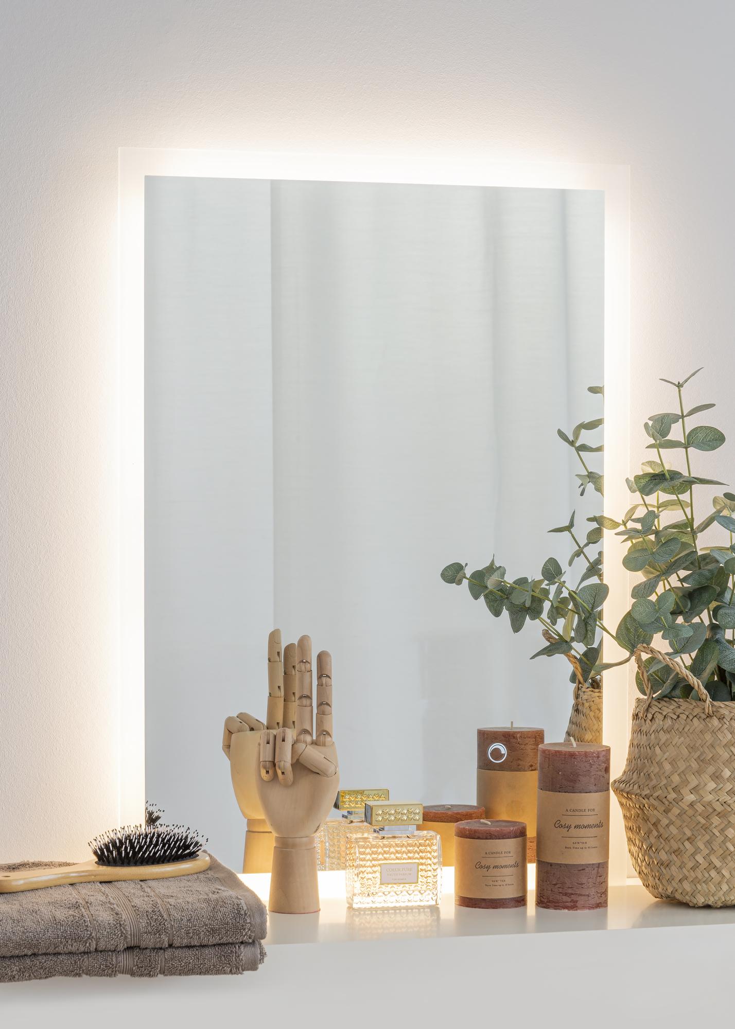 Denna snygga spegel i svensk design från KAILA går i en rektangulär form och har frostade kanter. Bakom de stilfulla kanterna har spegeln en integrerad LED belysning som snyggt lyser upp spegeln och ger ett varmt vitt ljus i 3000K. Belysningen är dimbar och du justerar enkelt styrkan genom att hålla in touch-knappen på skärmen i några sekunder. Sminkspegeln kommer automatiskt ihåg den senaste ljusinställningen nästa gång som du slår på den. LED är en energisnål ljuskälla som ger ett jämnt och naturligt ljus.
