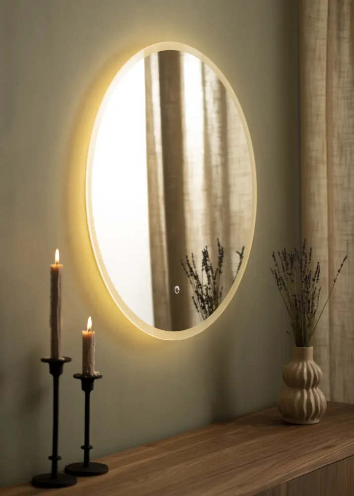 Detta är en klassisk och snygg rund badrumsspegel. Spegeln ramas in av en frostad kant med integrerad LED belysning. Belysningen lyses upp bakom spegeln och ger ett behagligt varmvitt sken framåt i 3000K. Belysningen är dimbar och du kan enkelt justera belysningens styrka genom att hålla in knappen i några sekunder. Nästa gång du tänder belysningen så kommer spegeln ihåg vilken ljusstyrka den var inställd på. Spegeln har tillhörande väggfästen och är godkänd för badrum. Badrumsspegeln är avsedd för fast installation och kopplas mot en strömbrytare.