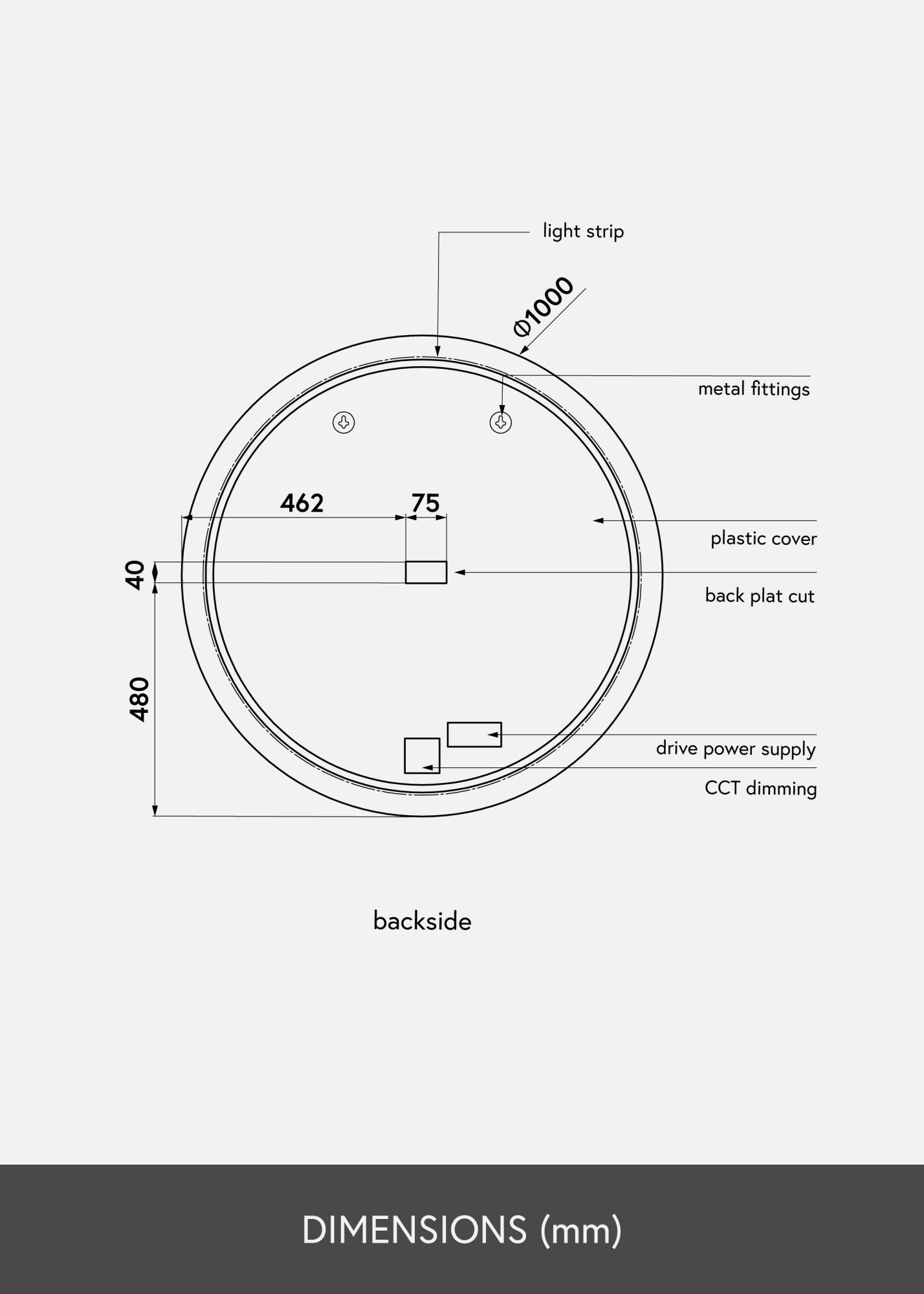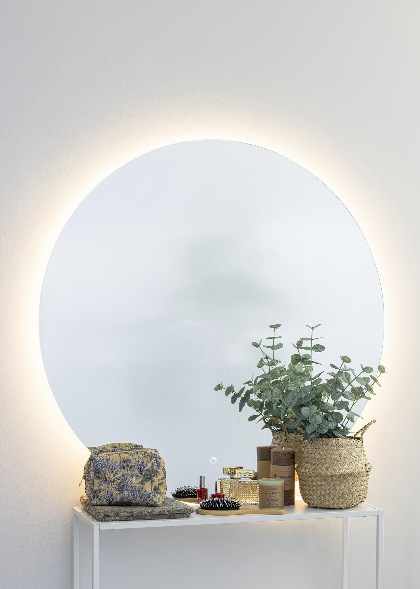 Spegeln är godkänd för badrum men dess tidlösa och eleganta utformning gör sig även fin på andra väggar i hemmet. Spegeln mäter 100 cm i diameter, är endast 3 cm djup och har väggfästen. Spegeln är avsedd för fast installation och kopplas mot en strömbrytare. För att spegeln ska fungera korrekt ska den kopplas till en vanlig strömbrytare, inte en dimmerströmbrytare.