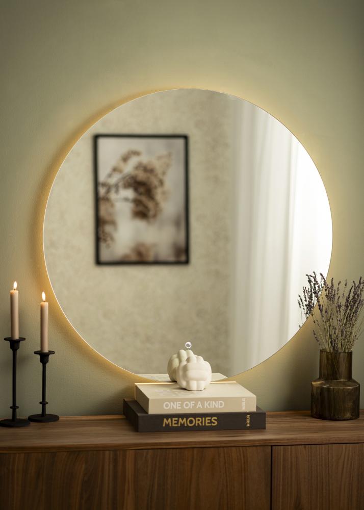 Detta är en klassisk badrumsspegel i rund form från svenska KAILA. Badrumsspegeln har integrerad dimbar LED belysning runt om som lyses upp bakom och ger ett fint varmt vitt sken framåt i 3000K. Belysningen är dimbar och du kan enkelt justera belysningens styrka genom att hålla in knappen i några sekunder. Nästa gång du startar belysningen så kommer spegeln ihåg vilken ljusstyrka den var inställd på. LED är en energisnål ljuskälla som ger ett jämnt och naturligt ljus.