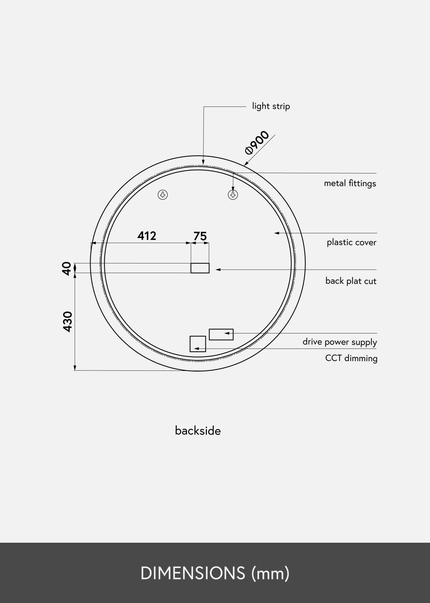 Spegeln är godkänd för badrum men dess tidlösa och eleganta utformning gör sig även fin på andra väggar i hemmet. Spegeln mäter 90 cm i diameter, är endast 3 cm djup och har väggfästen. Spegeln är avsedd för fast installation och kopplas mot en strömbrytare. För att spegeln ska fungera korrekt ska den kopplas till en vanlig strömbrytare, inte en dimmerströmbrytare.