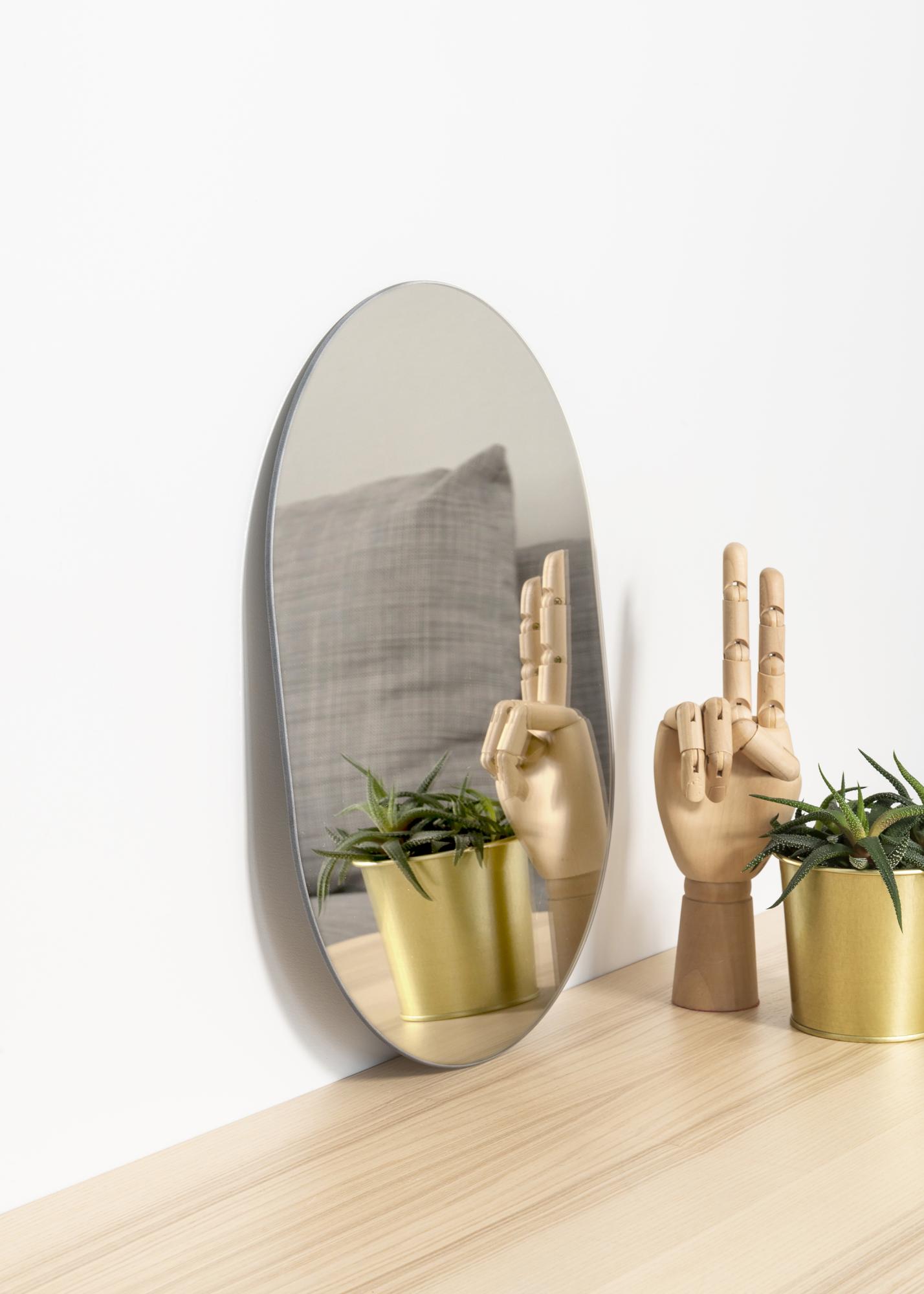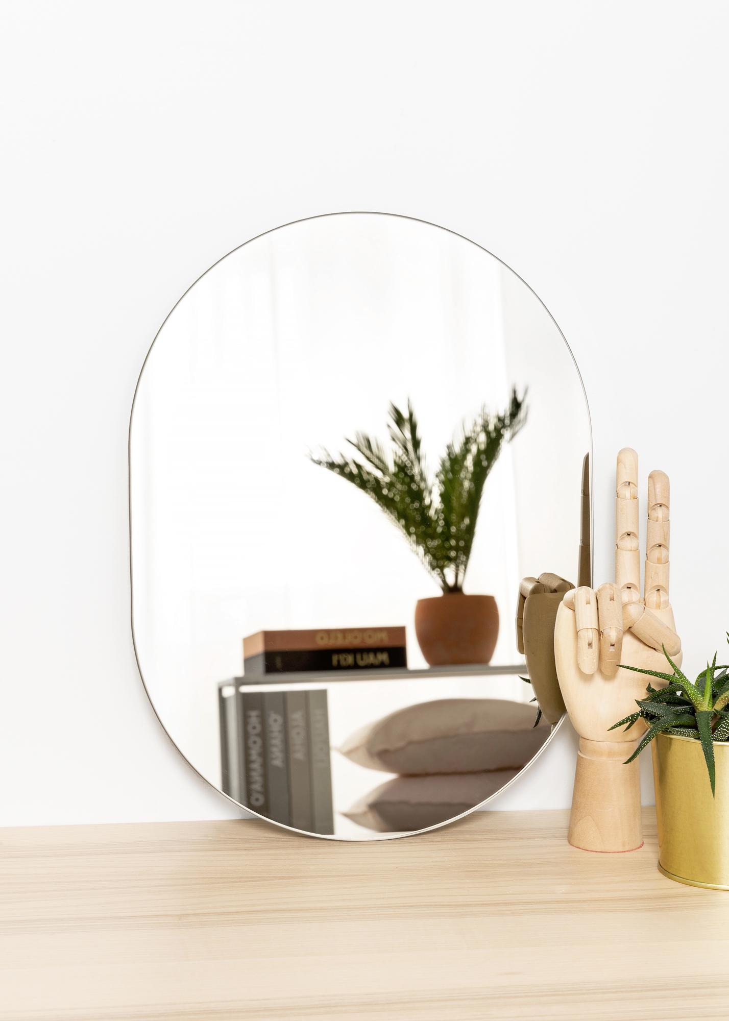 En oval spegel har lika praktiska dimensioner som en rektangulär spegel, men har ändå samma elegans som en rund spegel – en alldeles utmärkt spegelform med andra ord! Denna ovala spegel är dessutom väldigt tunn och har ingen ram, vilket ytterligare förstärker den eleganta framtoningen.