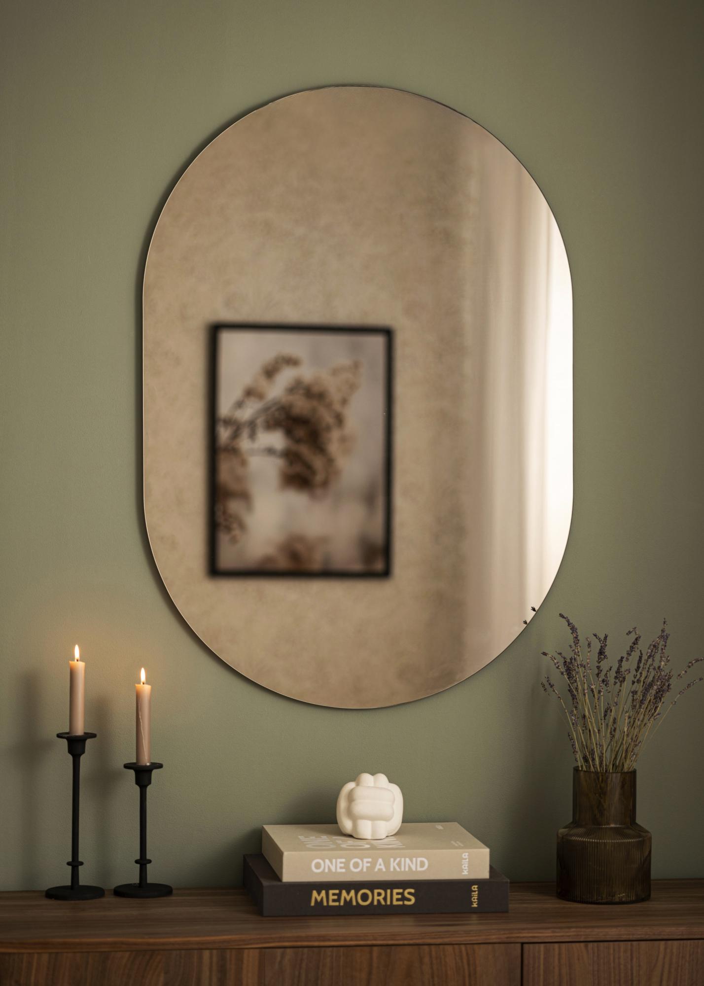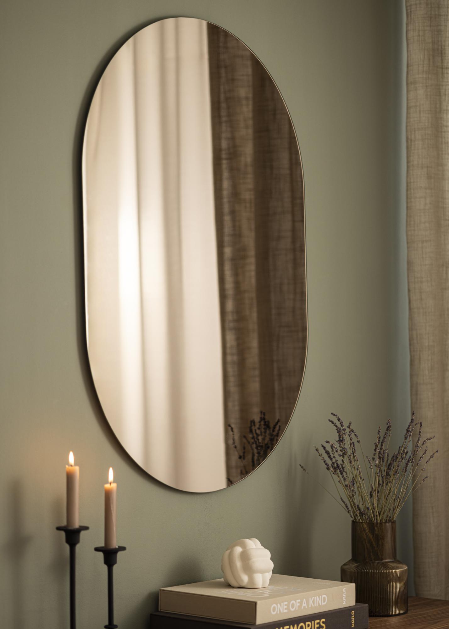 En oval spegel ger ett mjukt och elegant intryck i ditt hem. Just denna ovala spegel har dessutom ett spegelglas tonat i en stilfull nyans av mörk brons. Denna effektfulla och trendiga detalj kombineras med en smäcker design då spegeln är mycket tunn och inte är försedd med någon ram. Resultatet blir en iögonfallande, modern och elegant inredningsdetalj att placera i vilket rum som helst där du vill addera funktion och trendig svensk design!