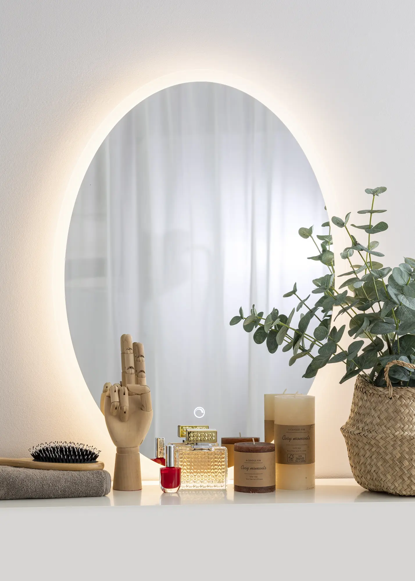 Detta är verkligen en badrumsspegel i en elegant design med dess ovala form och integrerade LED belysning! Den integrerade LED belysningen är dimbar och styrkan justeras enkelt genom att trycka på den vattentäta touch-knappen på skärmen. Belysningen lyses upp i en varmvit nyans i 3000K bakom spegeln och ger ett fint sken framåt. LED är en energisnål ljuskälla som ger ett jämnt och naturligt ljus. Spegeln är godkänd för badrum. Badrumsspegeln är avsedd för fast installation och kopplas mot en strömbrytare. För att spegeln ska fungera korrekt ska den kopplas till en vanlig strömbrytare, inte en dimmerströmbrytare.