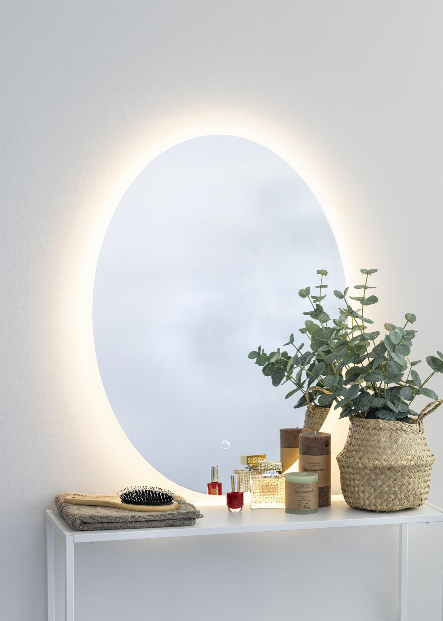 Detta är verkligen en badrumsspegel i en elegant design med dess ovala form och integrerade LED belysning! Den integrerade LED belysningen är dimbar och styrkan justeras enkelt genom att trycka på den vattentäta touch-knappen på skärmen. Belysningen lyses upp i en varmvit nyans i 3000K bakom spegeln och ger ett fint sken framåt. LED är en energisnål ljuskälla som ger ett jämnt och naturligt ljus. Spegeln är godkänd för badrum. Badrumsspegeln är avsedd för fast installation och kopplas mot en strömbrytare. För att spegeln ska fungera korrekt ska den kopplas till en vanlig strömbrytare, inte en dimmerströmbrytare.