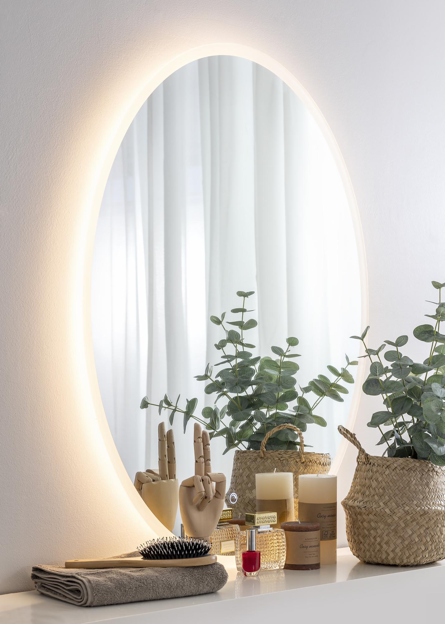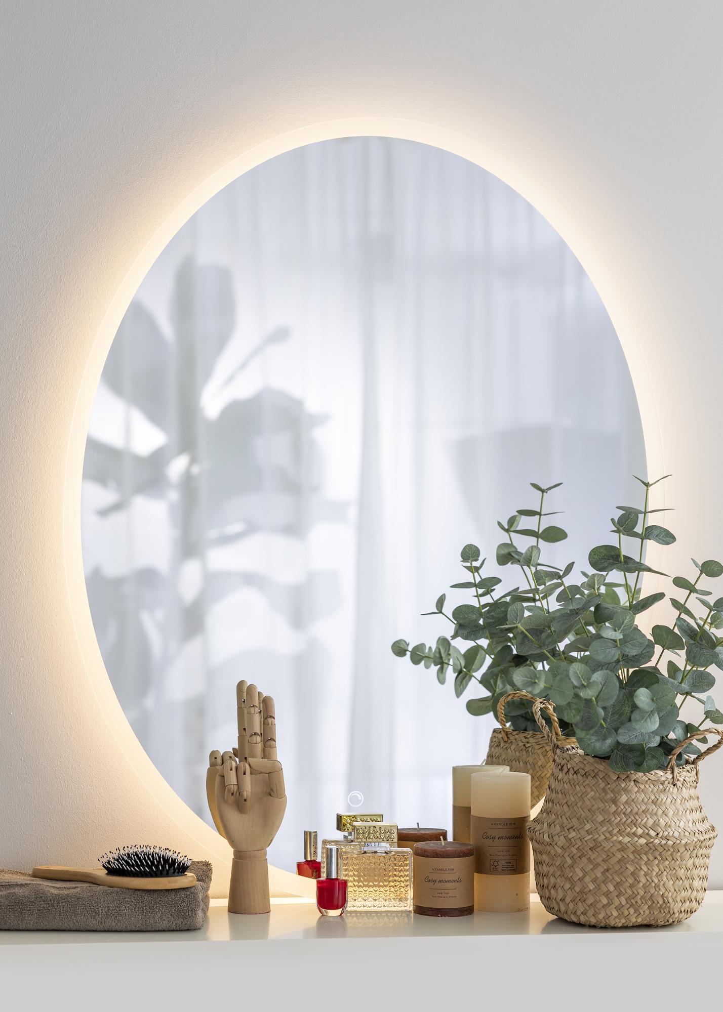 Detta är verkligen en badrumsspegel i en elegant design med dess ovala form och integrerade LED belysning! Den integrerade LED belysningen är dimbar och styrkan justeras enkelt genom att trycka på den vattentäta touch-knappen på skärmen. Belysningen lyses upp i en varmvit nyans i 3000K bakom spegeln och ger ett fint sken framåt. LED är en energisnål ljuskälla som ger ett jämnt och naturligt ljus. Spegeln är godkänd för badrum. Badrumsspegeln är avsedd för fast installation och kopplas mot en strömbrytare. För att spegeln ska fungera korrekt ska den kopplas till en vanlig strömbrytare, inte en dimmerströmbrytare.