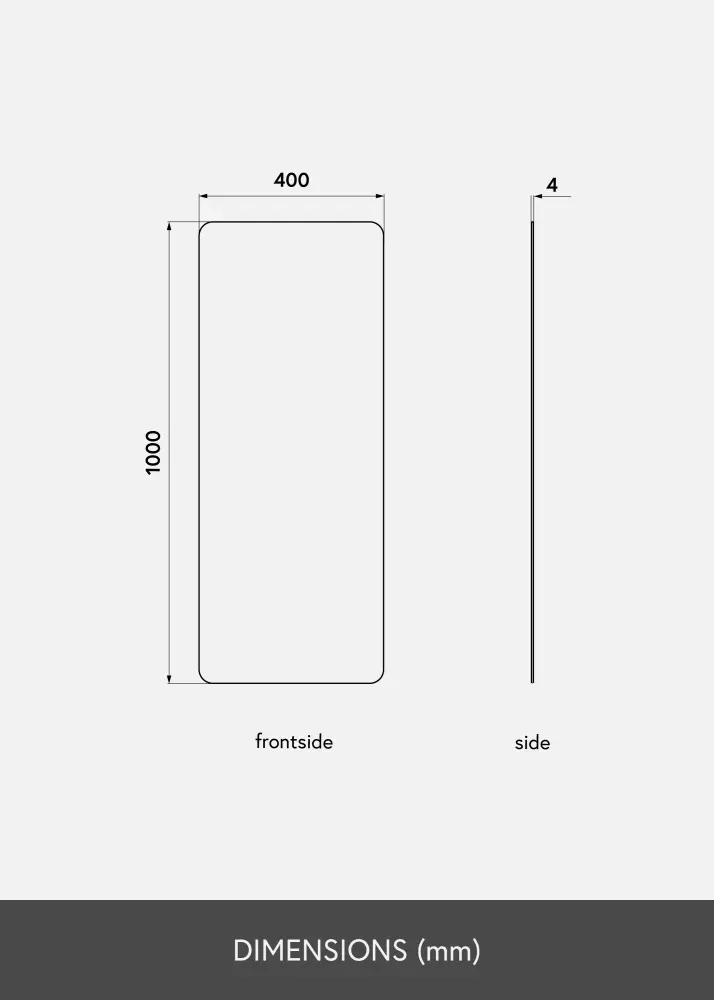 Denna rektangulära spegel har dekorativt rundade hörn, vilket mjukar upp intrycket och adderar en känsla av elegans. Spegeln är endast 4 mm tunn och har inte försetts med någon ram, vilket ger den en stilren och minimalistisk framtoning.