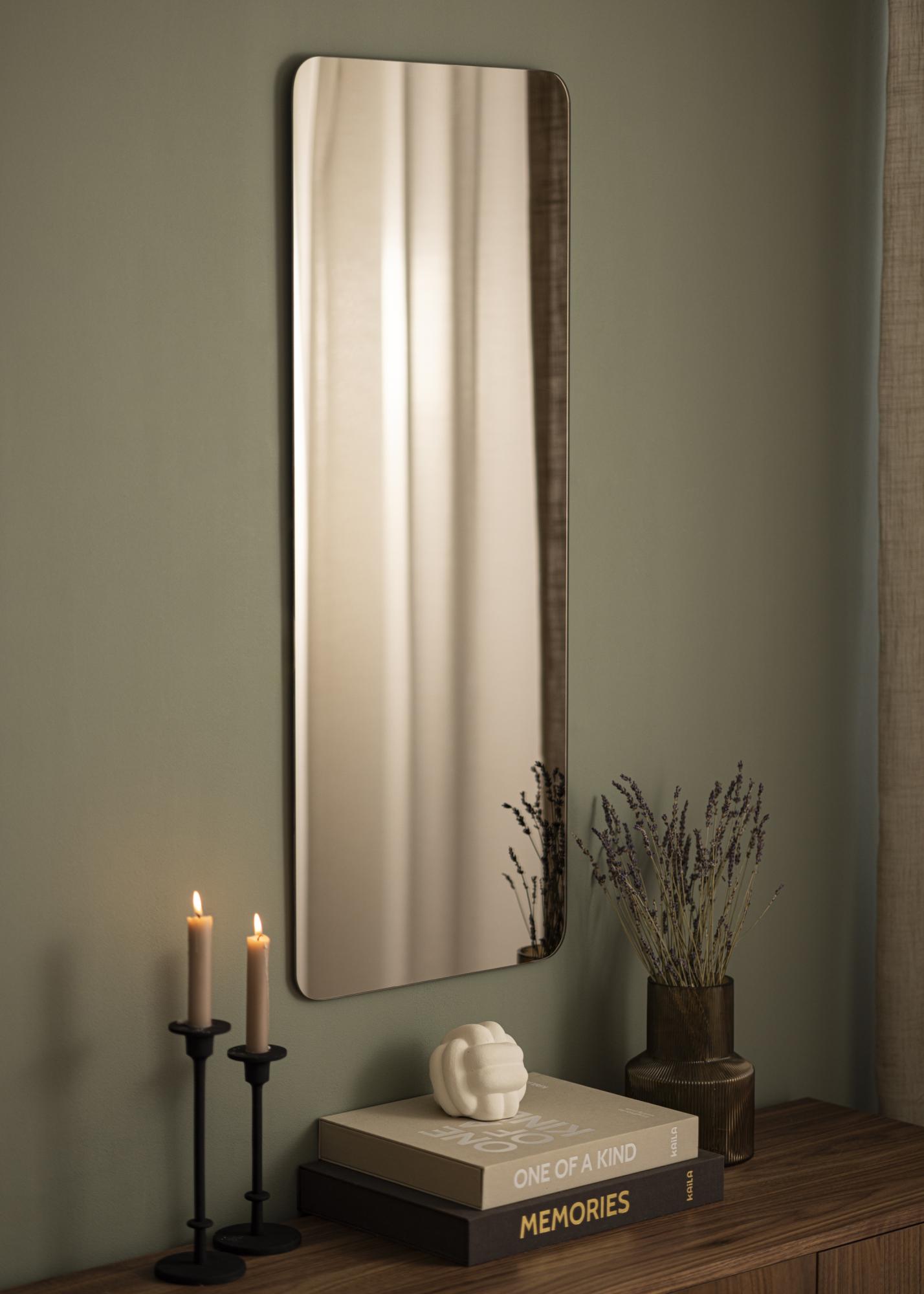 Detta är en rektangulär spegel med dekorativt rundade hörn som ger den ett mjukt och elegant intryck. Spegelglaset är tonat i en stilfull nyans av mörk brons, vilket gör denna spegel till en effektfull och trendig inredningsdetalj i ditt hem. Spegeln är dessutom väldigt tunn och har ingen ram, vilket ytterligare bidrar till dess smäckra, stilrena känsla.