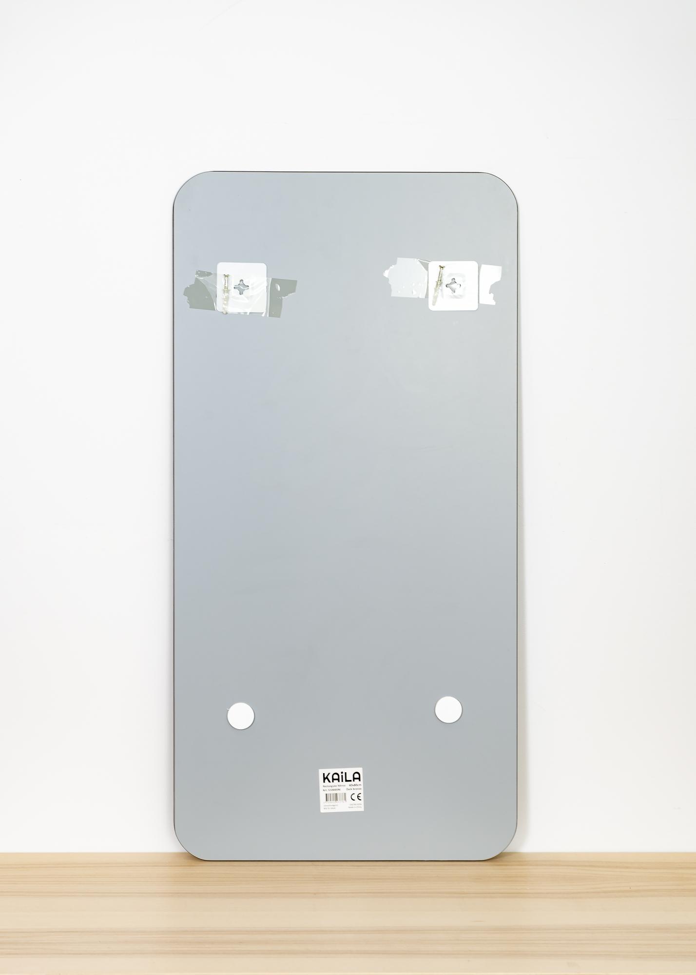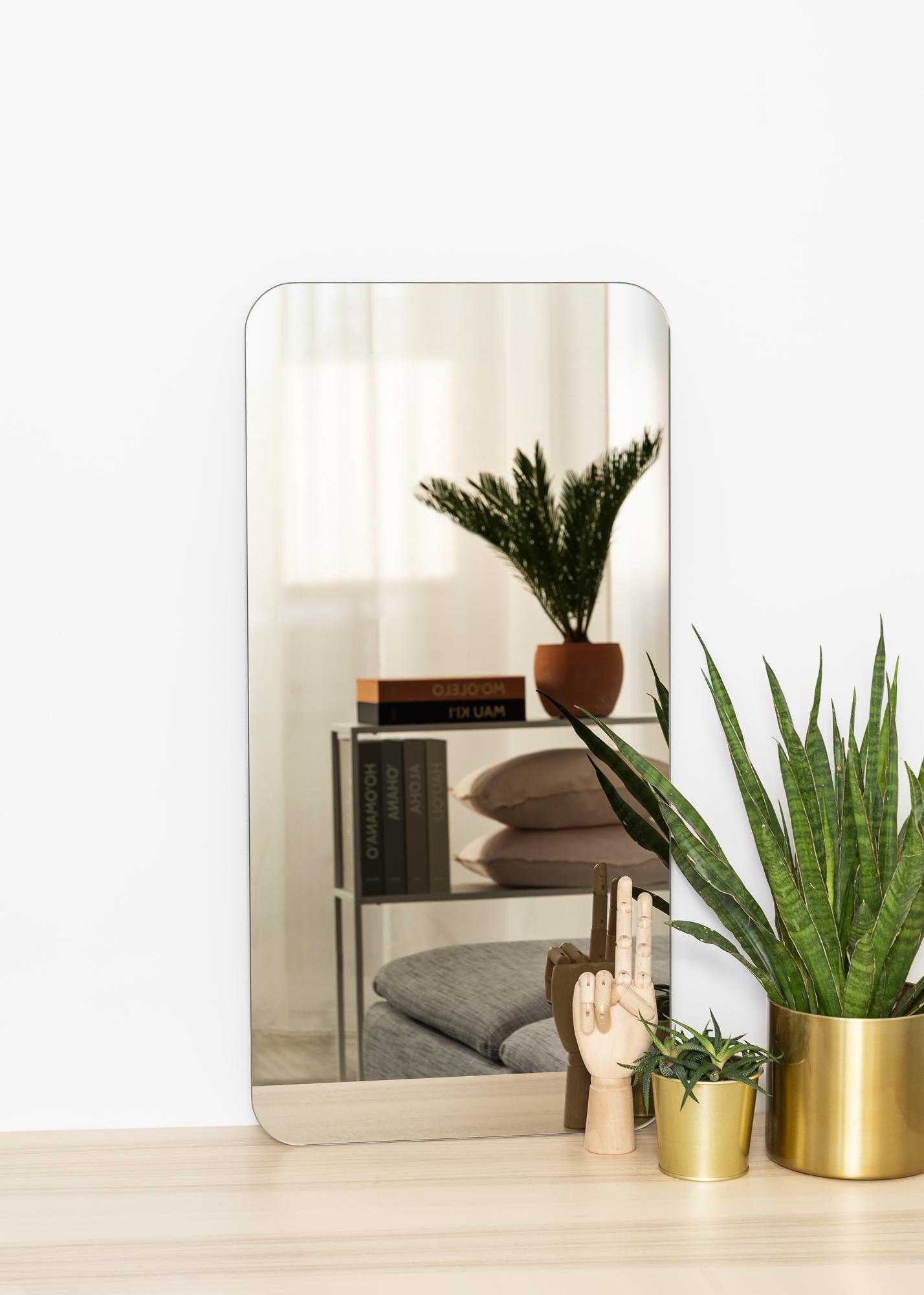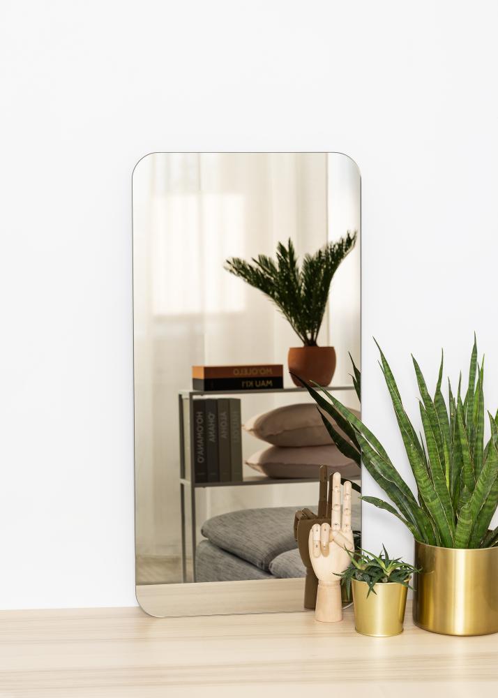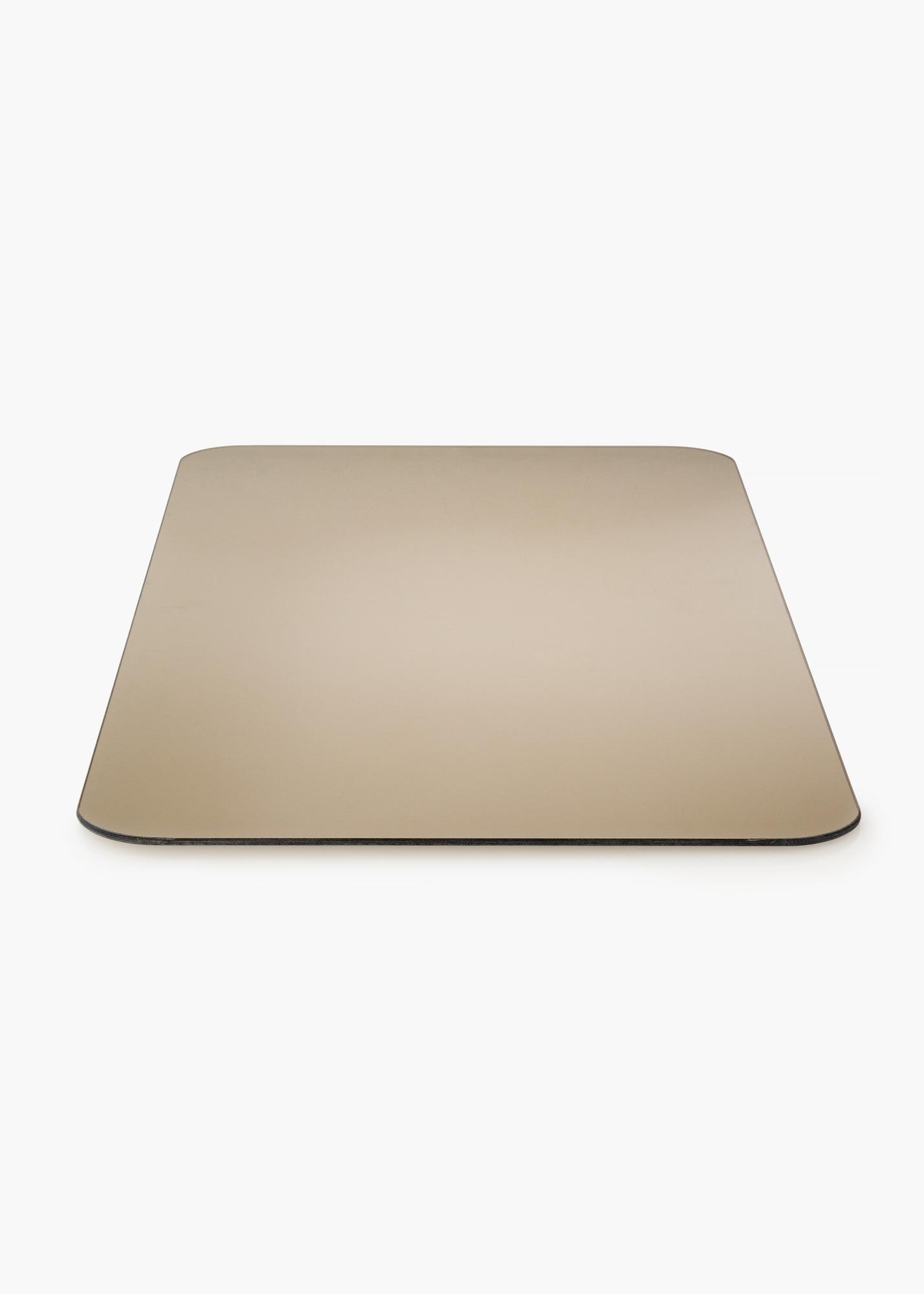 Detta är en rektangulär spegel med dekorativt rundade hörn som ger den ett mjukt och elegant intryck. Spegelglaset är tonat i en stilfull nyans av mörk brons, vilket gör denna spegel till en effektfull och trendig inredningsdetalj i ditt hem. Spegeln är dessutom väldigt tunn och har ingen ram, vilket ytterligare bidrar till dess smäckra, stilrena känsla.