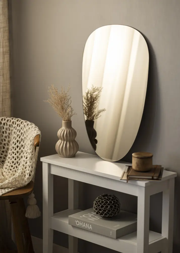 Detta är en asymmetrisk spegel med mjuka former och en mycket elegant och trendig framtoning. Spegelglaset är tonat i en stilfull nyans av mörk brons, som gör den till en effektfull inredningsdetalj som enkelt matchas med många olika färgscheman på inredning. Spegeln är också väldigt tunn och har ingen ram, vilket ytterligare förstärker den stilrena och trendiga känslan. Placera spegeln i hallen, vardagsrummet, sovrummet – eller i vilket rum som helst där du vill addera funktion och elegant svensk design!