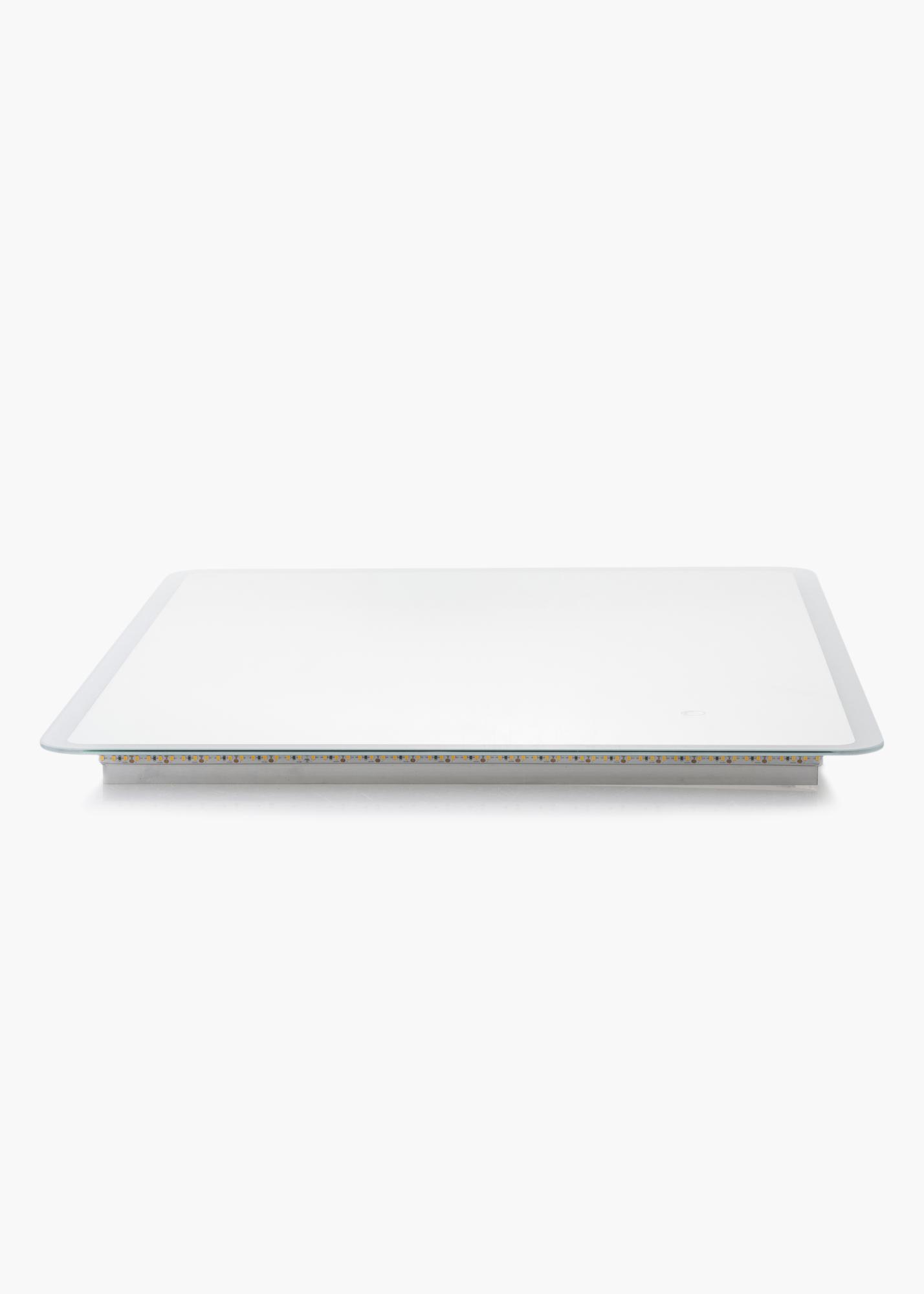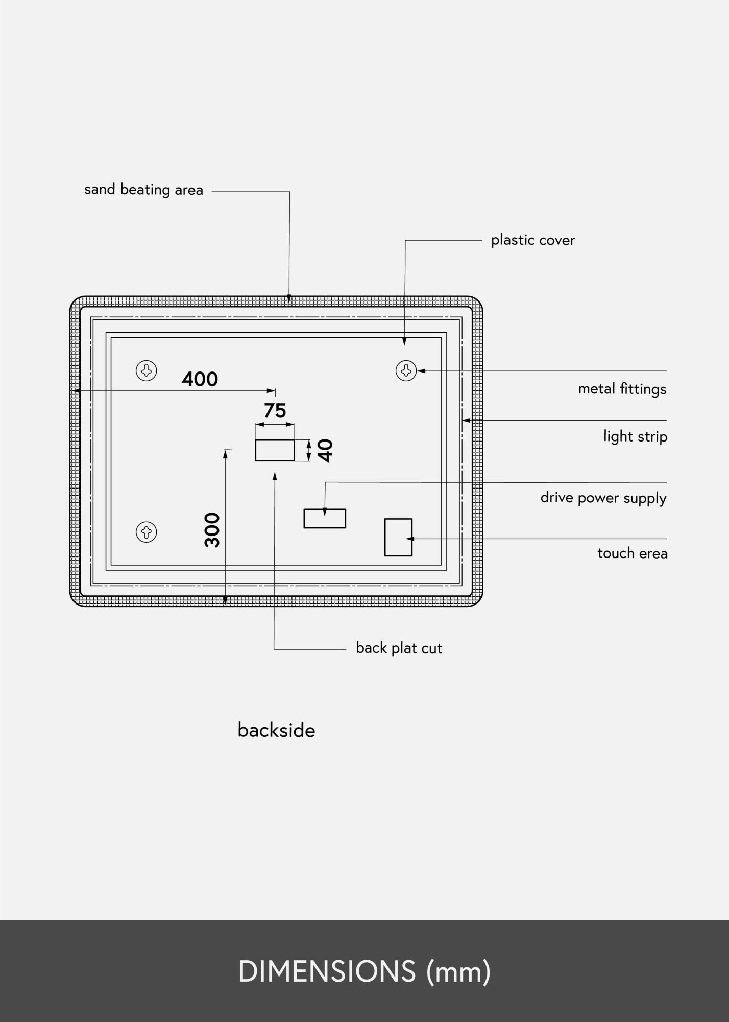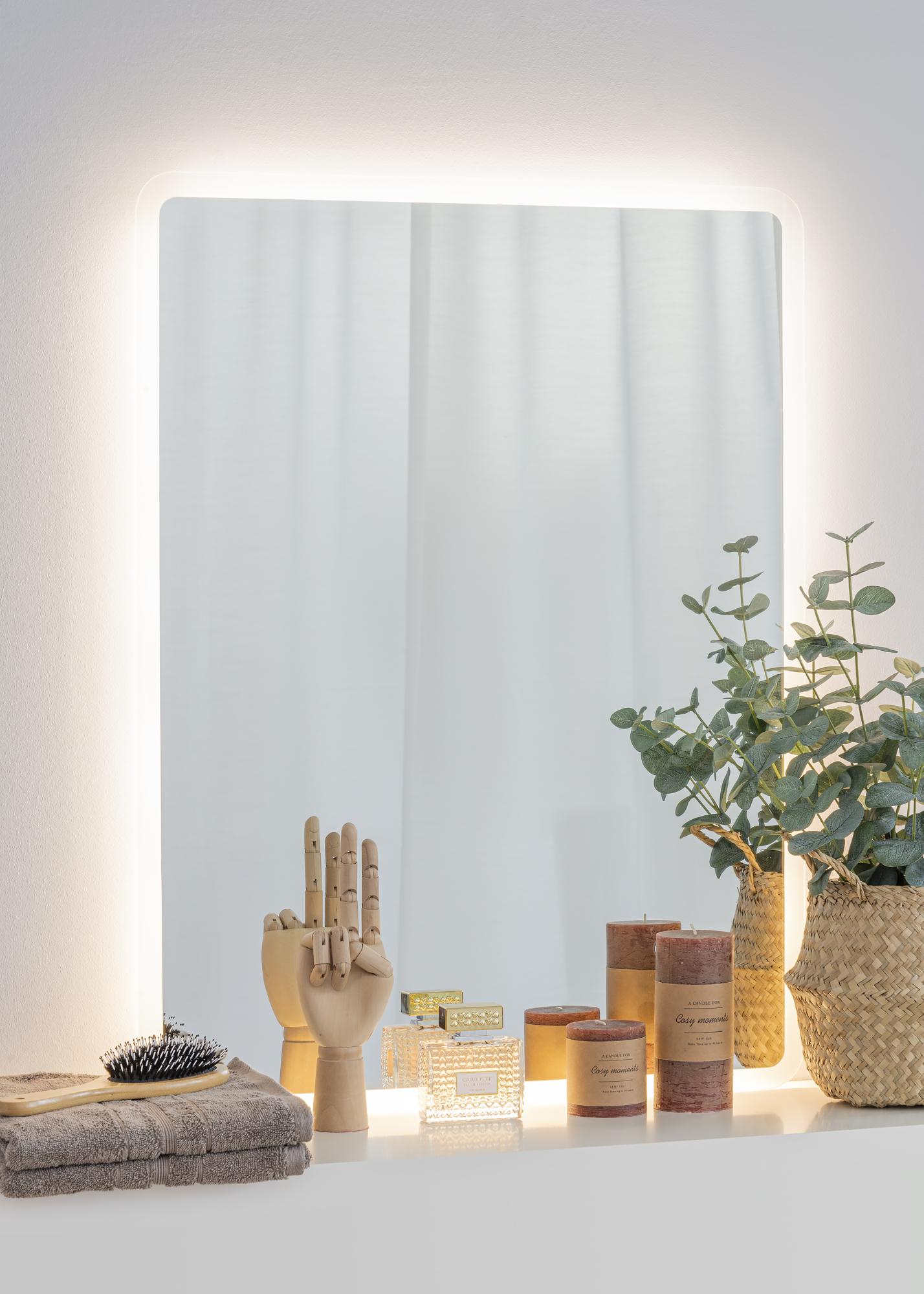 Denna badrumsspegel i tidlös design har en rektangulär form och mjuka kanter med rundade hörn. Längs med kanten går en integrerad LED belysning som snyggt ramar in spegeln. LED belysningen lyser upp bakom spegeln och ger ett fint sken framåt i 3000K som är en varmvit nyans. Belysningen är dimbar och du justerar enkelt styrkan genom att hålla in touch-knappen på skärmen i några sekunder. Spegeln kommer ihåg den senaste ljusinställningen nästa gång du tänder belysningen. Spegeln är godkänd för badrum. Badrumsspegeln är avsedd för fast installation och kopplas mot en strömbrytare. För att spegeln ska fungera korrekt ska den kopplas till en vanlig strömbrytare, inte en dimmerströmbrytare.