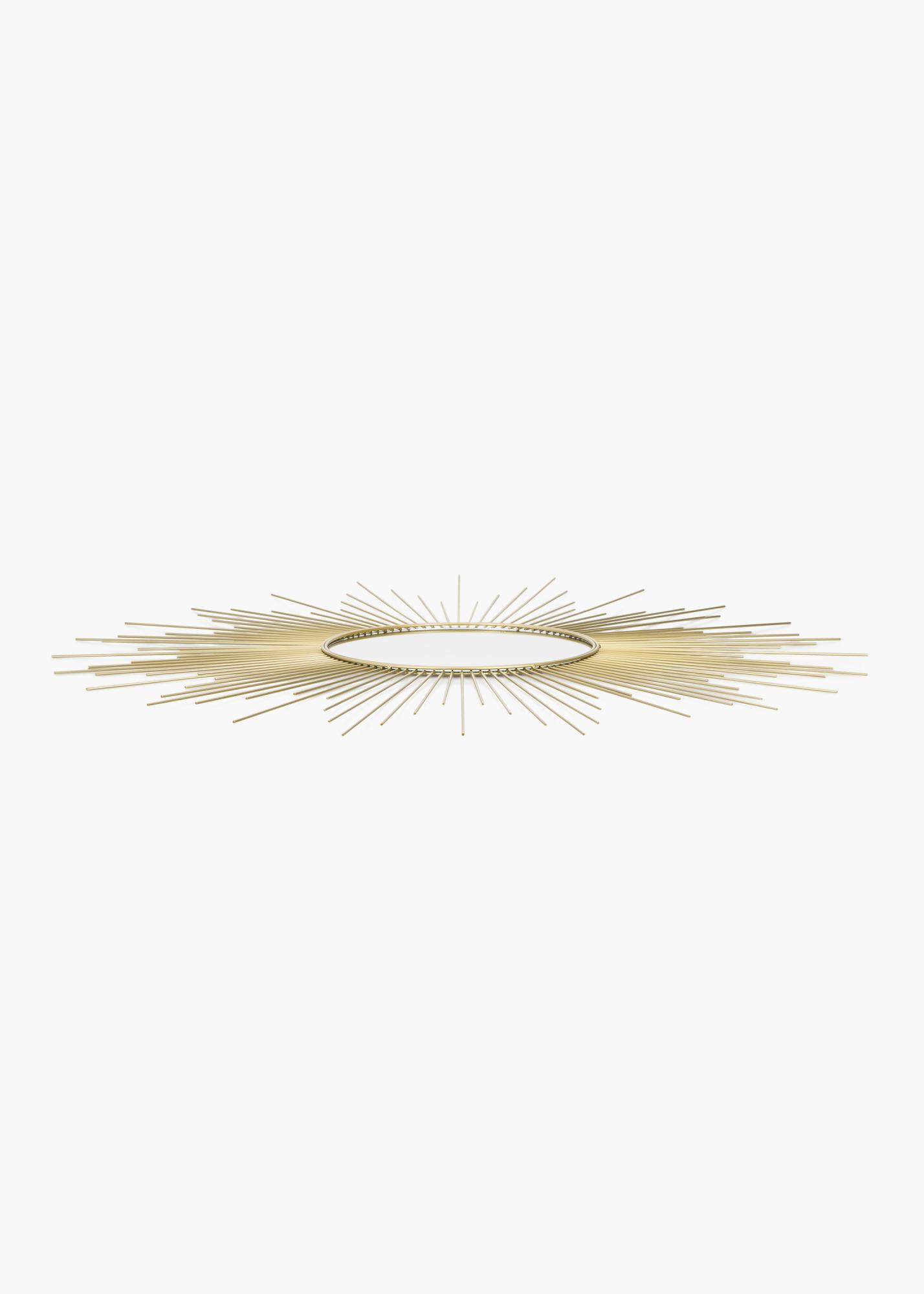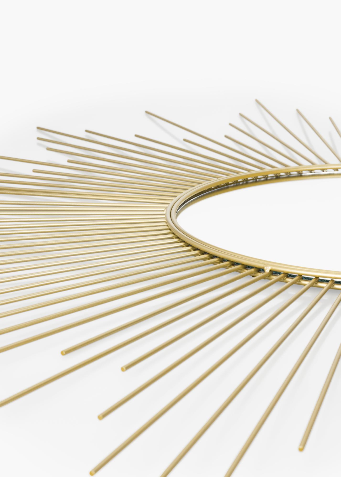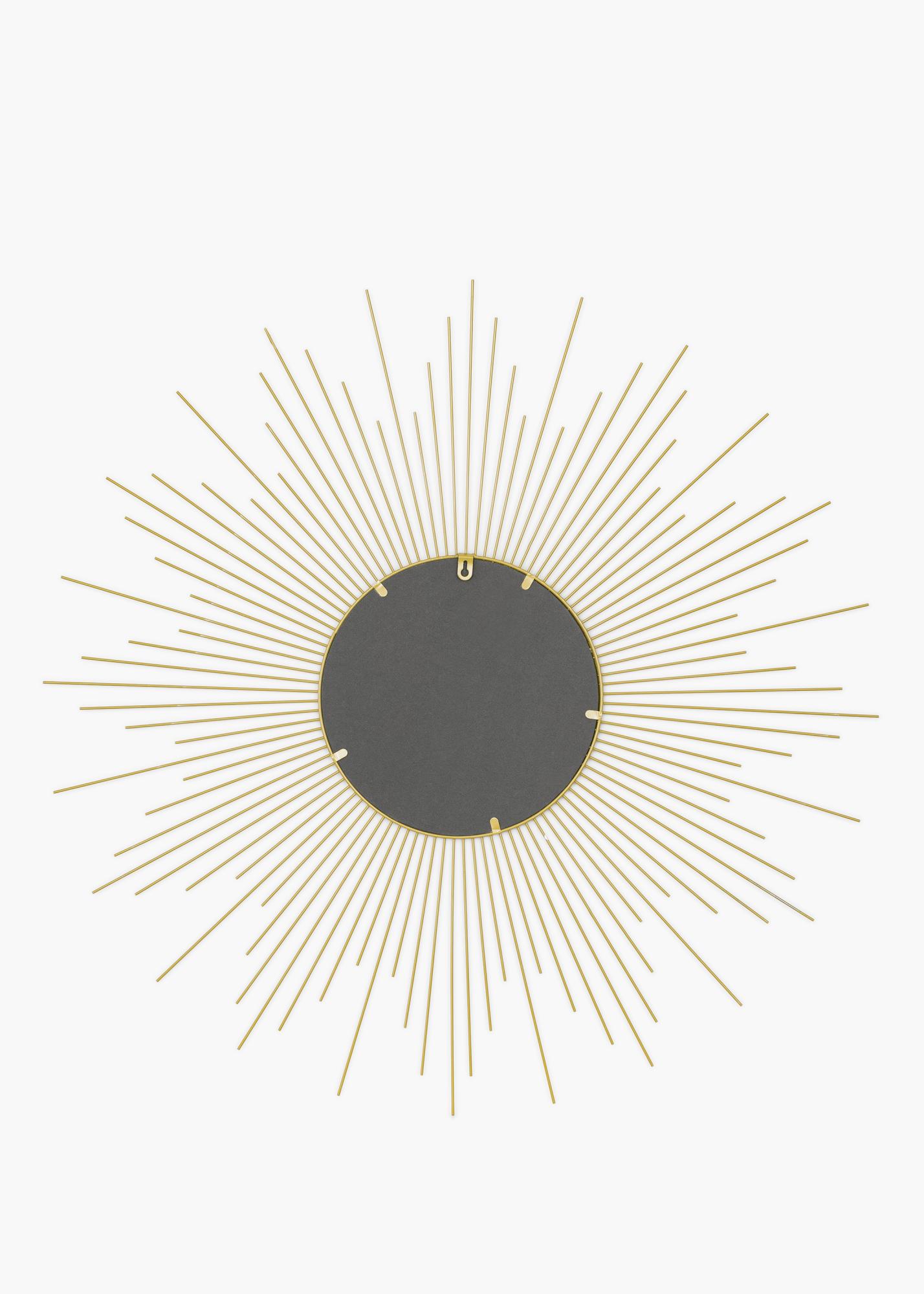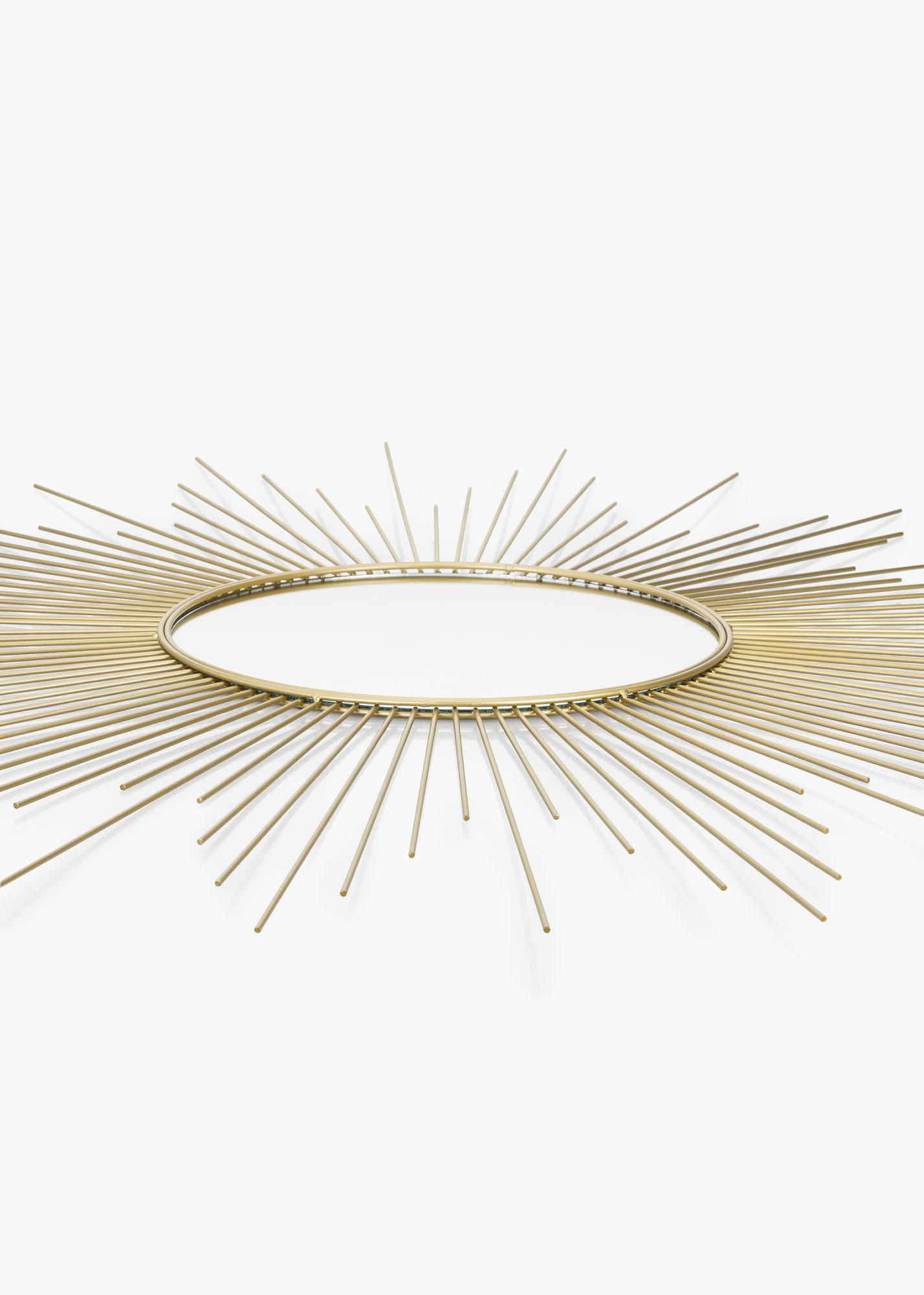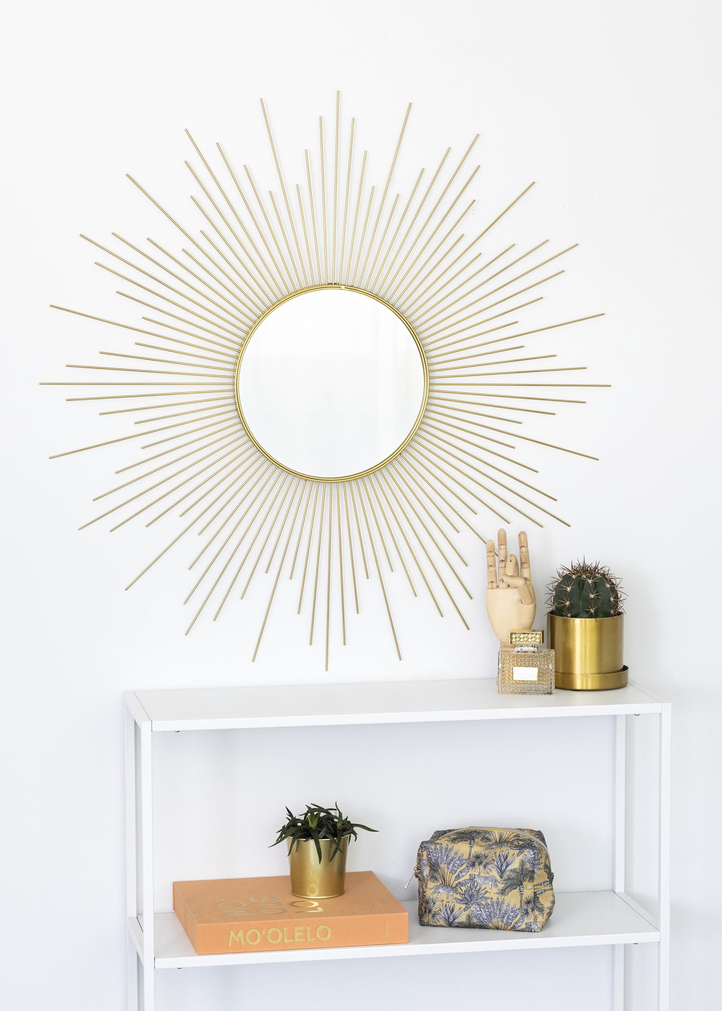 Detta är en rund väggspegel i väldigt dekorativ design. Spegelglaset ramas in av ett mönster som påminner om en stjärna och går i en fin guldig nyans. Placera denna fina spegel i hemmet på en väl vald plats där den får komma till sin dekorativa rätt för att få en iögonfallande inredningsdetalj. Spegeln mäter 90x90 cm i yttermått och är tillverkad i metall.