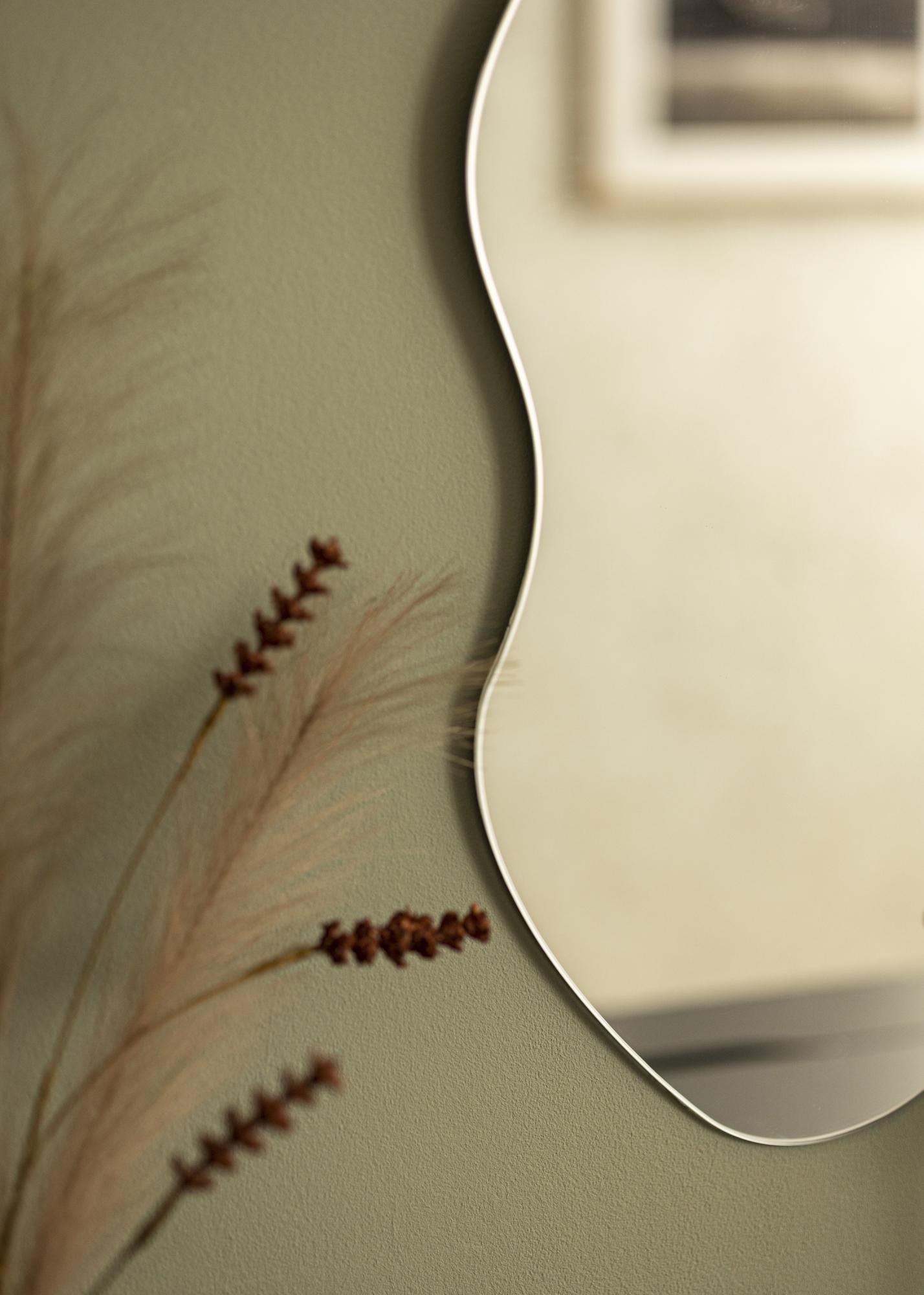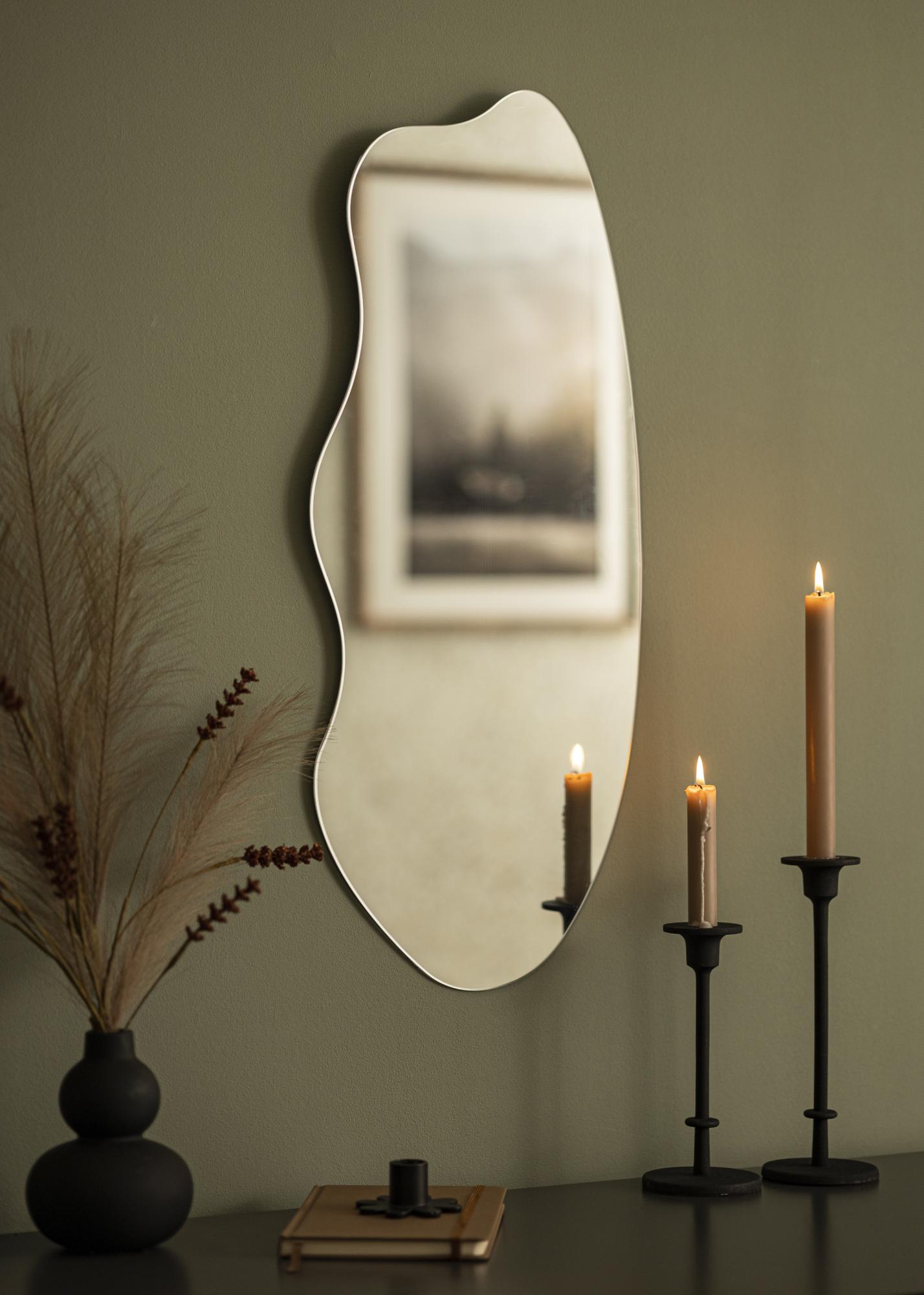 En asymmetrisk väggspegel blir en iögonfallande inredningsdetalj i varje hem. Denna spegel har en unik form, där ena långsidan är rundad och den andra har en vågig form. Tillsammans bildar det en spännande och elegant helhet. Spegeln passar lika bra i hallen som i vardagsrummet och den fungerar även som en trendig badrumsspegel.