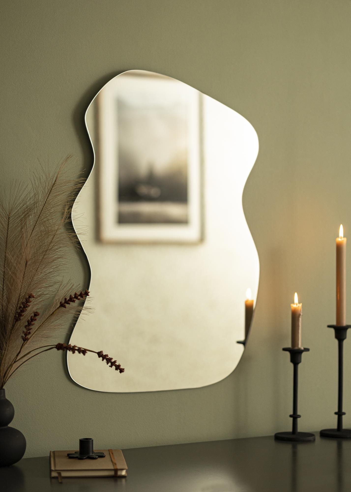 Detta är en utmärkt väggspegel för dig som letar efter den perfekta kombinationen av klassisk elegans och modernitet. Den lätt vågiga formen ger spegeln ett unikt och trendigt utseende, samtidigt som avsaknaden av ram ger en extra touch av elegans.