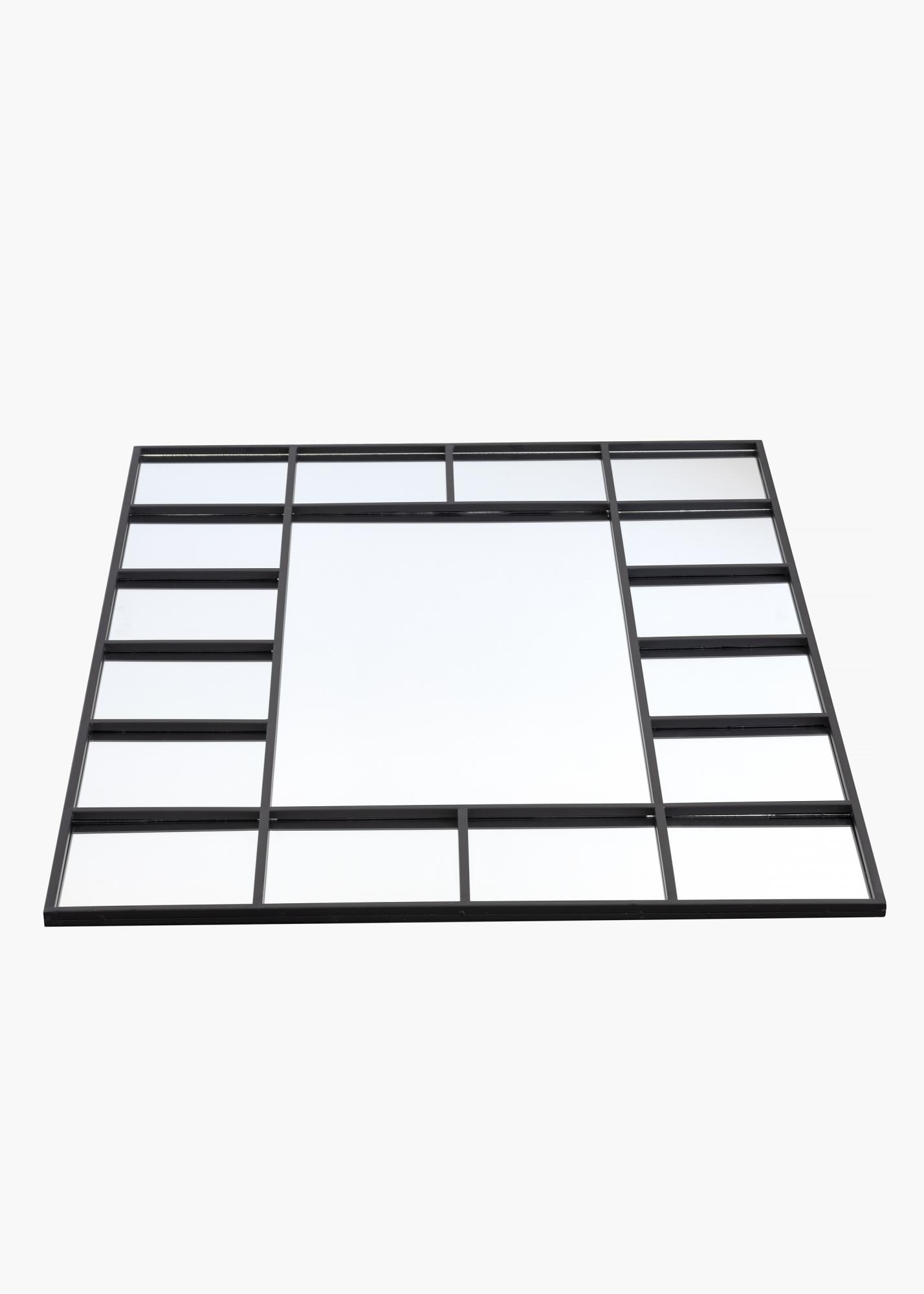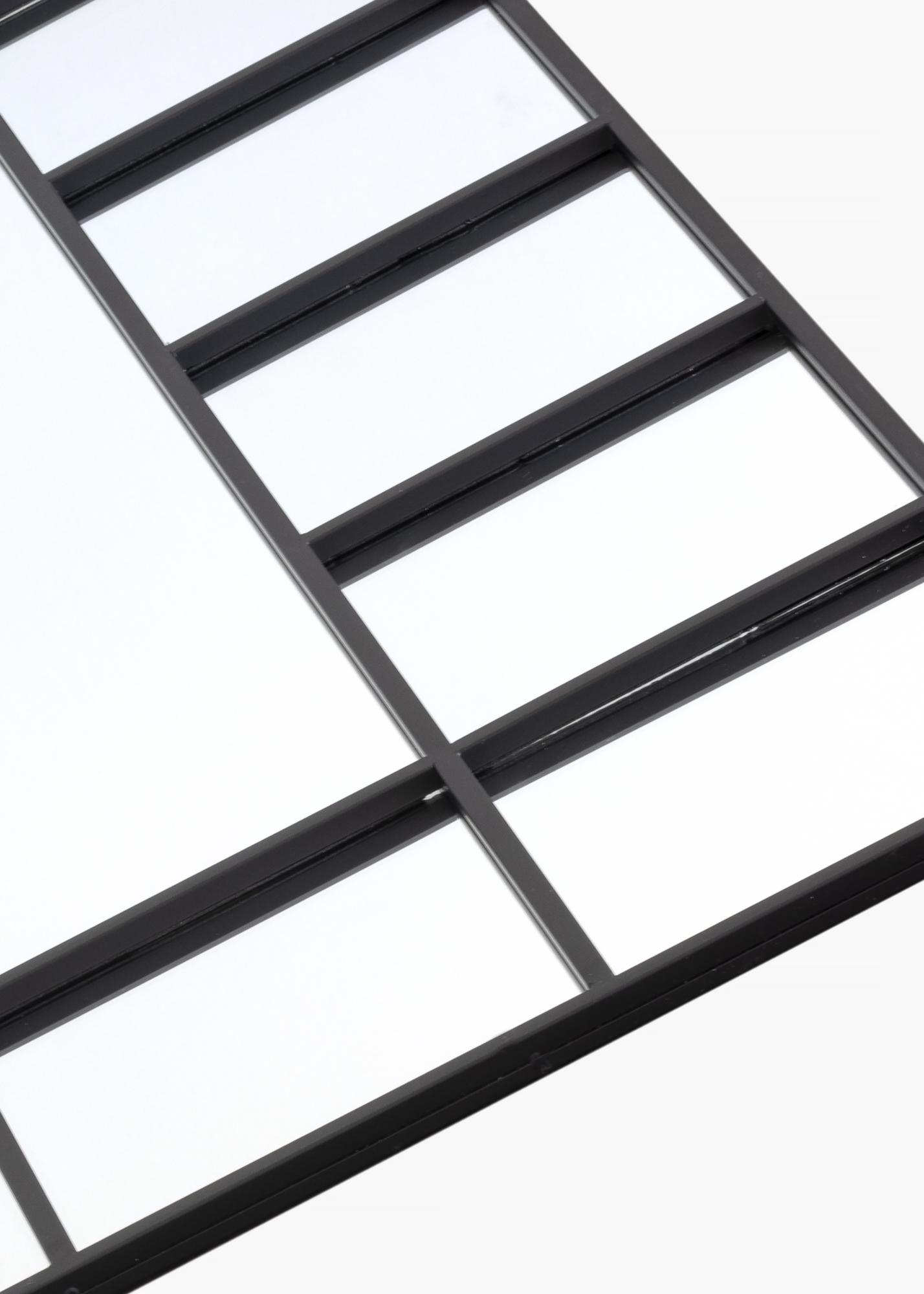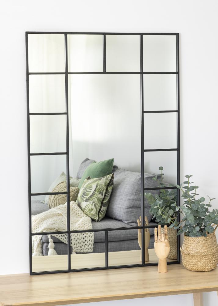 Denna snygga spegel från KAILA har en design som påminner om ett fint fönster. I spegeln är det flera olika rutor som snyggt ramar in en större spegelyta i mitten. Rutorna ramas snyggt in av svarta tunna linjer i metall som ger spegeln en lite industriell men samtidigt elegant karaktär. Väggfäste för montering på väggen finns, men spegeln kan även lutas snyggt mot väggen. Spegeln mäter 80x120 cm.